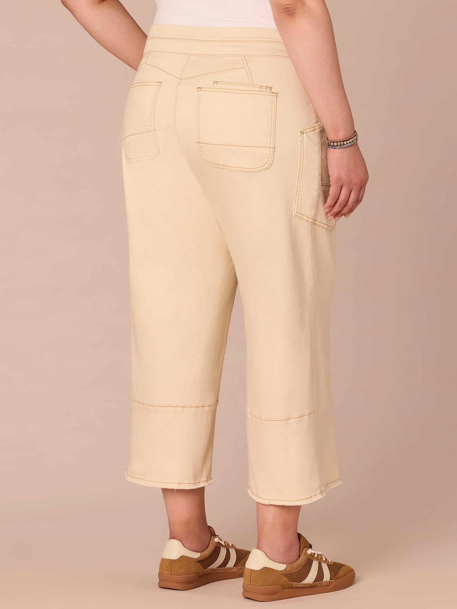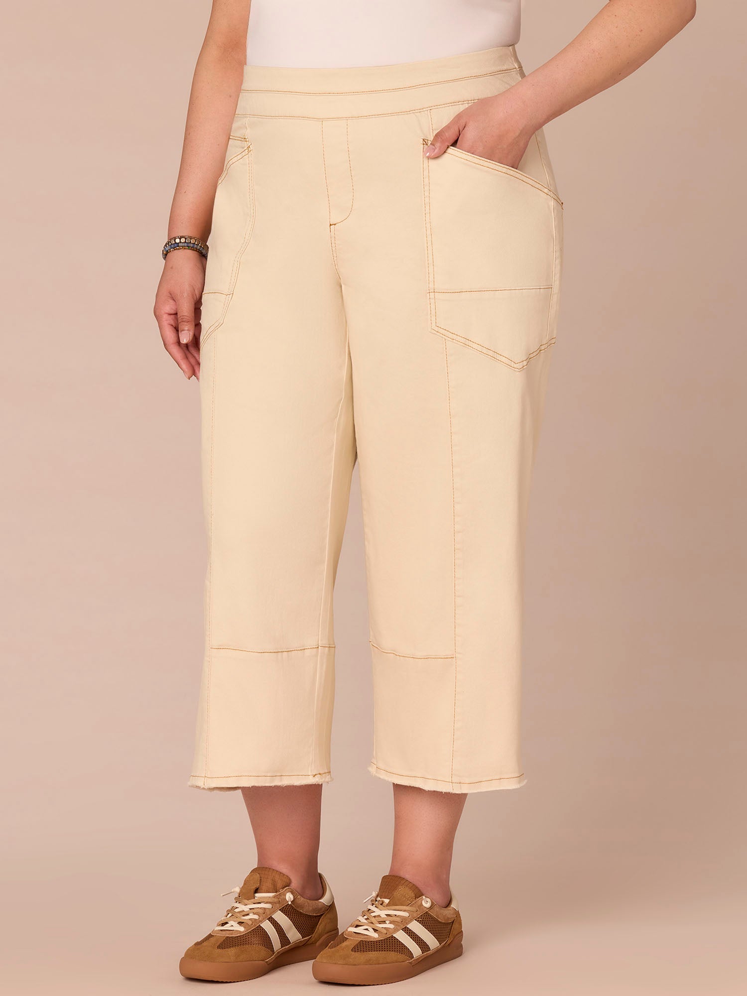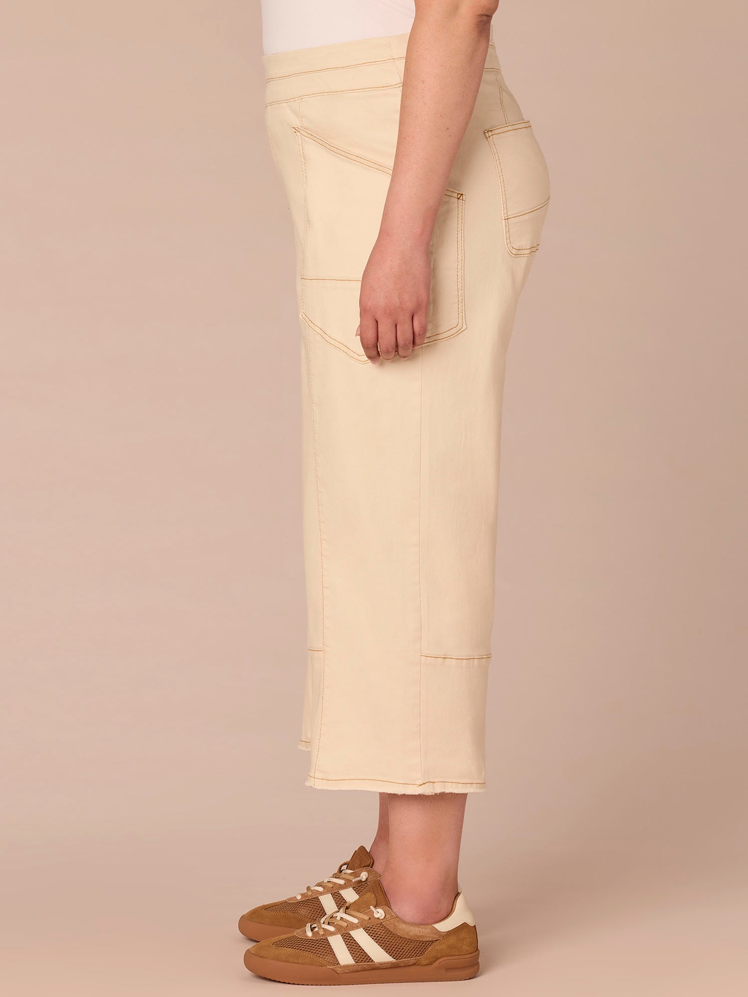 This cropped "Ab"solution® Wide Leg Glider in plus sizing is fitted through the hips with a relaxed, wide opening through the legs and an elastic pull-on waist. Engineered with a V-yoke, clean finish fray hem, and our signature fit technology to smooth, support, and enhance your shape—giving you everything from a flatter tummy to a perkier rear view.