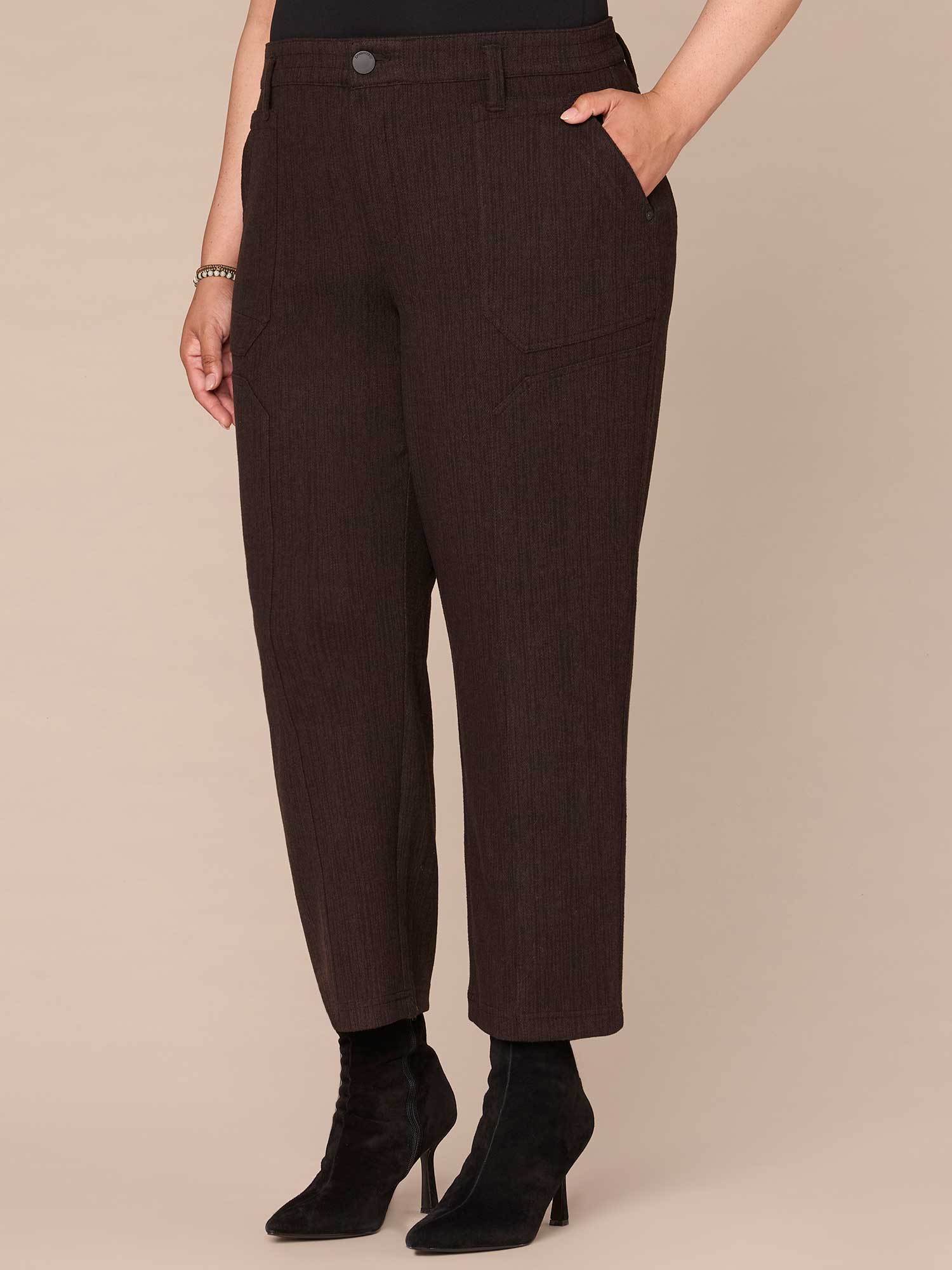 These plus-size Tapered Utility pants feature a relaxed fit through the hips and an easy, straight leg through the thigh with a tapered hem. They’re made with a skyrise waist, dart seams, patched panels, and "Ab"solution® fit technology to smooth, support, and enhance your shape.