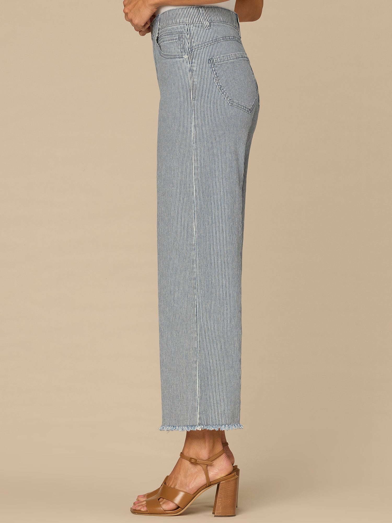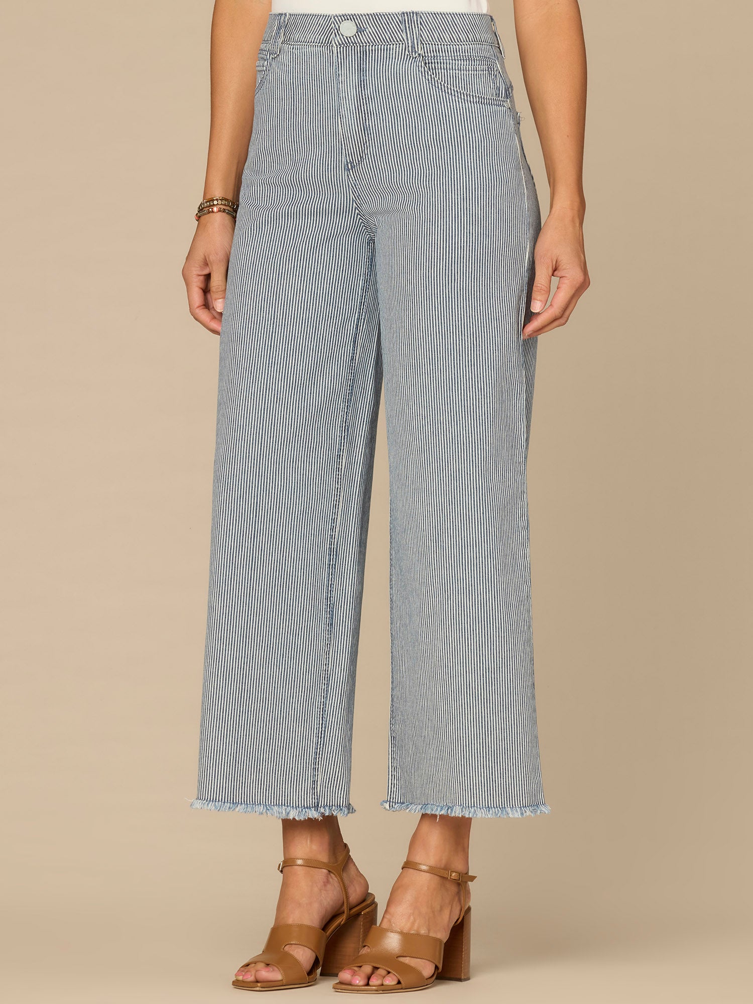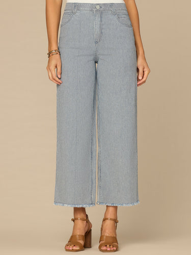 The striped Wide Leg Boyfriend jean in petite sizing is fitted through the hips with a relaxed, slightly slouchy silhouette and wide opening through the legs. Engineered with a round up yoke and "Ab"solution® fit technology to smooth, support, and enhance your shape—giving you everything from a flatter tummy to a perkier rear view.