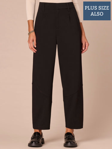 The black Balloon Barrel Leg in plus sizing is slightly fitted at the hips, with a relaxed, rounded fit from the thighs to the slightly tapered hemline. Engineered with "Ab"solution® fit technology to smooth, support, and enhance your shape—as well as a round up yoke, pleating, and forward seams.