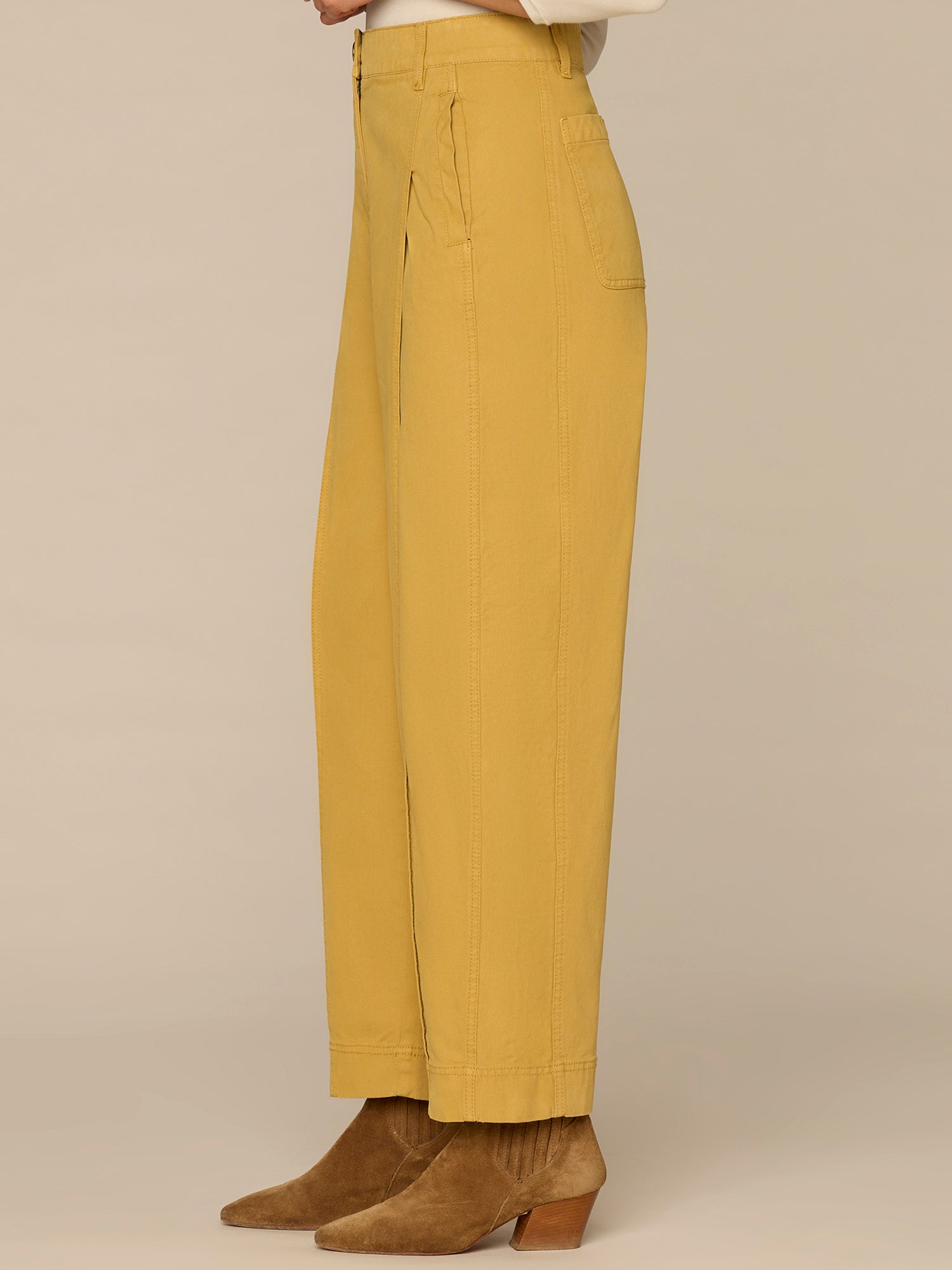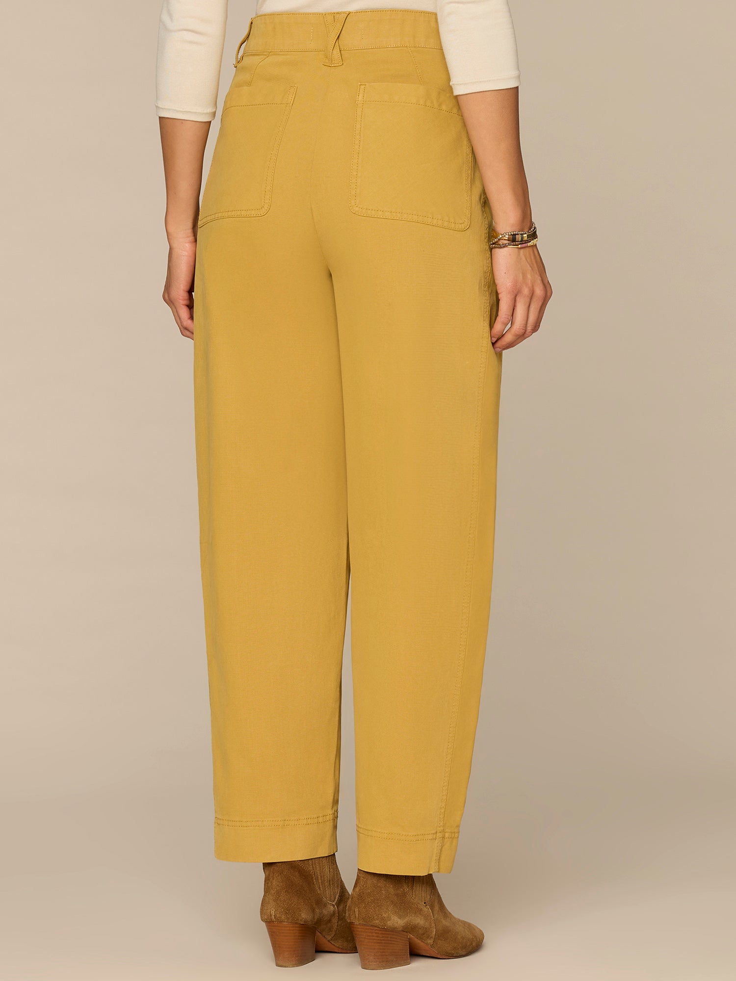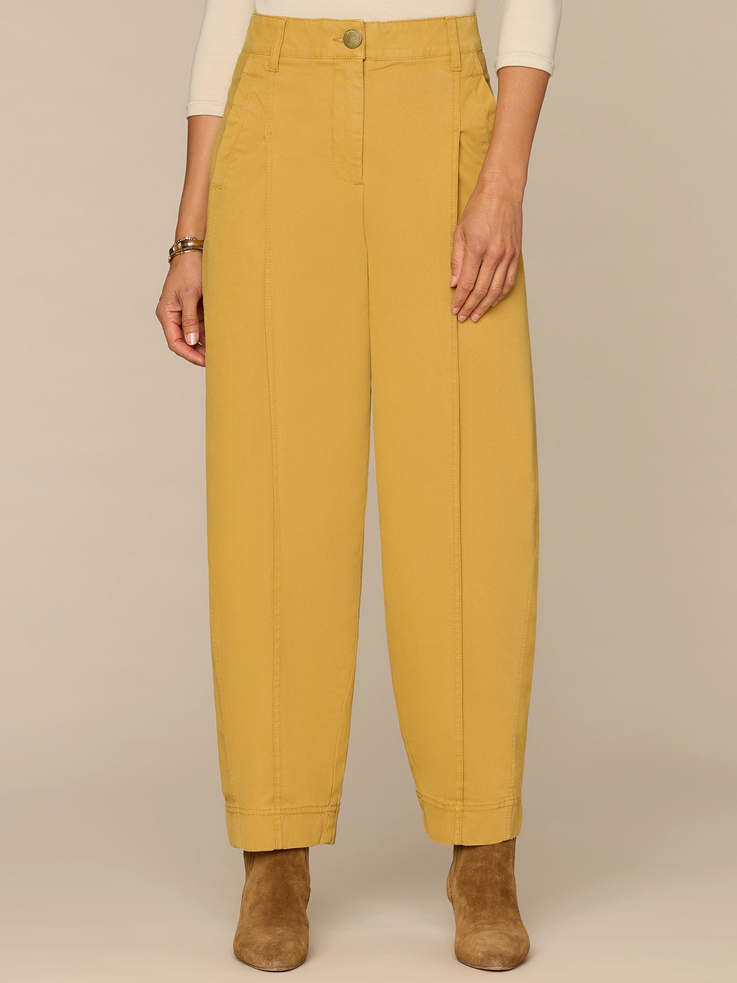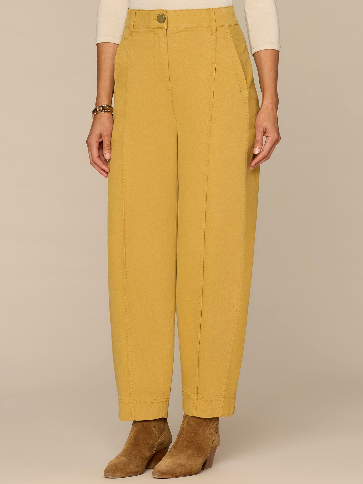 The pleated, relaxed Barrel Leg trouser in petite sizing is slightly fitted at the hips, with a looser, relaxed fit from the thighs to the hemline. Engineered with "Ab"solution® fit technology to smooth, support, and enhance your shape—giving you everything from a flatter tummy to a perkier rear view.