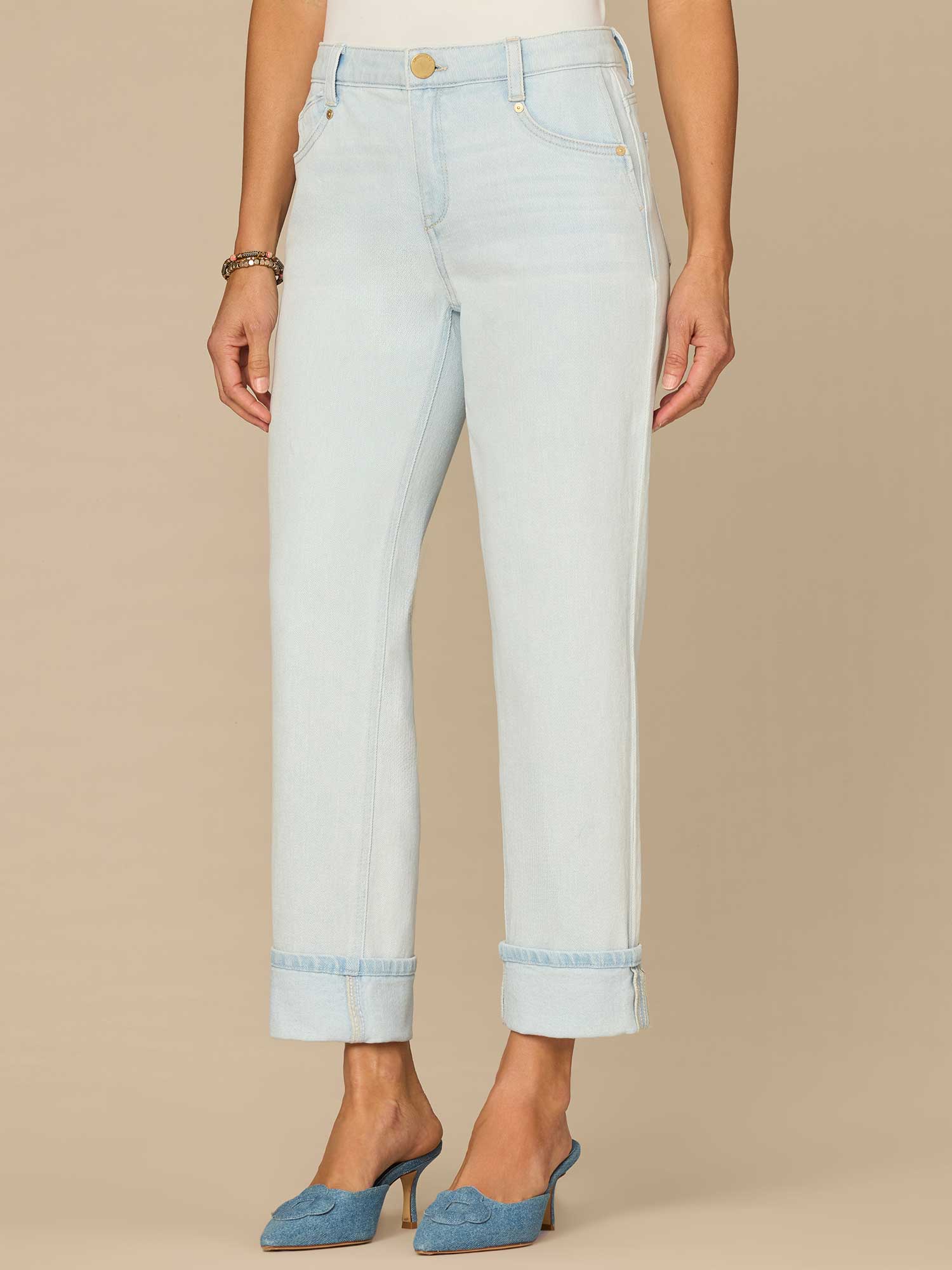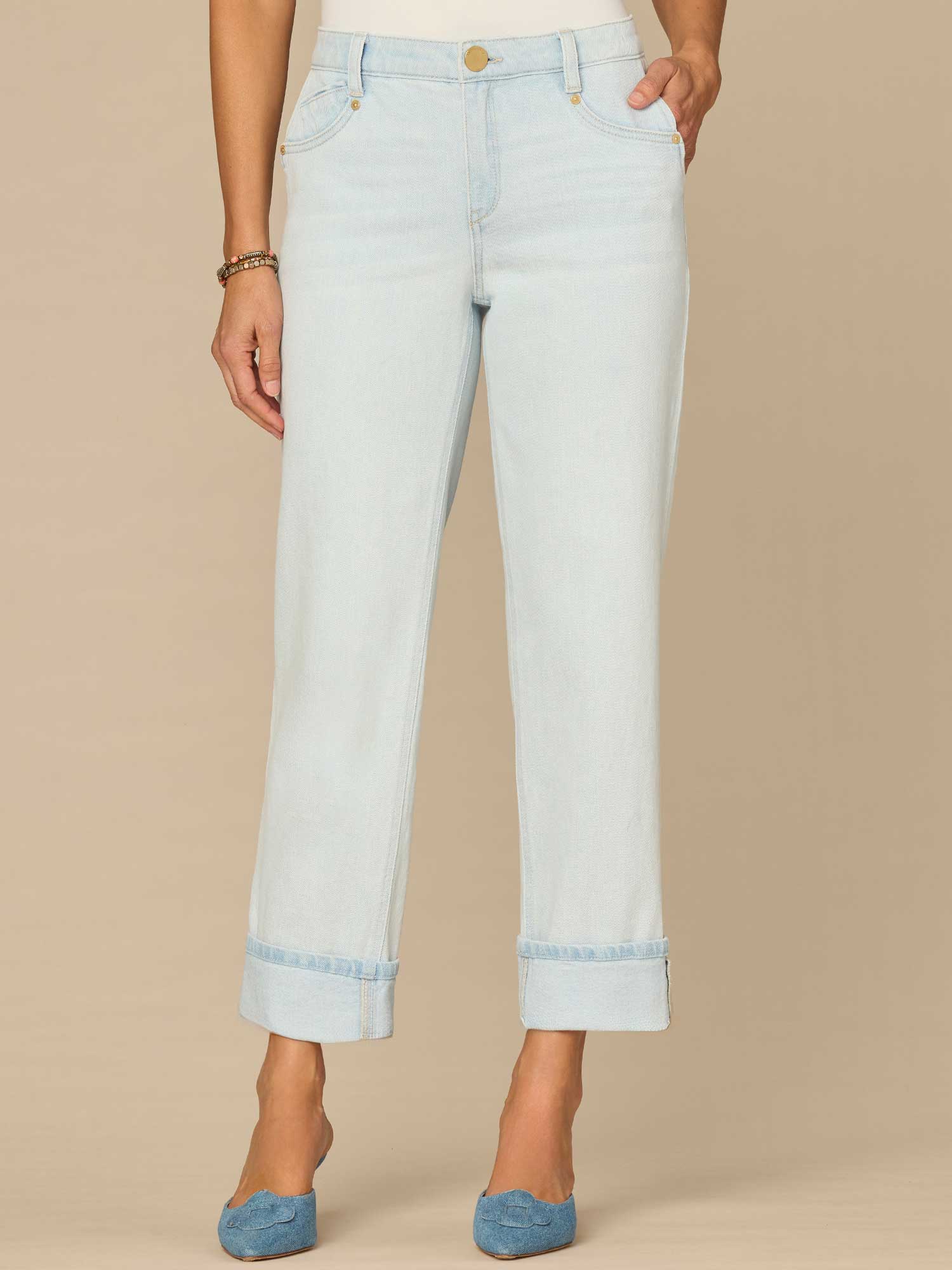 Our “Ab”solution® Boyfriend jean is fitted through the hips with a more relaxed (think slightly slouchy) fit from the mid-thigh to the leg opening. Wear them cuffed or unrolled for an even more relaxed look. Engineered with side entry pockets and our signature fit technology to smooth, support, and enhance your shape—giving you everything from a flatter tummy to a perkier rear view.