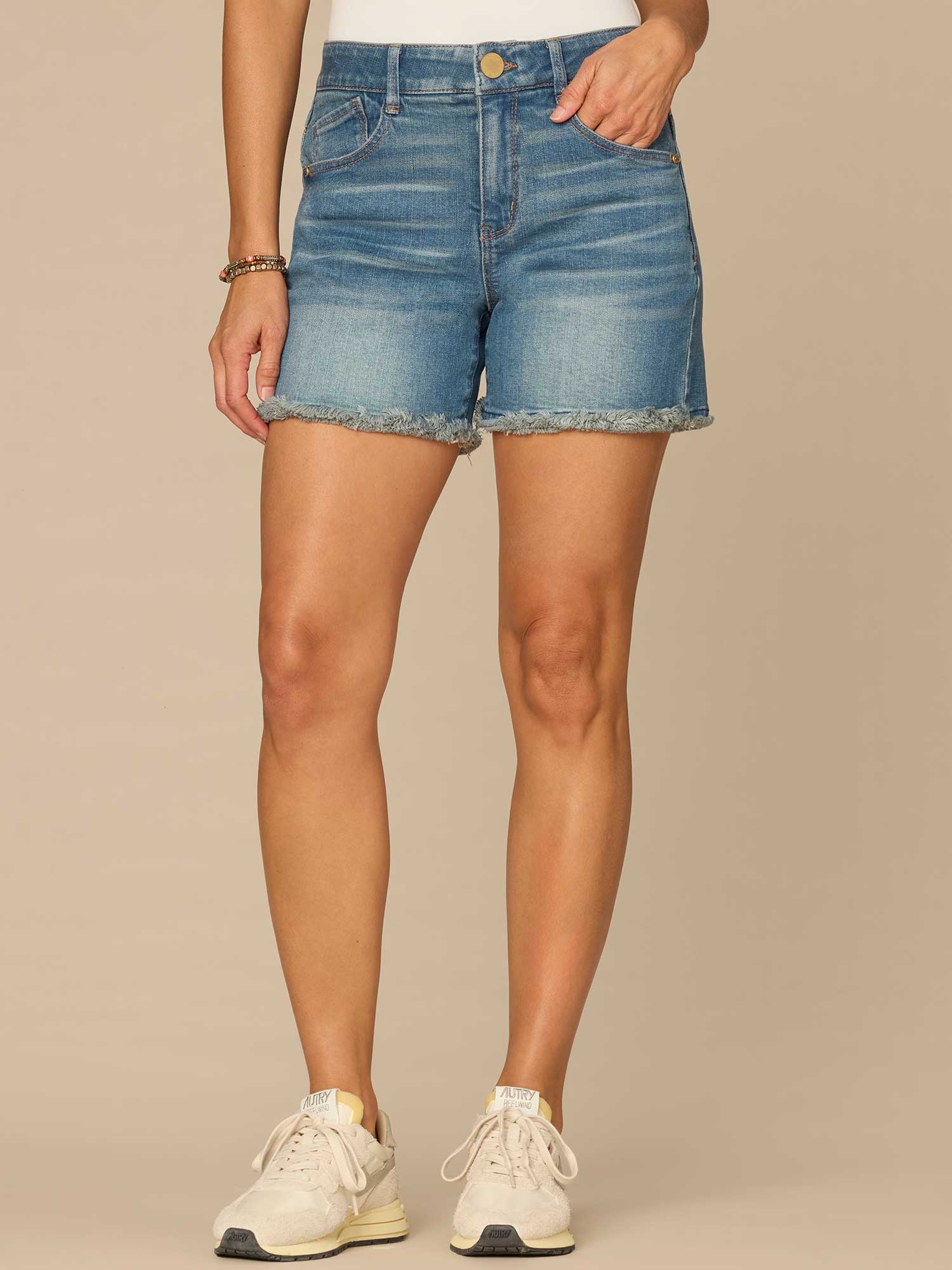 These shorts are fitted at the hips with an easy, relaxed leg opening. Engineered with embroidery on the back pocket, a clean finish fray hem, and "Ab"solution® fit technology to smooth, support, and enhance your shape—giving you everything from a flatter tummy to a perkier rear view.