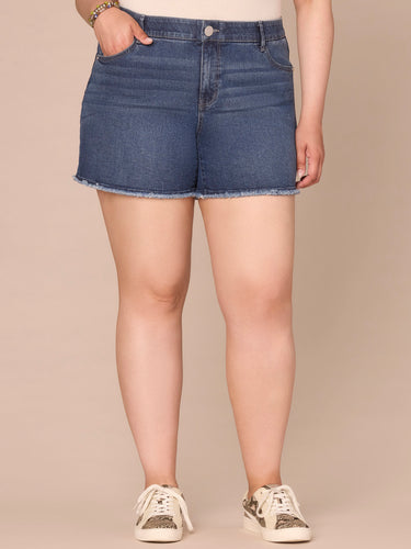 These high rise “Ab”solution® shorts in plus sizing know how to work detail into your warm-weather wardrobe seamlessly. Perfect for weekend wear, they have a timeless blue wash, embroidered cascading “D” back pockets, and a clean finish fray hem for a touch of edge.