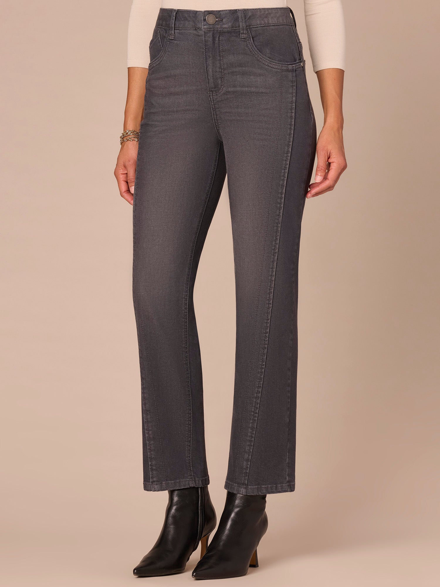 These grey "Ab"solution® Ankle Straight Leg in petite sizing is a relaxed, slightly slim straight-leg silhouette with an ankle-length hem. Designed with flattering details, like a front faux lip seam, splicing, a grey wash, and our signature fit technology that smooths, supports, and enhances your shape.