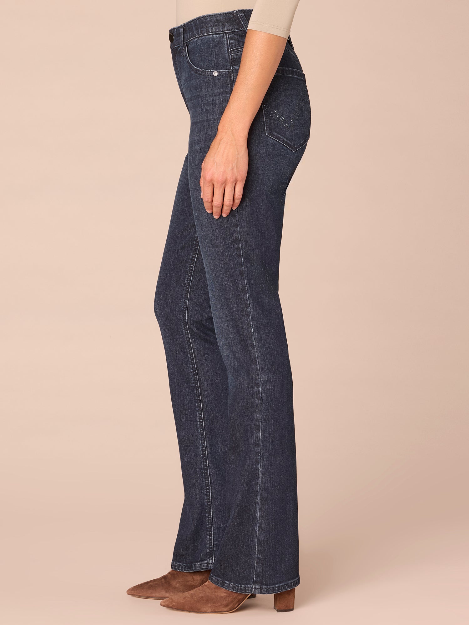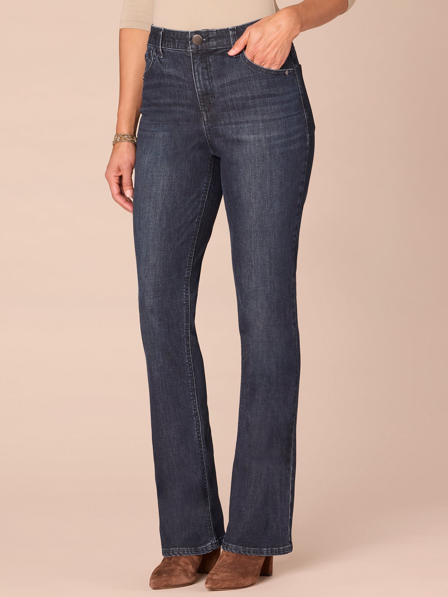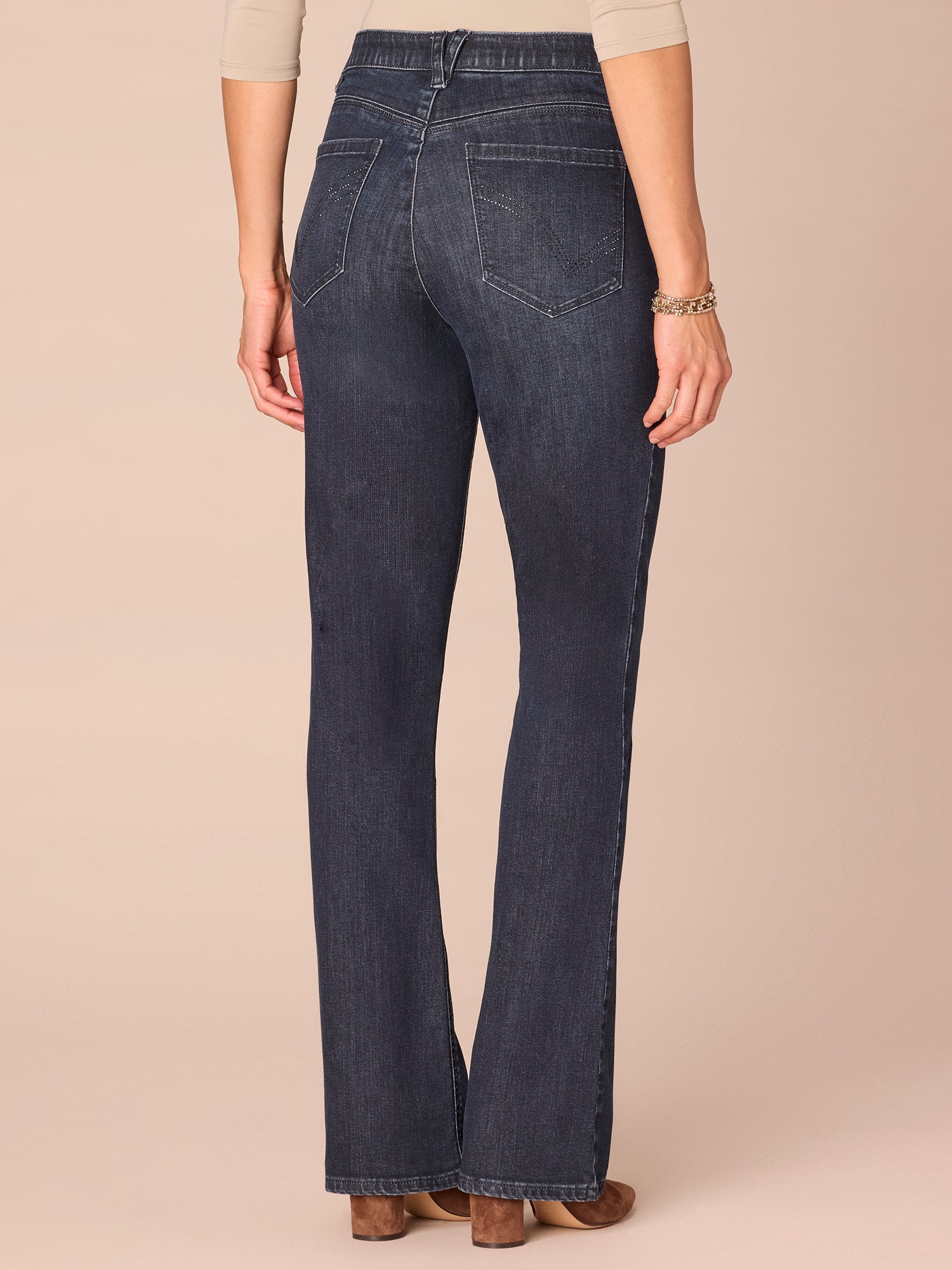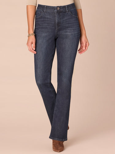 The petite Itty Bitty Bootcut is fitted from the hips to calves, with a baby bootcut leg opening that creates a lengthening effect. These petite-sized jeans have rhinestone-lined cascading “D” back pockets and are engineered with "Ab"solution® fit technology to smooth, support, and enhance your shape—giving you everything from a flatter tummy to a perkier rear view.