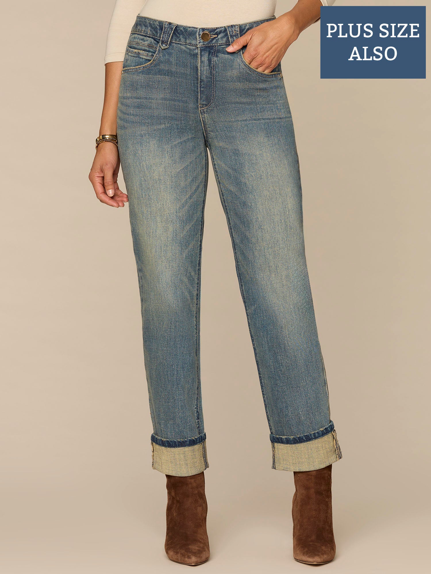 Our "Ab"solution® Boyfriend jean in plus sizing is fitted through the hips with a more relaxed (think slightly slouchy) fit from the mid-thigh to the cuffed leg opening. Wear them cuffed or unrolled for an even more relaxed look. Engineered with "Ab"solution® fit technology to smooth, support, and enhance your shape—giving you everything from a flatter tummy to a perkier rear view.
