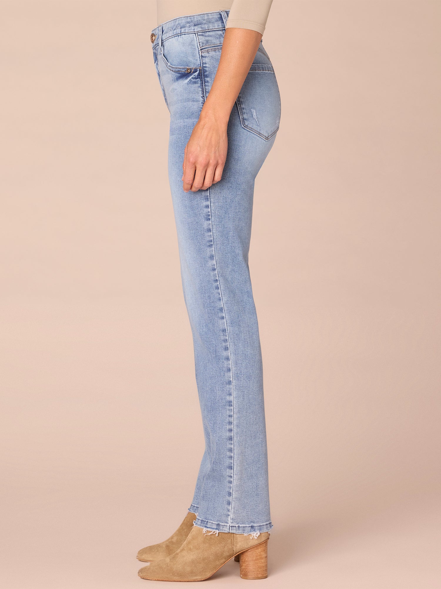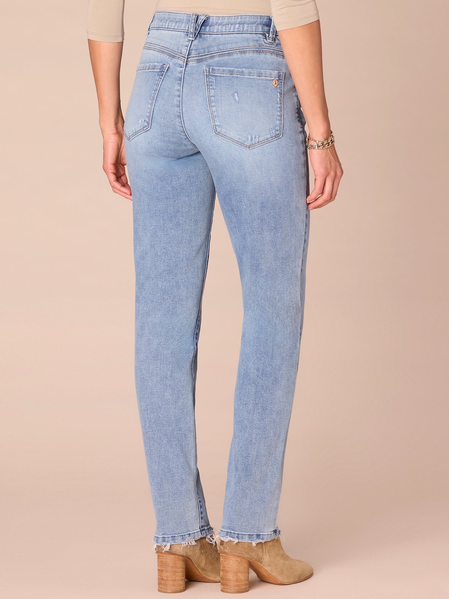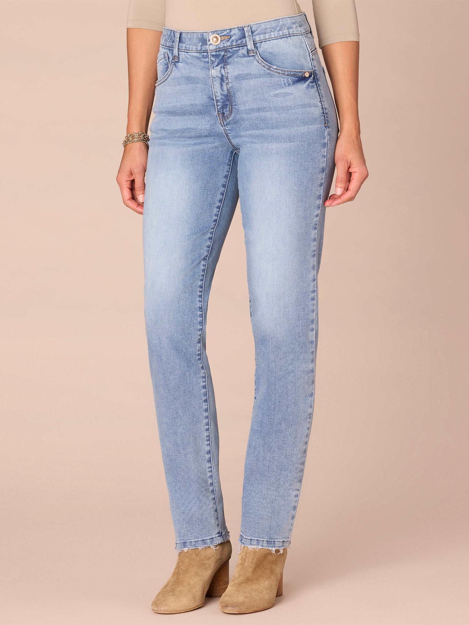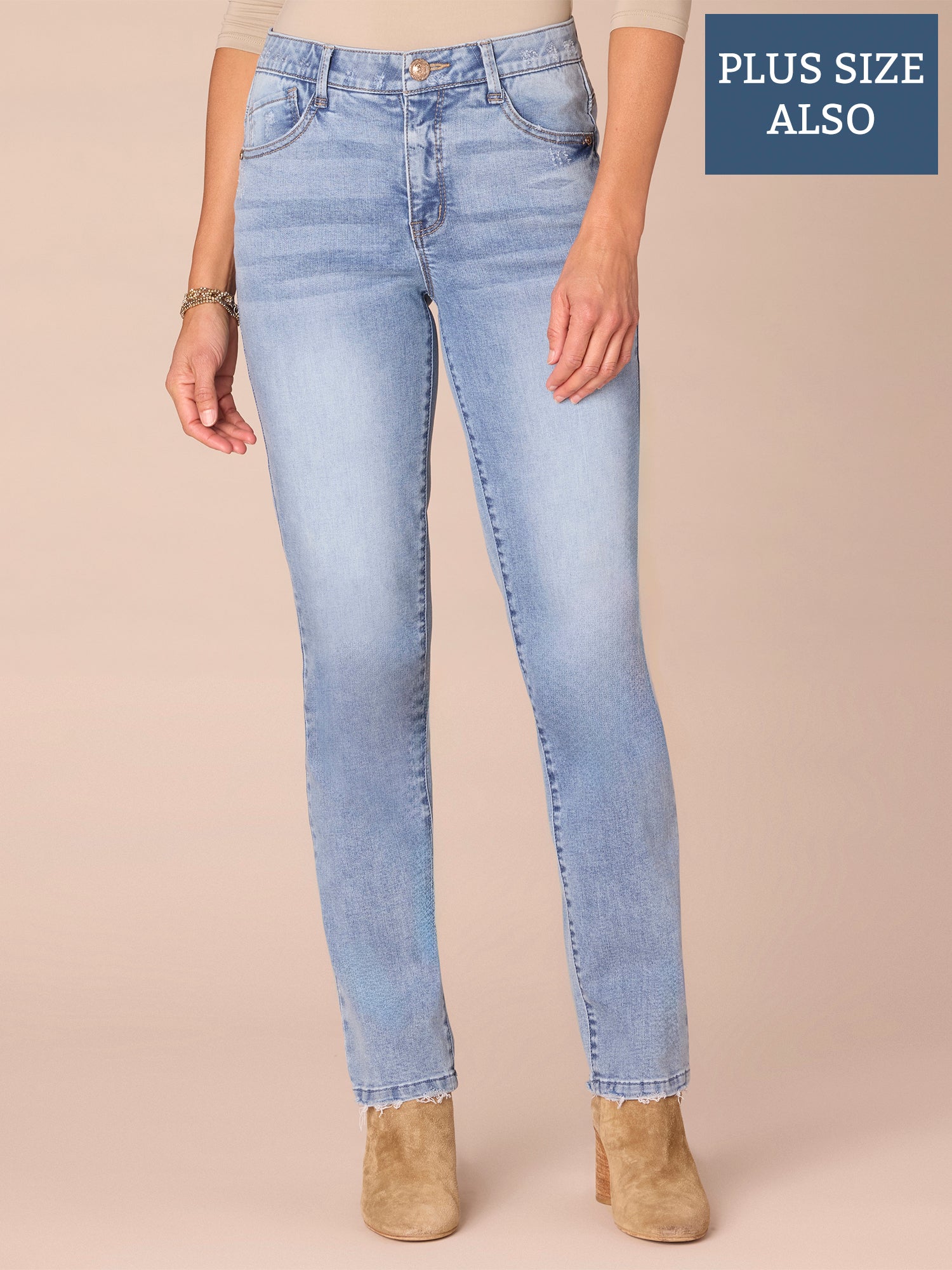 The Straight Leg jean in plus sizing offers a timeless silhouette with a relaxed, slightly slim straight leg that’s easy to wear from day to night. Designed with a light blue vintage wash and "Ab"solution® fit technology to smooth, support, and enhance your shape—giving you everything from a flatter tummy to a perkier rear view.