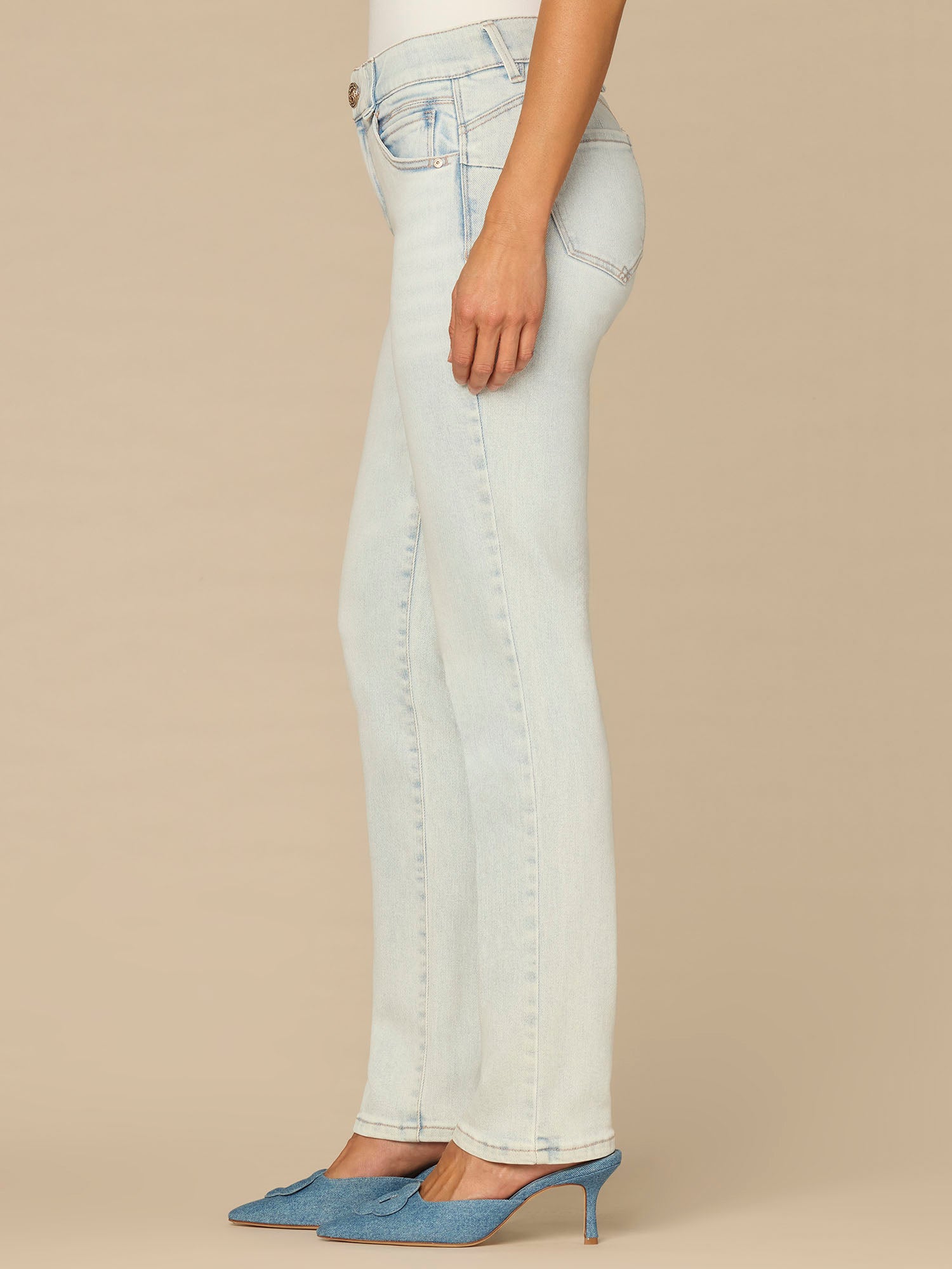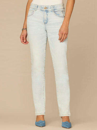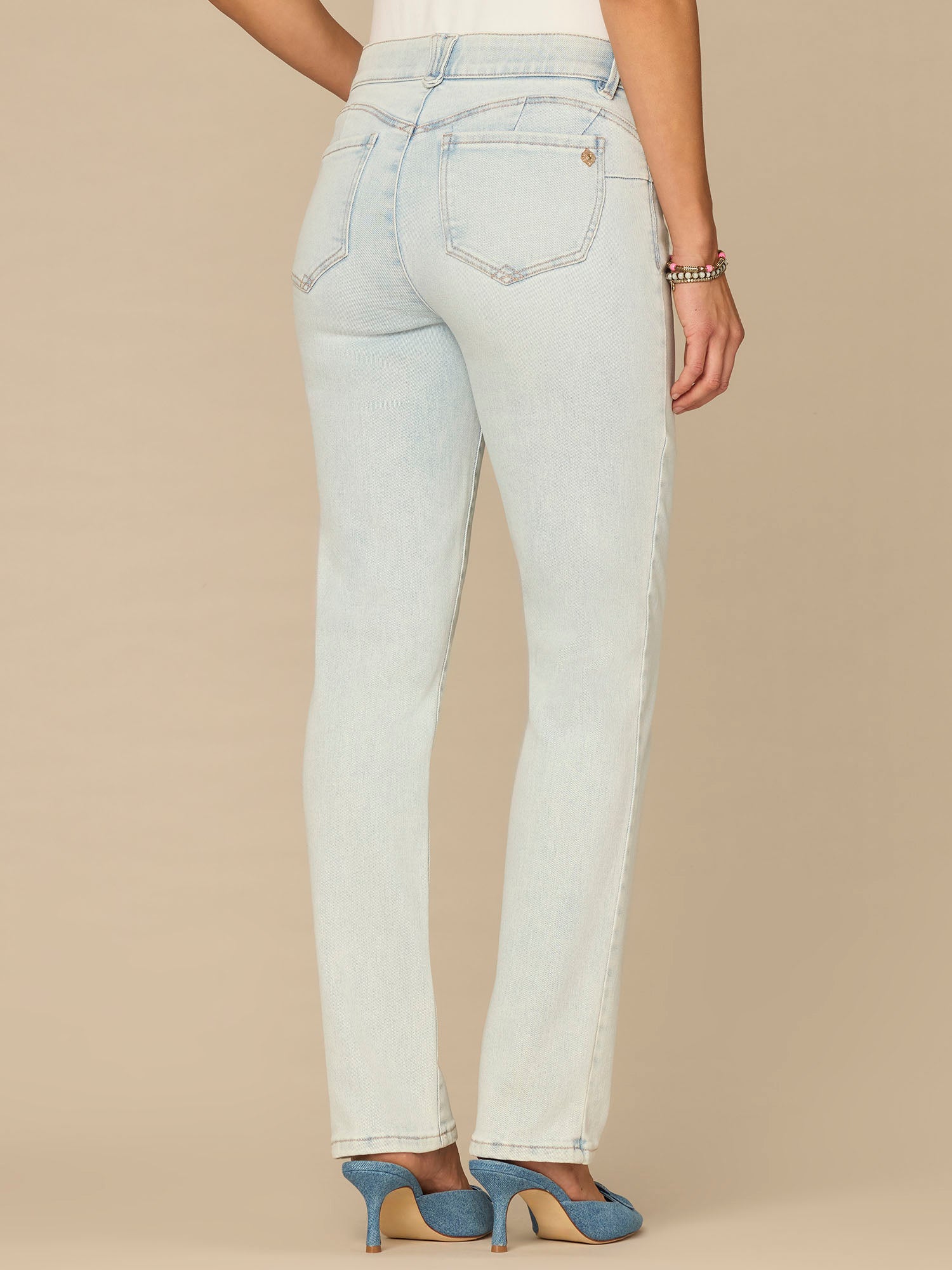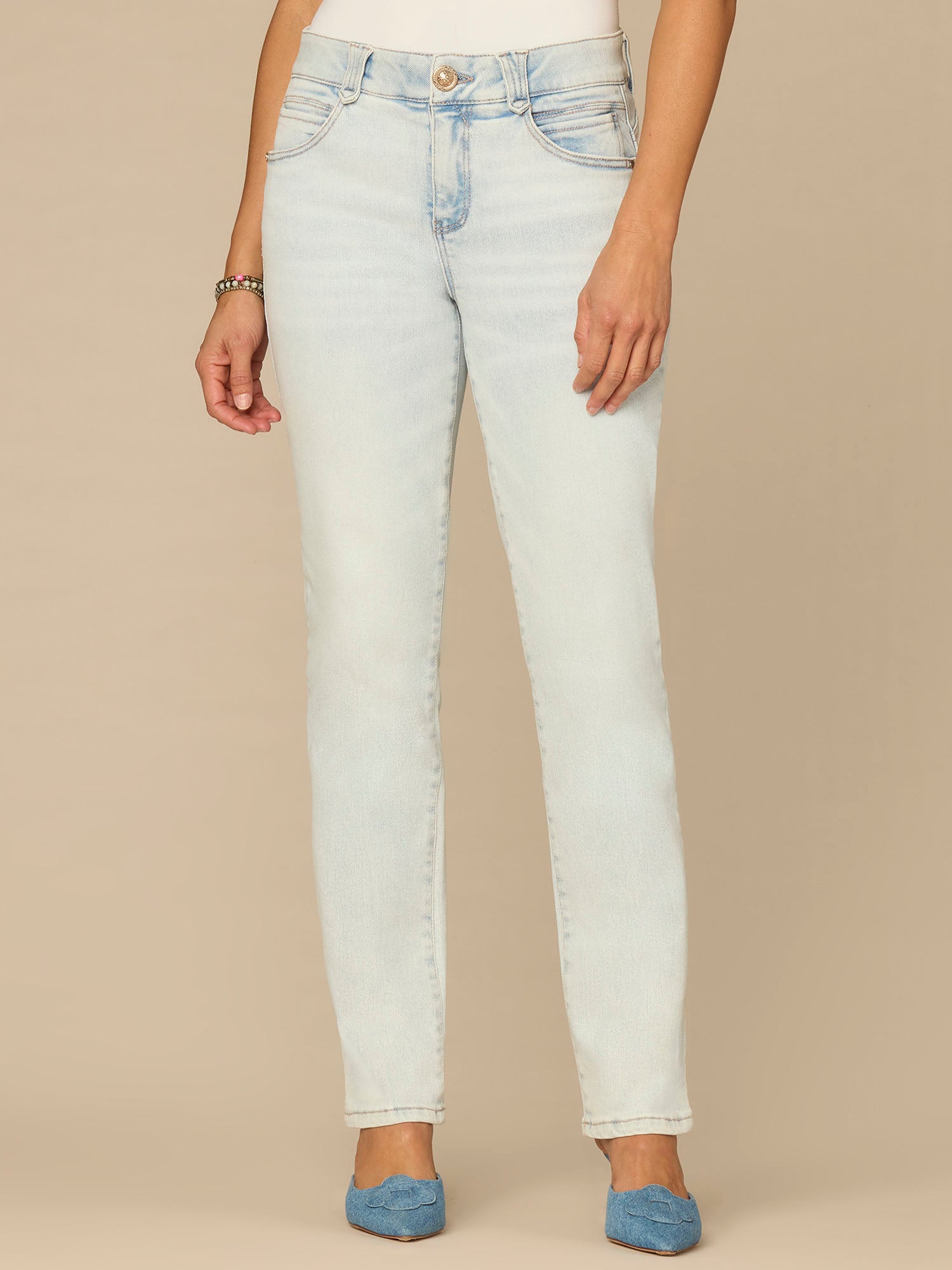 This petite Straight Leg jean in a bleached blue wash offers a timeless silhouette with a relaxed, slightly slim straight leg that’s easy to wear from day to night. Designed with "Ab"solution® fit technology to smooth, support, and enhance your shape—for comfortable support and a flattering, lifted look.