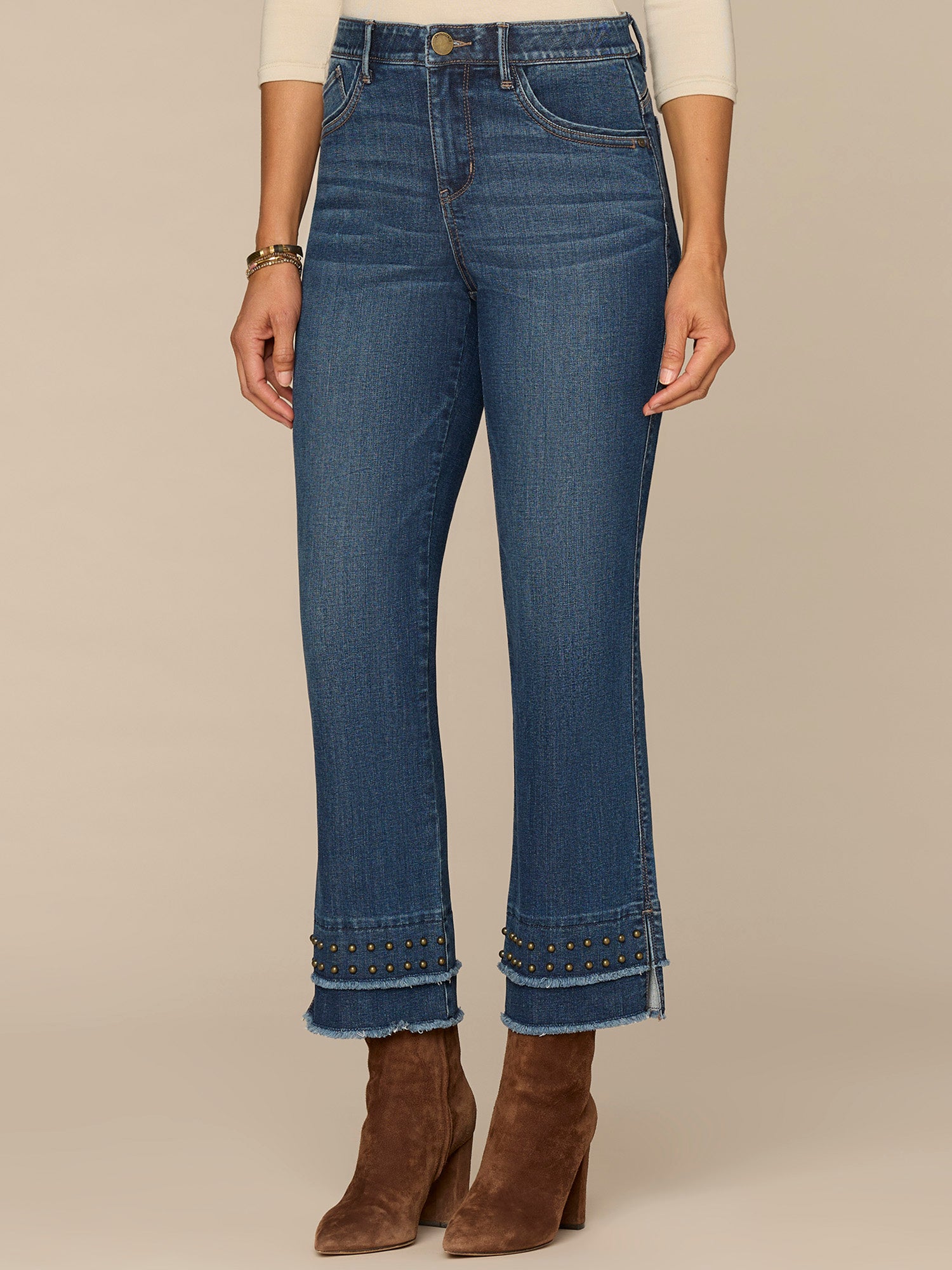 This Kick Flare jean in petite sizing skims your shape and finishes with a subtle flare at the above-ankle hem. Think Itty Bitty Boot, but cropped. Engineered with "Ab"solution® fit technology to smooth, support, and enhance your shape, as well as on-trend details like a double layer fray hem with studs.