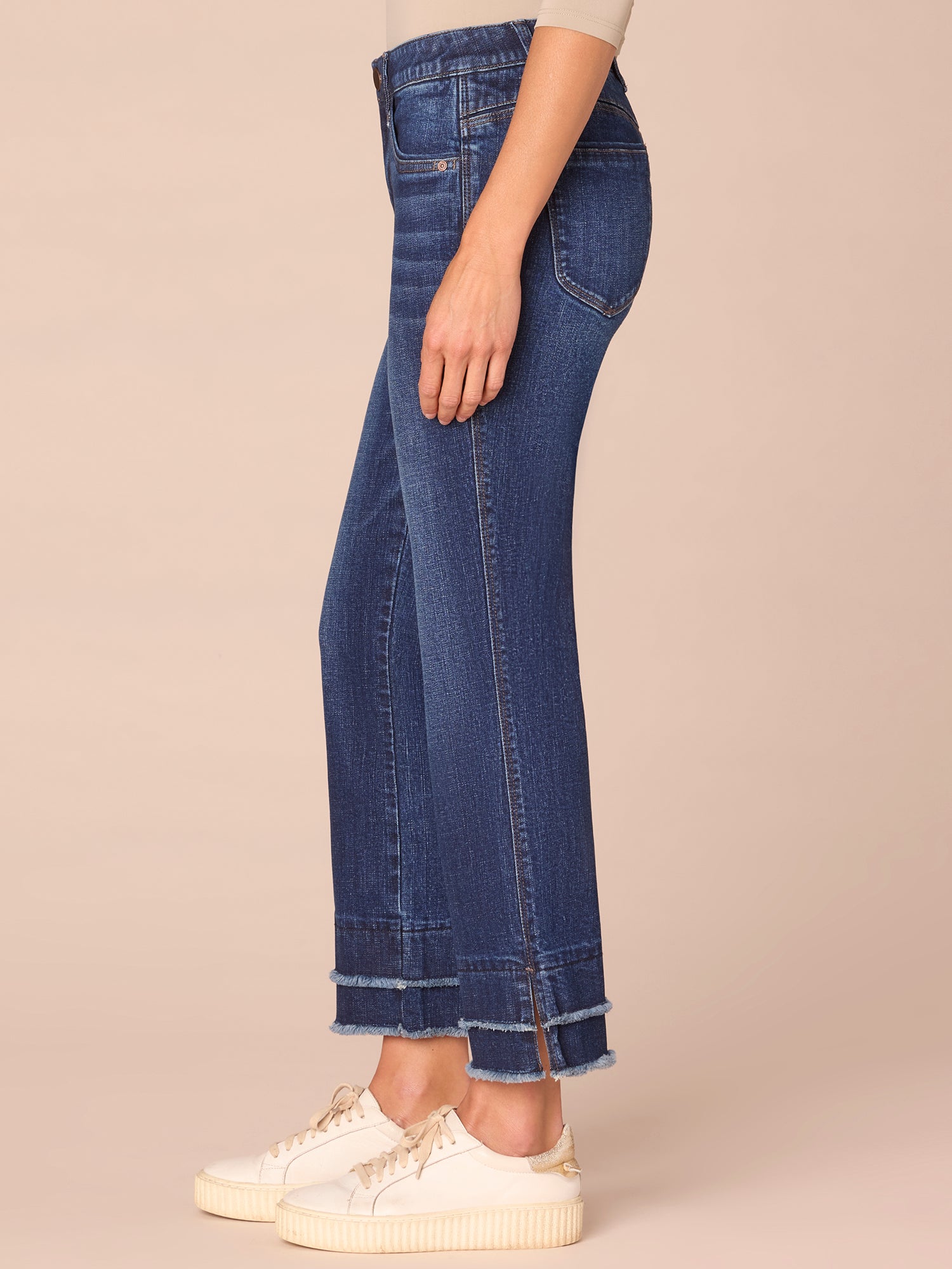 The "Ab"solution® Kick Flare jean in petite sizing skims your shape and finishes with a subtle flare at the above-ankle hem. Think Itty Bitty Boot, but cropped. Made with a double layer fray hem and engineered with our signature fit technology to smooth, support, and enhance your shape—giving you everything from a flatter tummy to a perkier rear view.