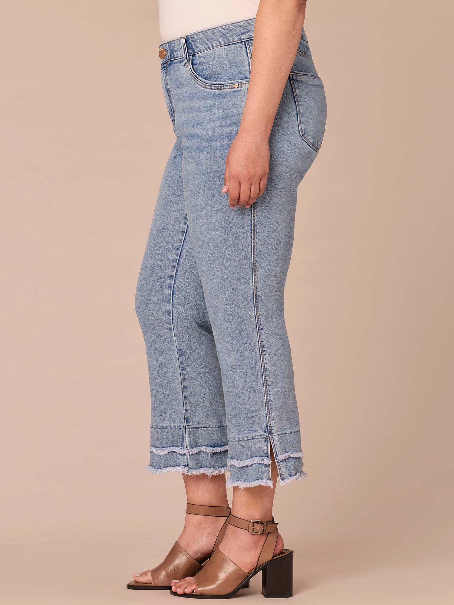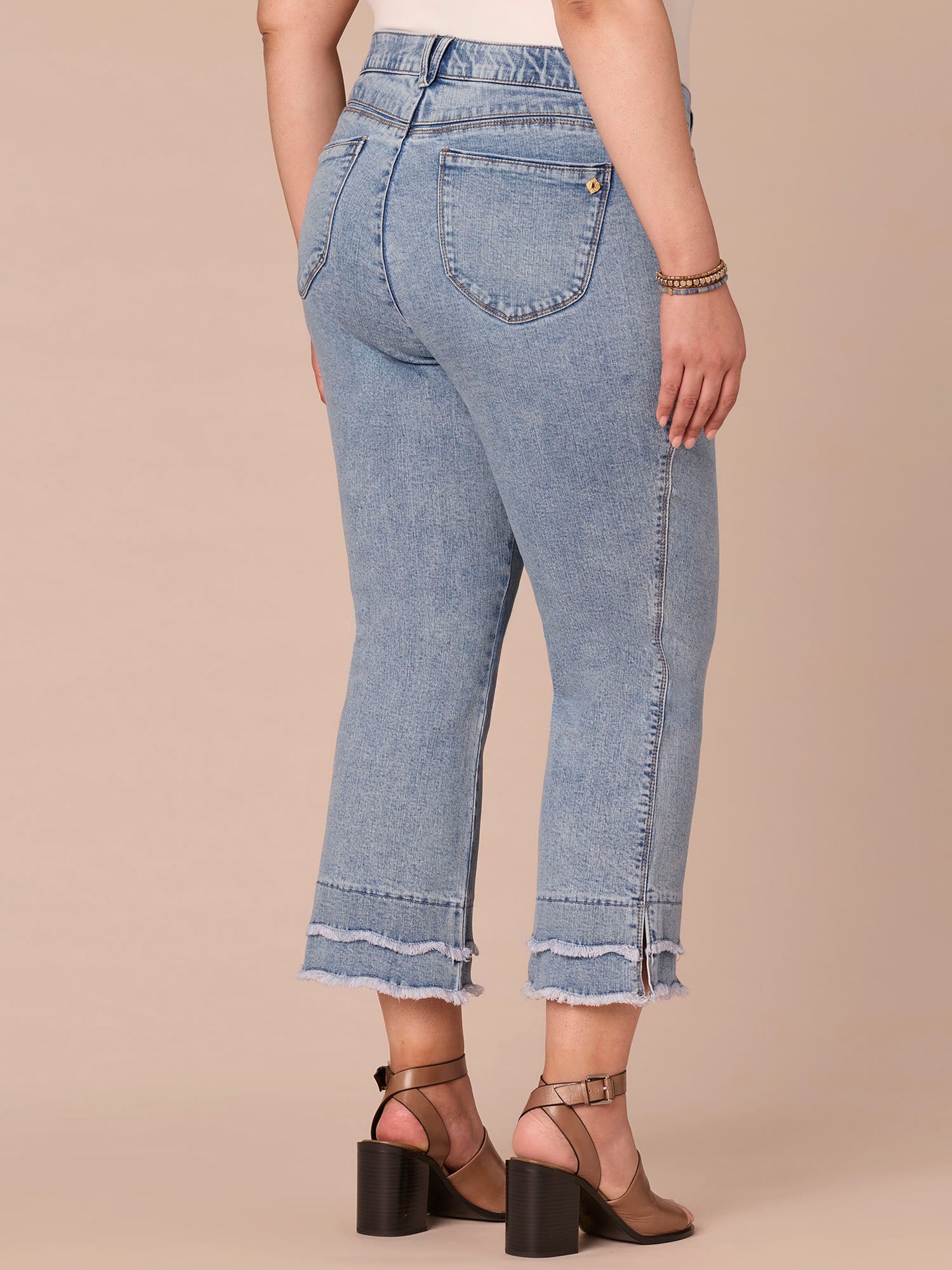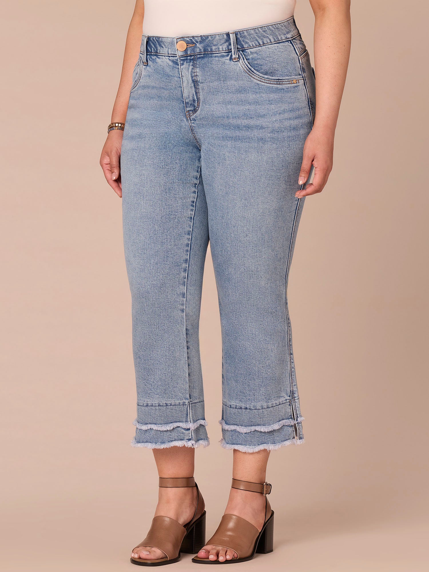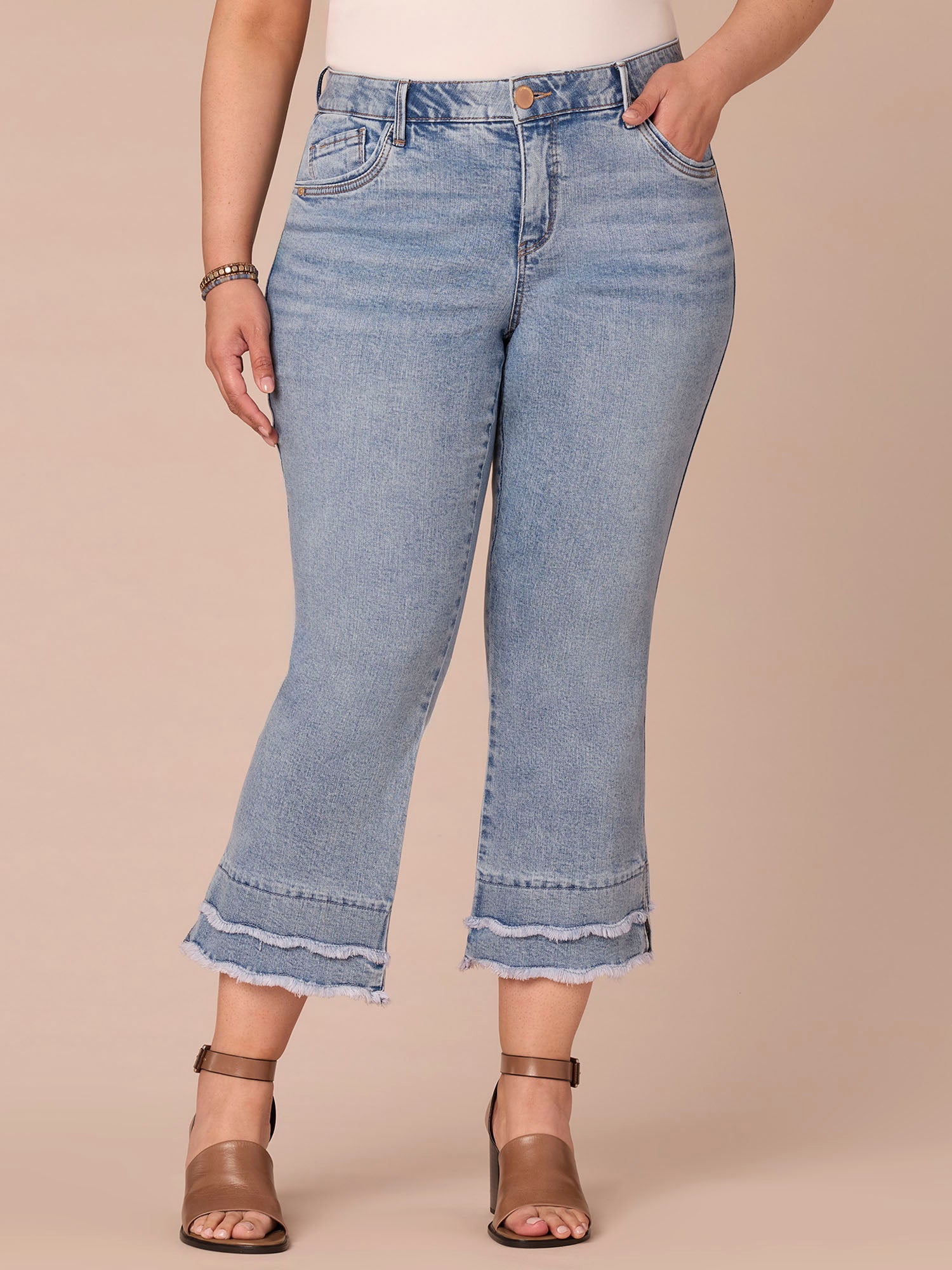 The Kick Flare jean in plus sizing skims your shape and finishes with a subtle flare at the above-ankle hem. Think Itty Bitty Boot, but cropped and with a double layered scallop fray hem. Engineered with “Ab”solution® fit technology, giving you everything from a flatter tummy to a perkier rear view.