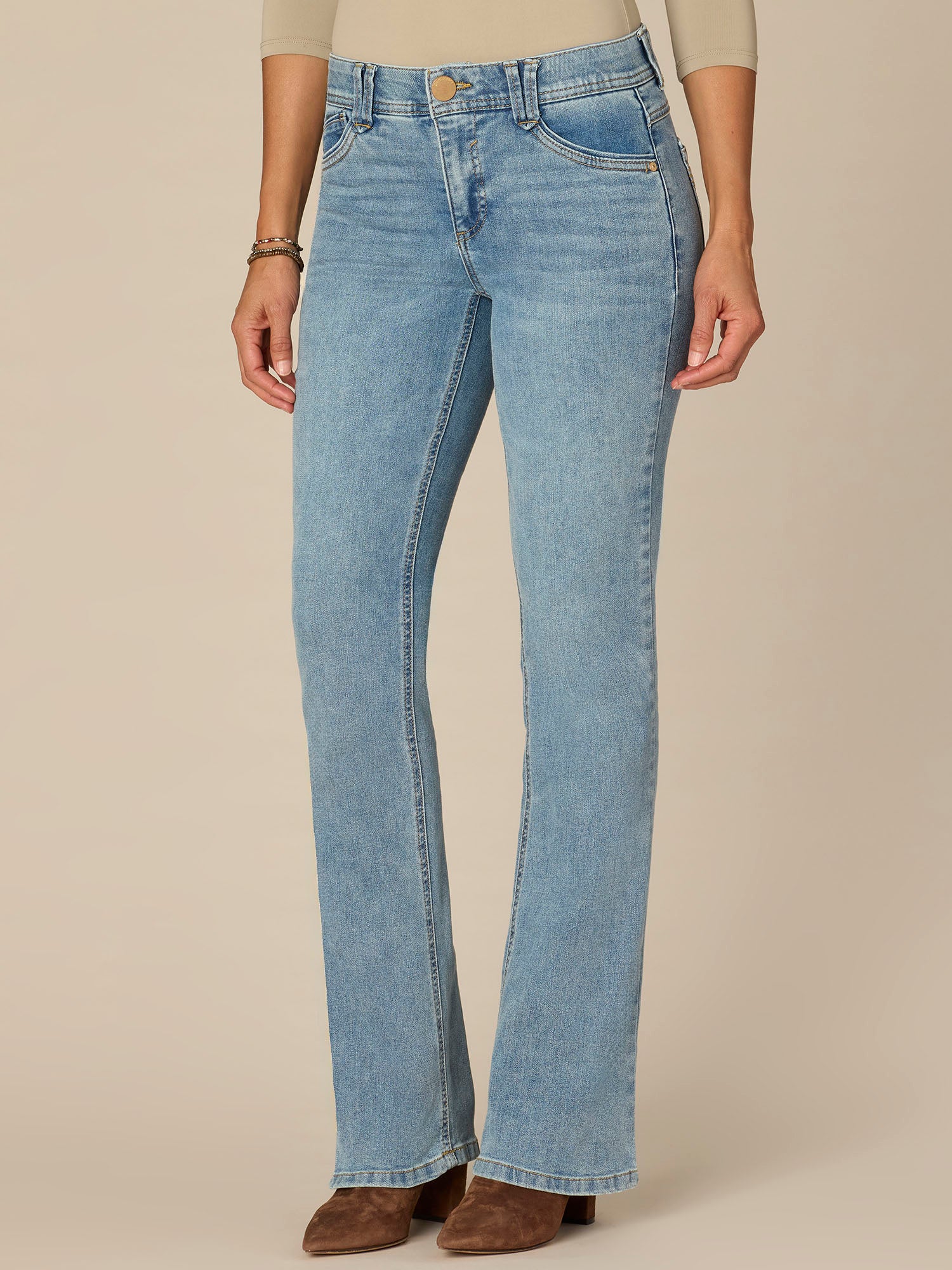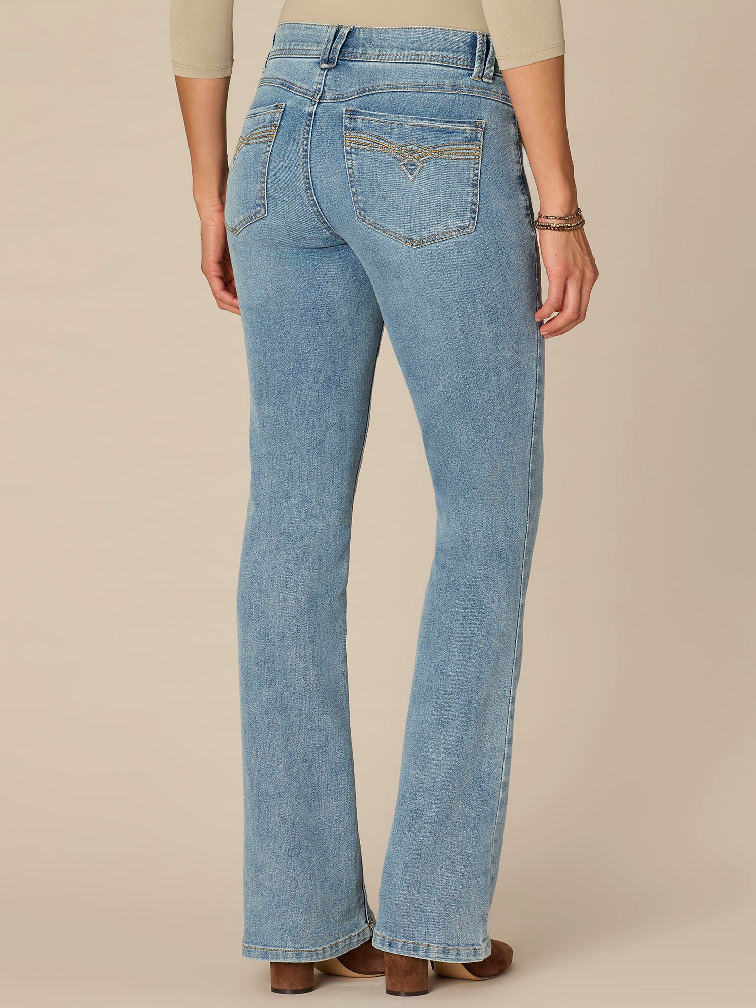 The Itty Bitty Bootcut jean is fitted from the hips to calves, with a baby bootcut leg opening that creates a lengthening effect. Featuring a light blue wash, 3D embroidery, and "Ab"solution® fit technology to smooth, support, and enhance your shape—giving you everything from a flatter tummy to a perkier rear view.