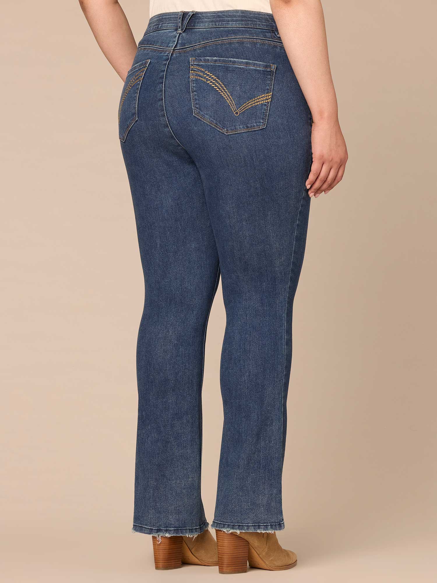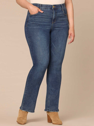 The Itty Bitty Bootcut jean in plus sizing is fitted from the hips to calves, with a baby bootcut leg opening that creates a lengthening effect. Engineered with "Ab"solution® fit technology to smooth, support, and enhance your shape—giving you everything from a flatter tummy to a perkier rear view. Made with recycled REPREVE® materials for a greener solution.