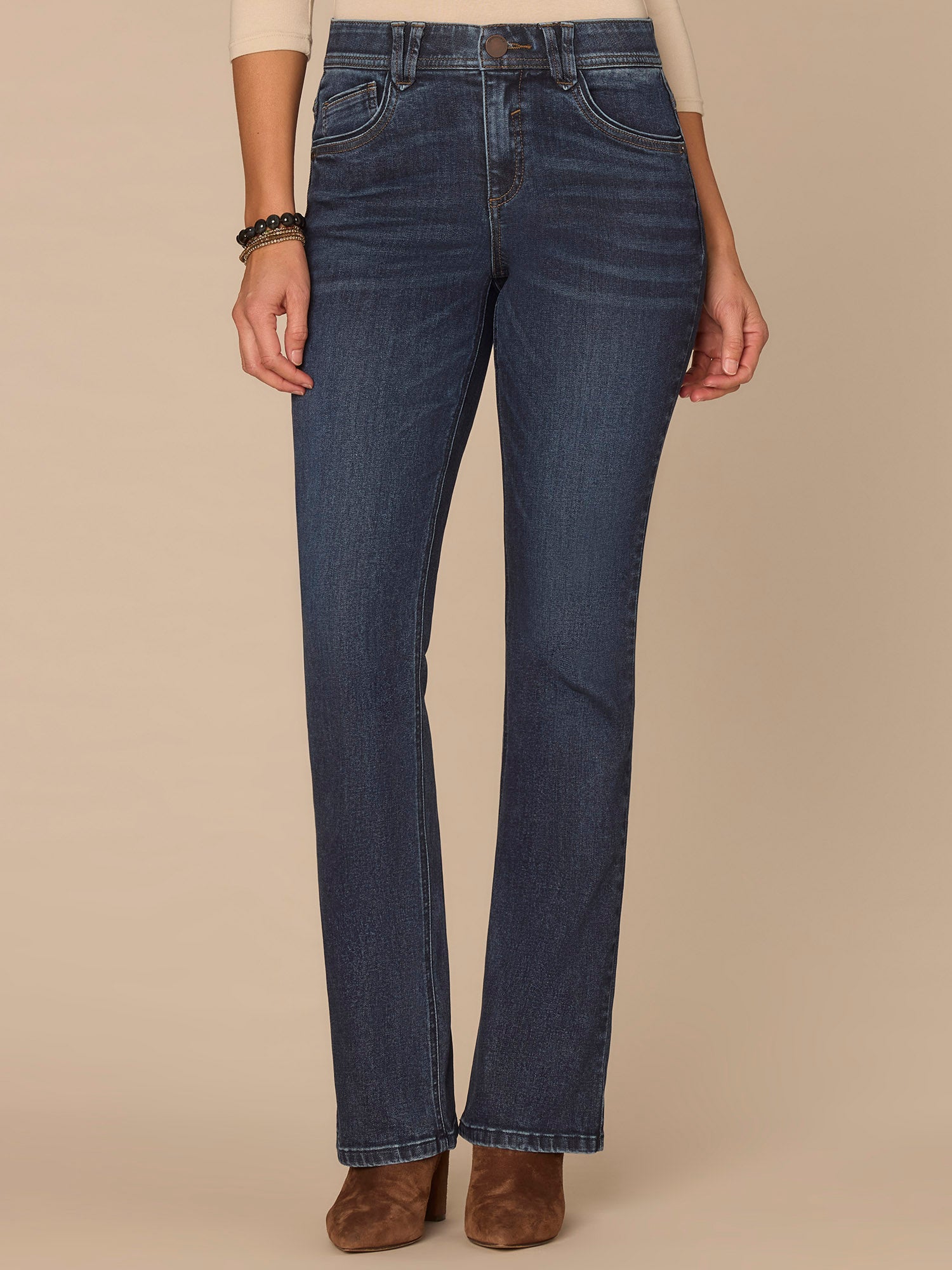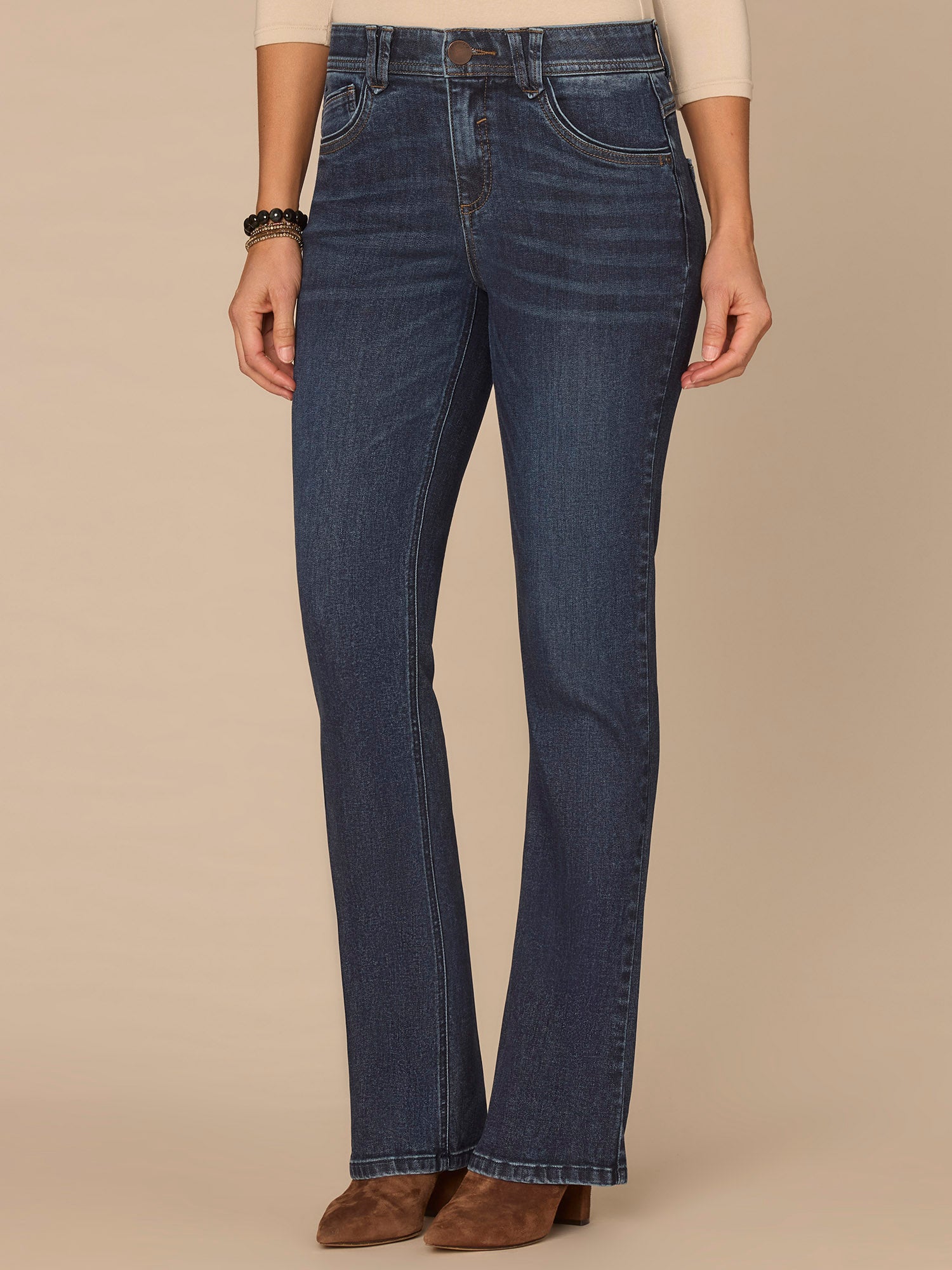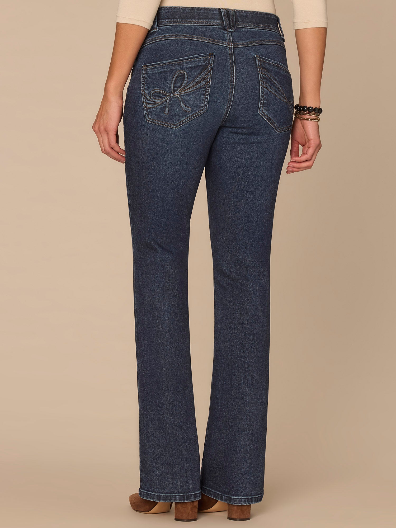 The Itty Bitty Bootcut jean in tall sizing is fitted from the hips to calves, with a baby bootcut leg opening that flatters long legs. Designed with a 3D embroidered bow back pocket and engineered with "Ab"solution® fit technology to smooth, support, and enhance your shape—giving you everything from a flatter tummy to a perkier rear view.