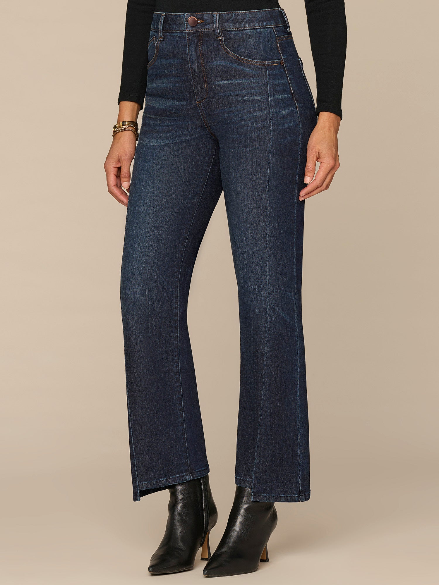 Our Bootcut in petite sizing is a relaxed and easy straight fit throughout the leg with a subtle flare at the hem, made for all-day comfortable wear. Engineered with seaming details, a clean finish step hem, and "Ab"solution® fit technology—giving you everything from a flatter tummy to a perkier rear view.