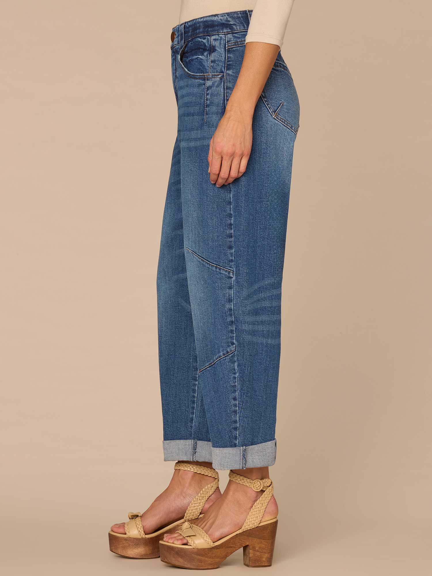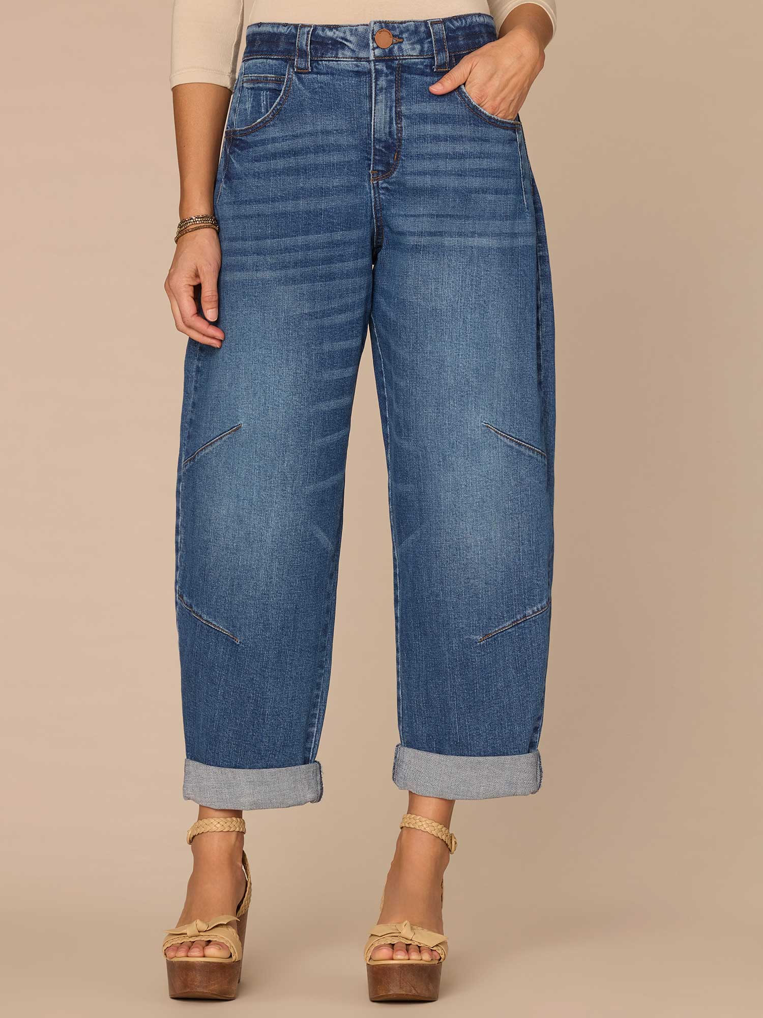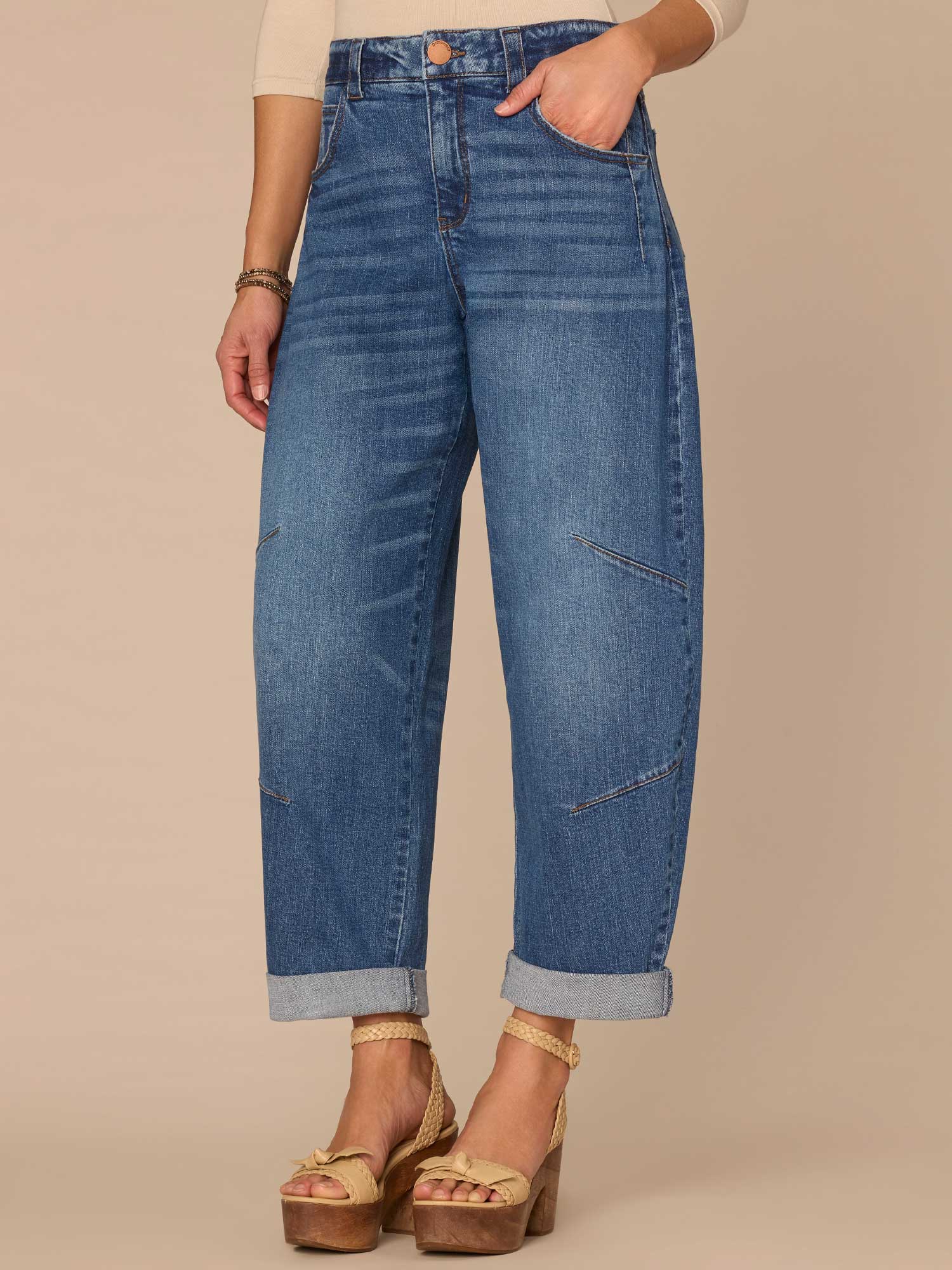 The Barrel Leg jean is slightly fitted at the hips, with a looser, relaxed fit from the thighs to the roll cuff hem. Engineered with "Ab"solution® fit technology and knee darts to smooth, support, and enhance your shape — giving you everything from a flatter tummy to a perkier rear view.