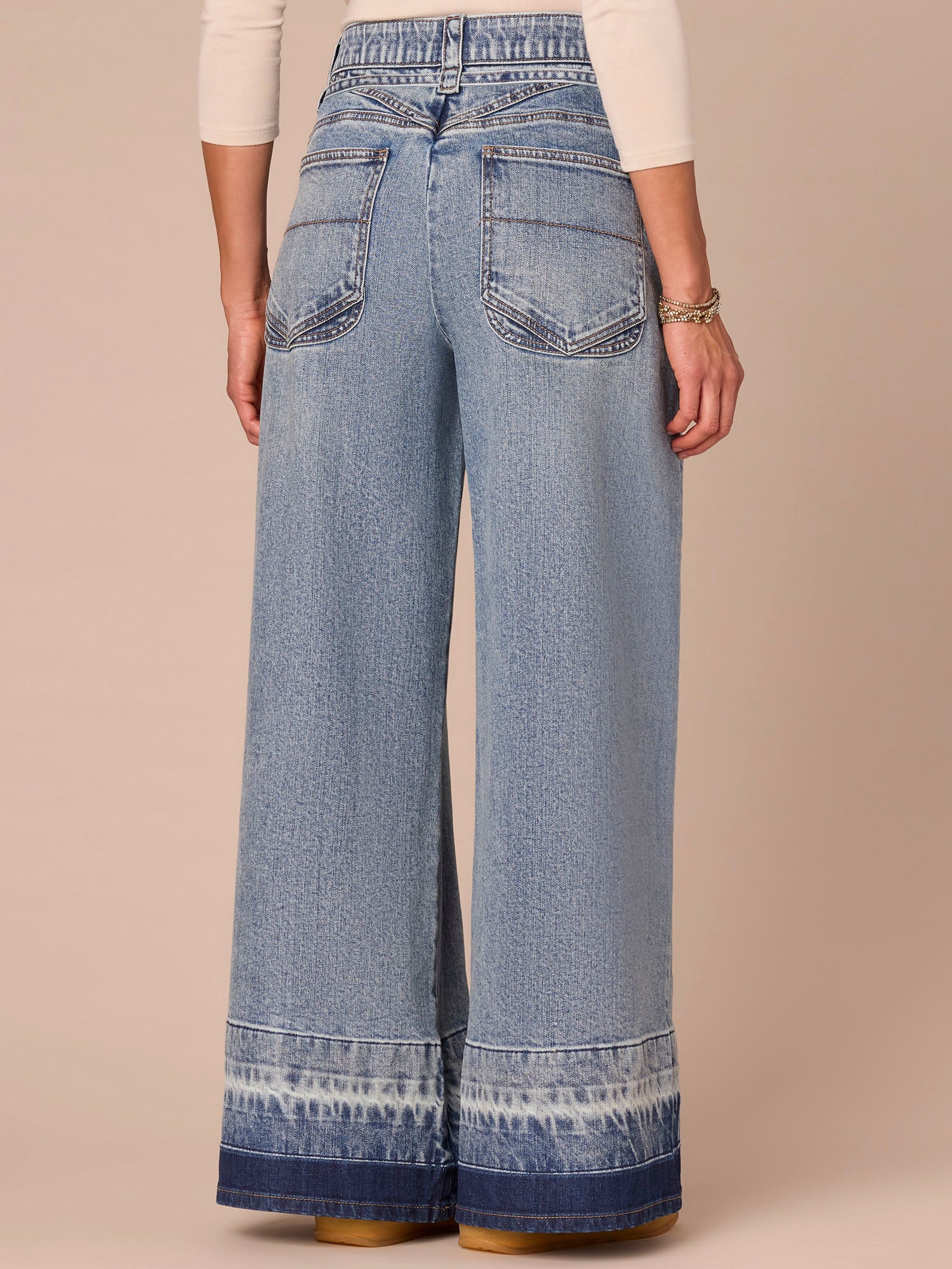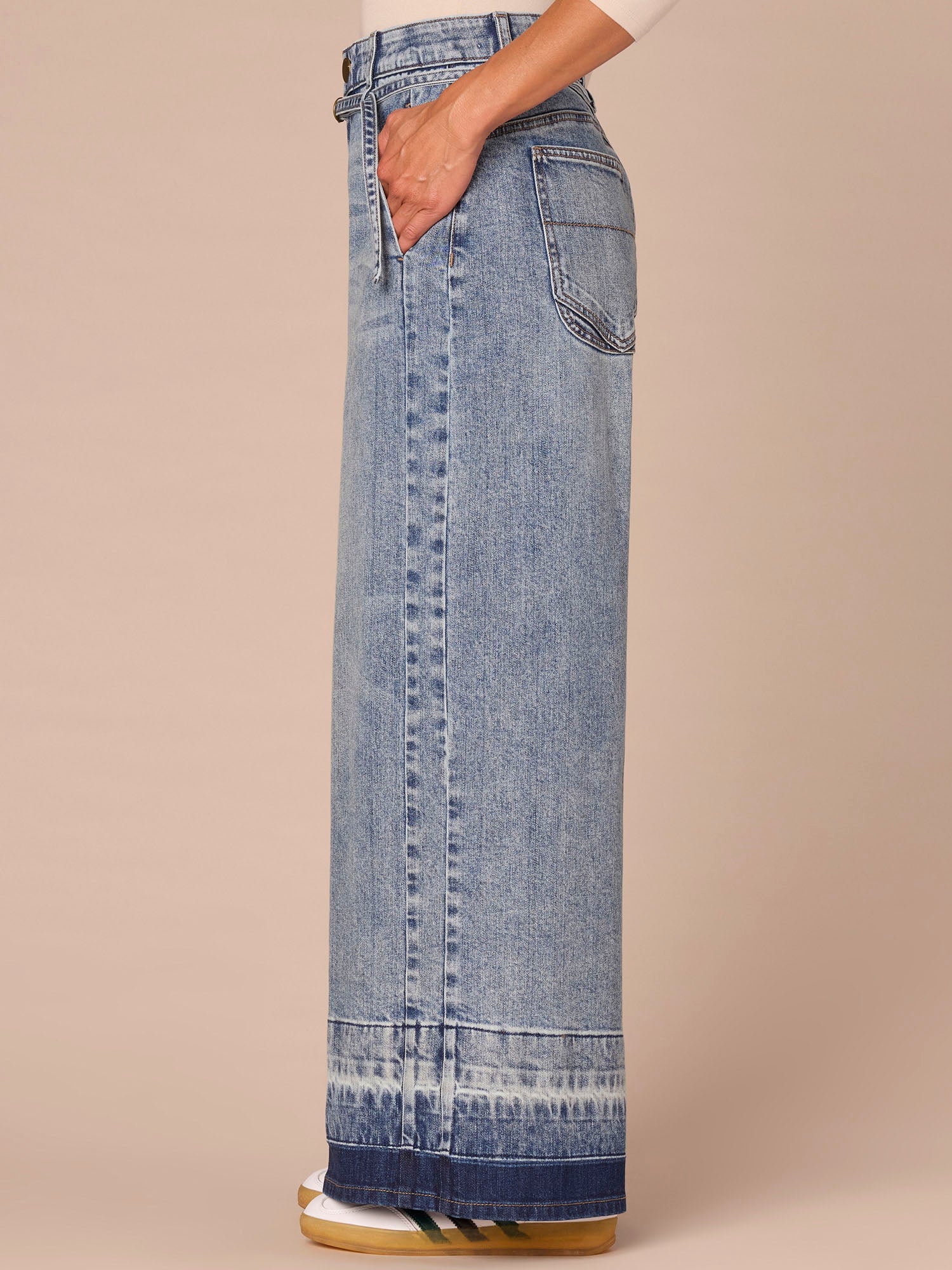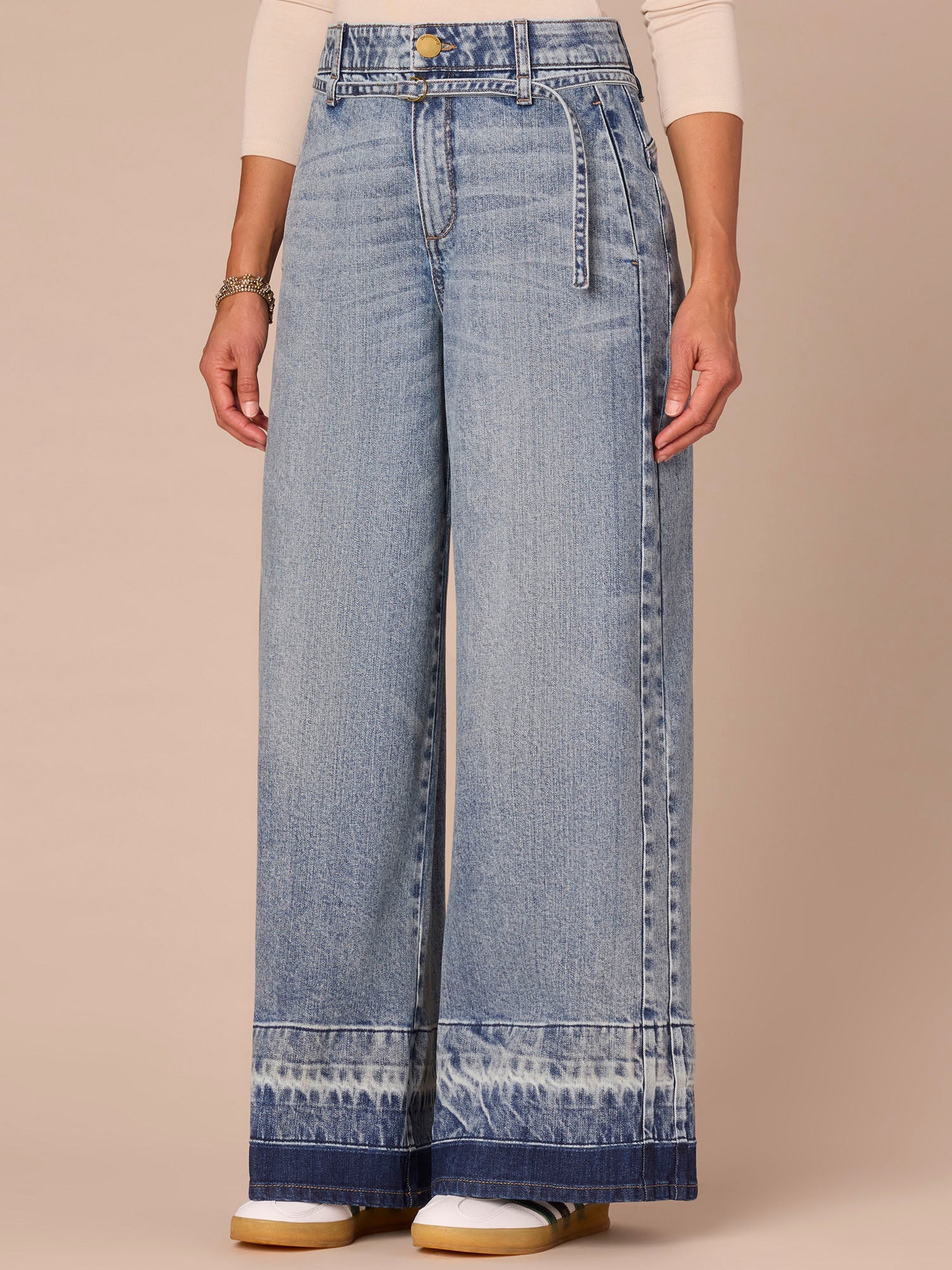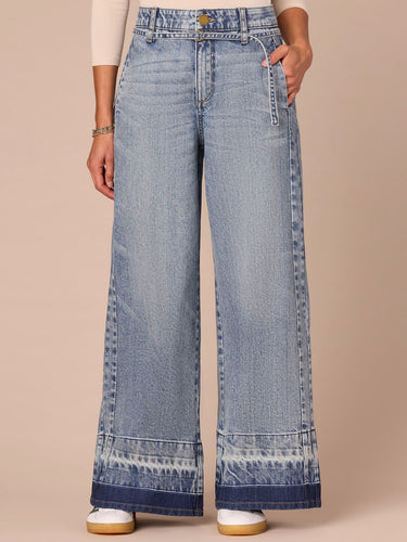 The Wide Leg is fitted through the hips with a relaxed, wide opening through the legs. This pair has an ultra skyrise waist with a denim self tie belt, side seams, a released hem, and "Ab"solution® fit technology to smooth, support, and enhance your shape—giving you everything from a flatter tummy to a perkier rear view.
