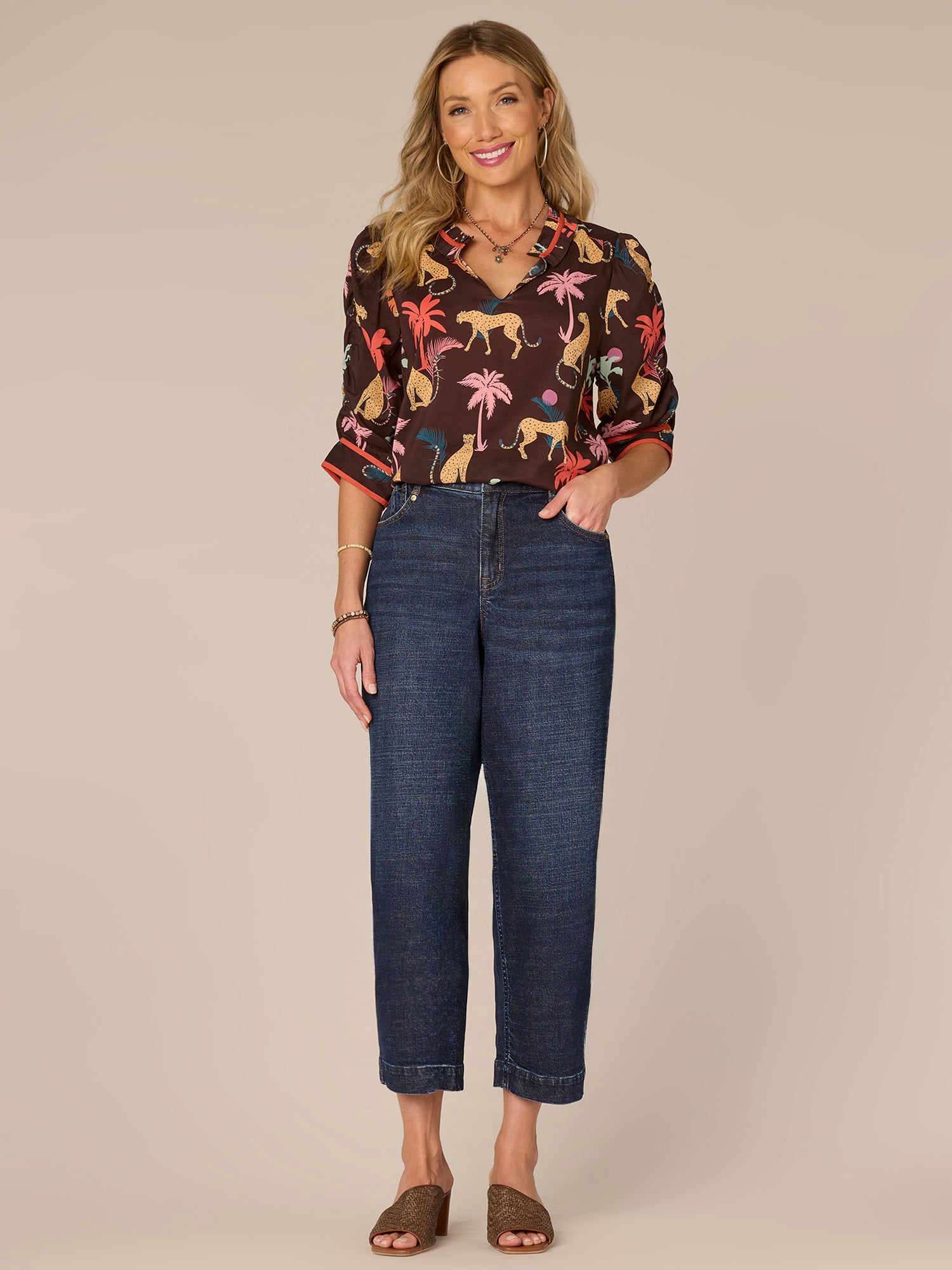 A versatile petite woven top with thoughtful details like a ruffle split neck, ruched sleeves, and a cinched back yoke for gentle shaping. The tropical cheetah print and relaxed fit make it easy to dress up or down.