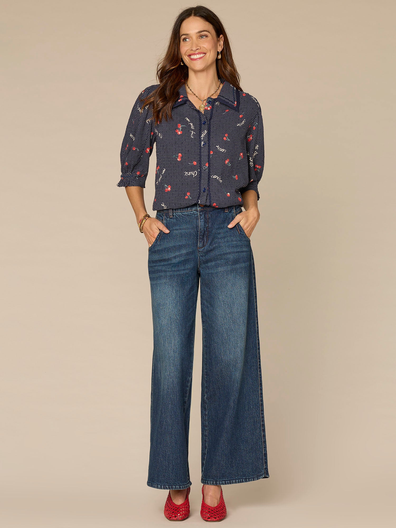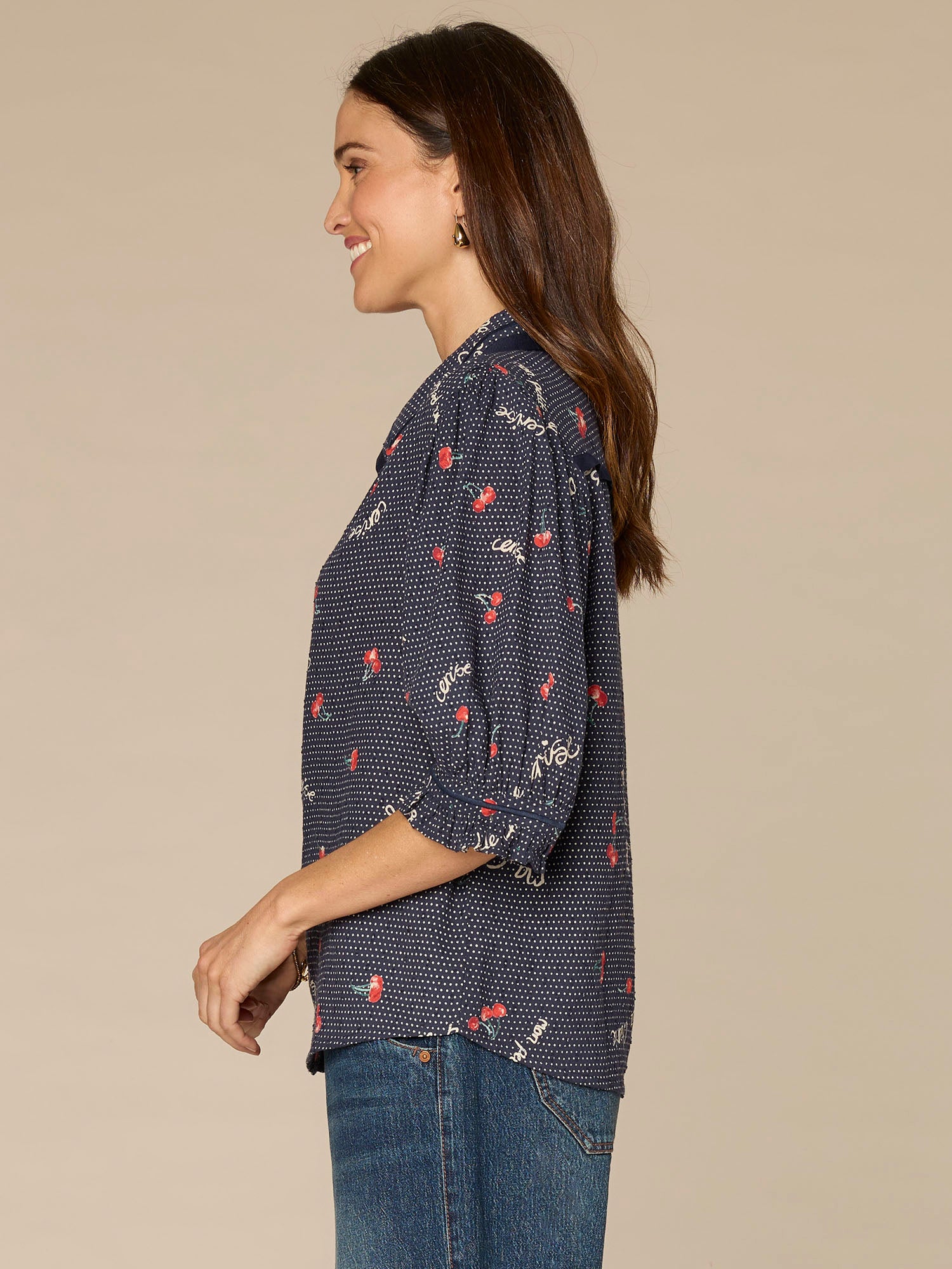 This woven top features below elbow cinched sleeves, a collared neck, classic button down front, and a fun polka dot, cherry, and cursive script print. Perfect for everyday ease.