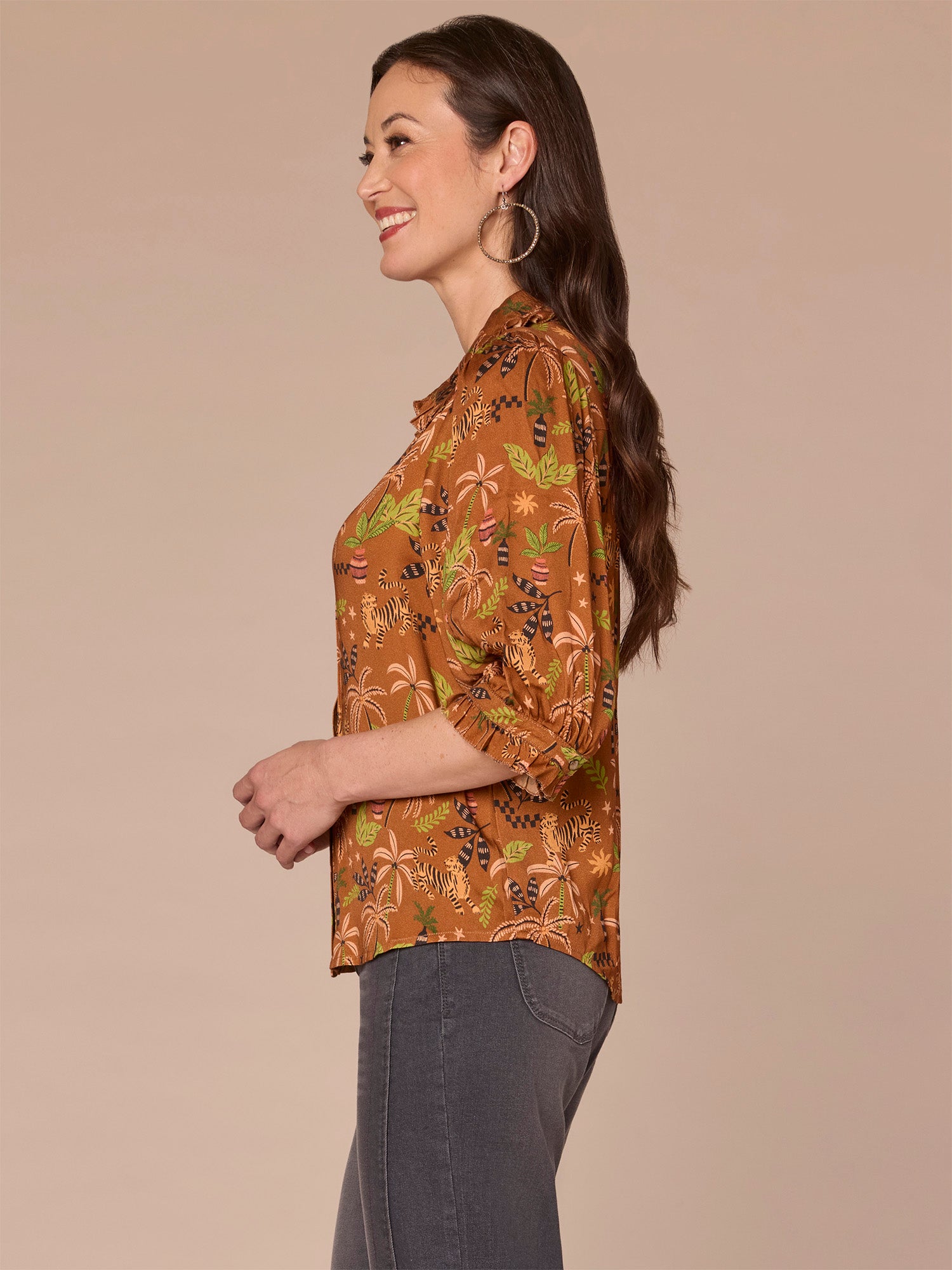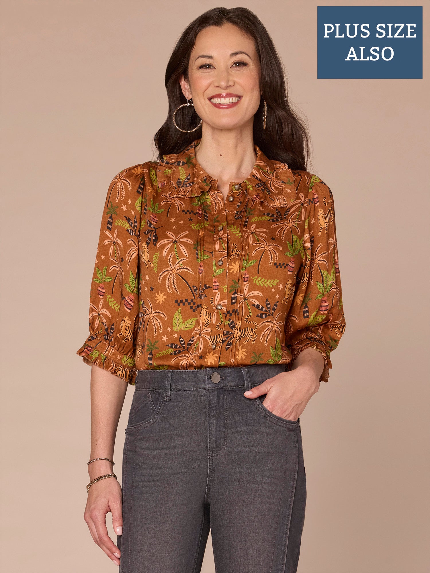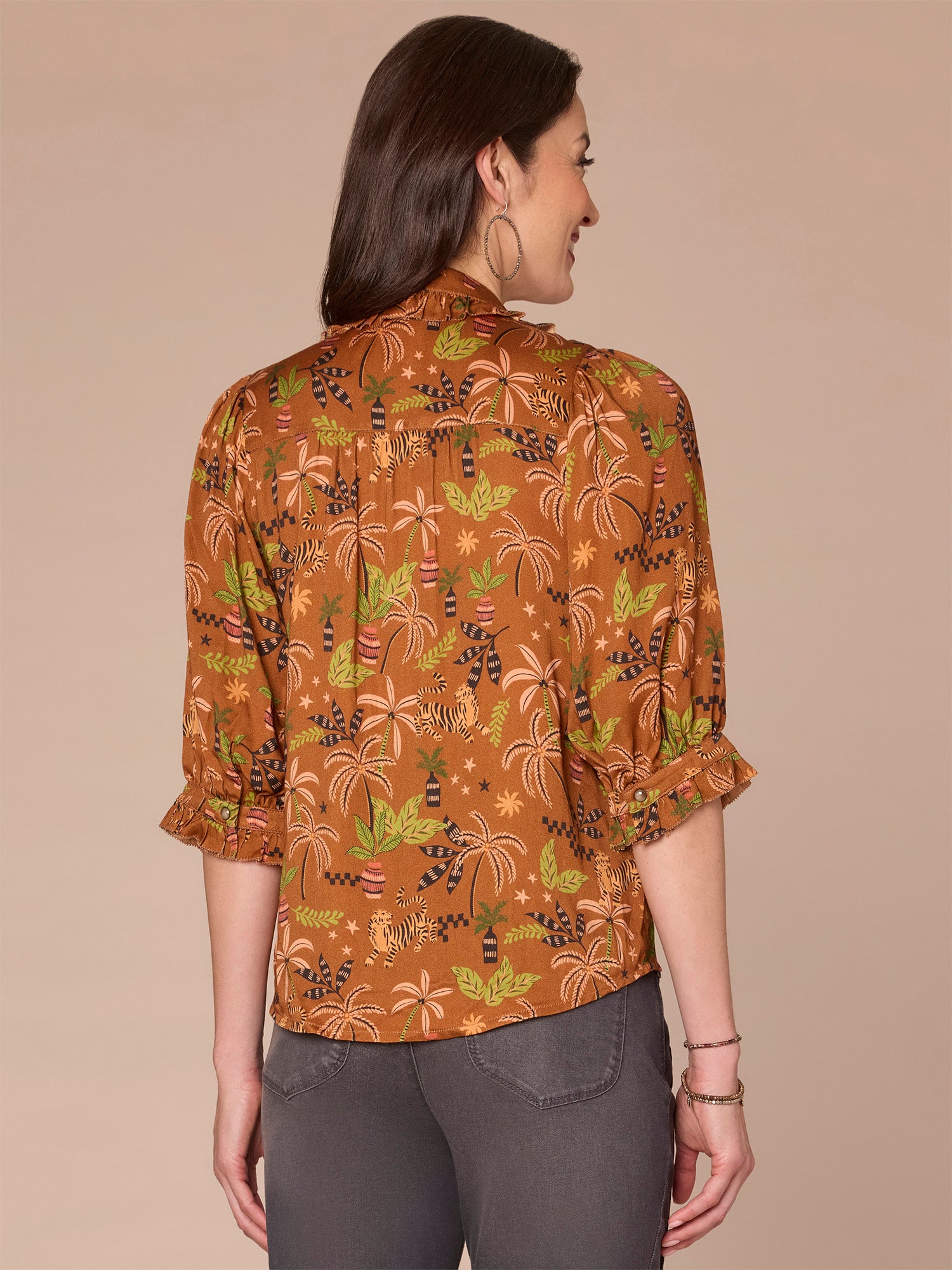 Made for every occasion, this woven button down top in plus sizing is designed with a ruffle-edge collar neck, cinched back yoke, below elbow ruffle puff sleeves, and a neutral copper hue. Its tropical print adds a fun and festive vibe.