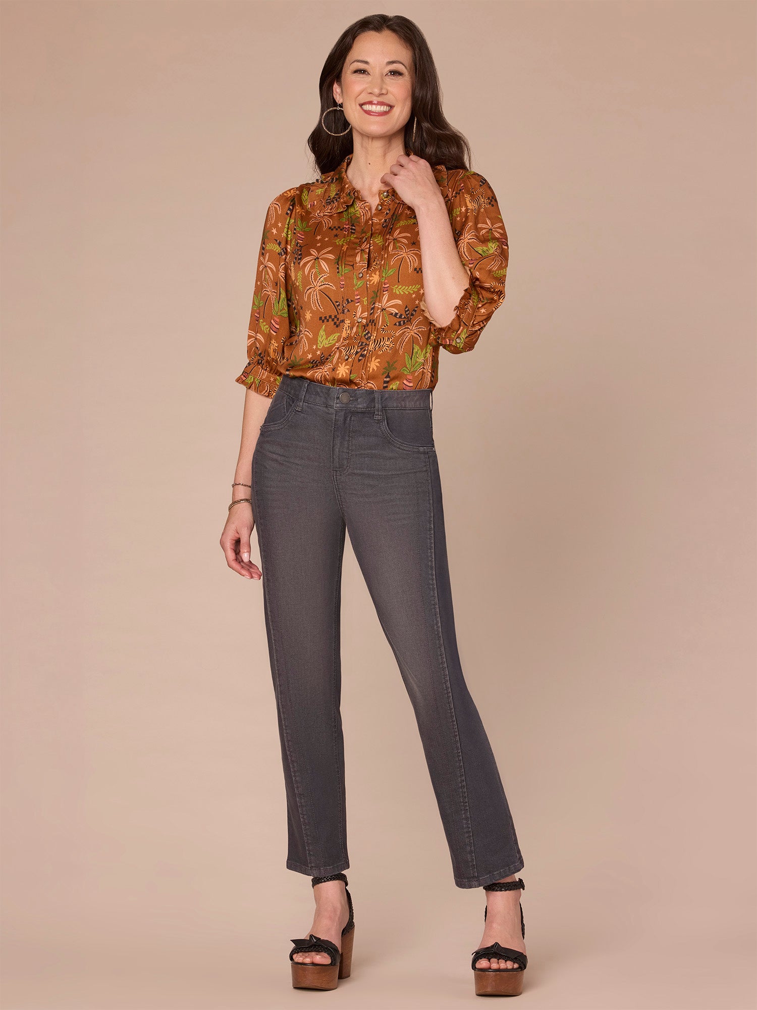Below Elbow Sleeve Pintuck Button Down Printed Plus Size Woven Top