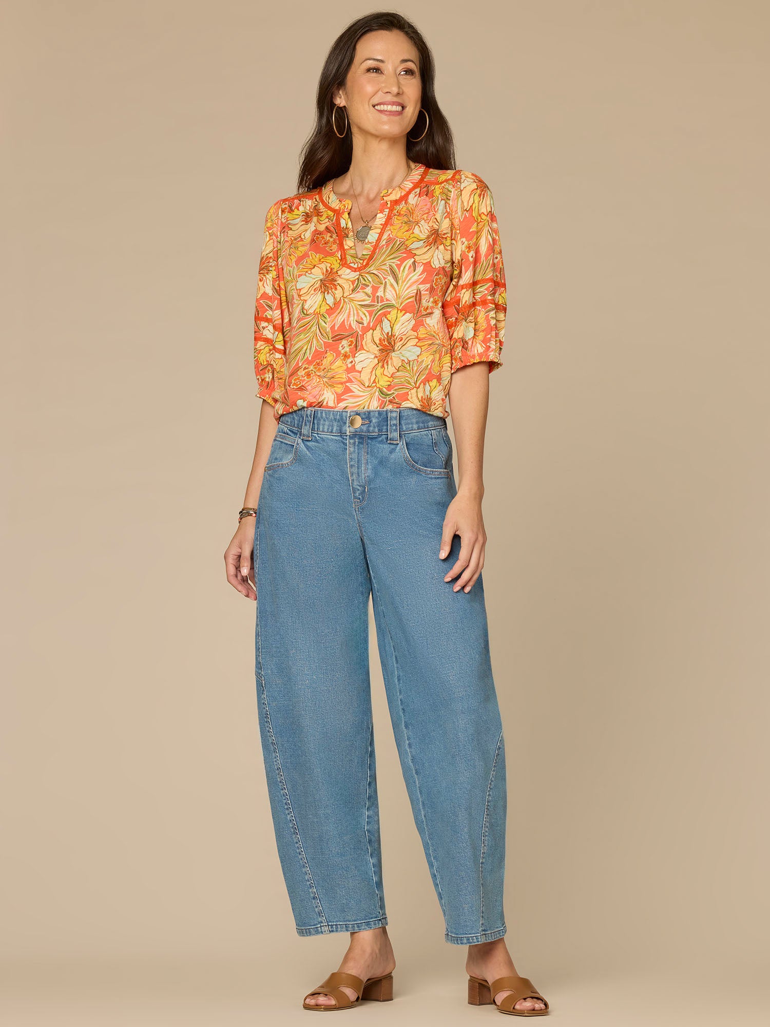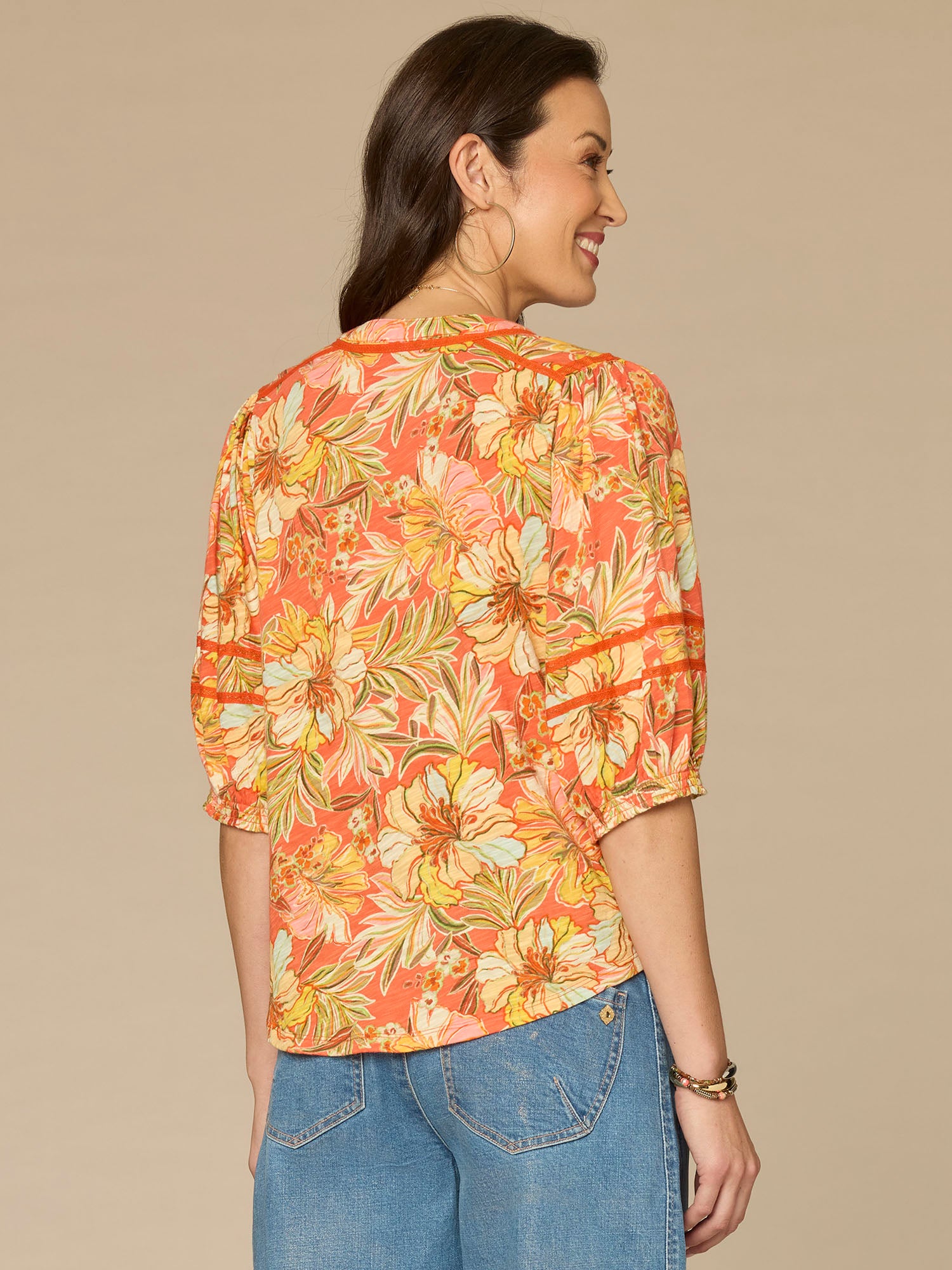 Meet the easy-to-style embroidered knit top in petite sizing that steals the spotlight. Featuring three quarter blouson sleeves, a mandarin collar neck, half placket, and a fun floral print, it’s a go-to from AM to PM.