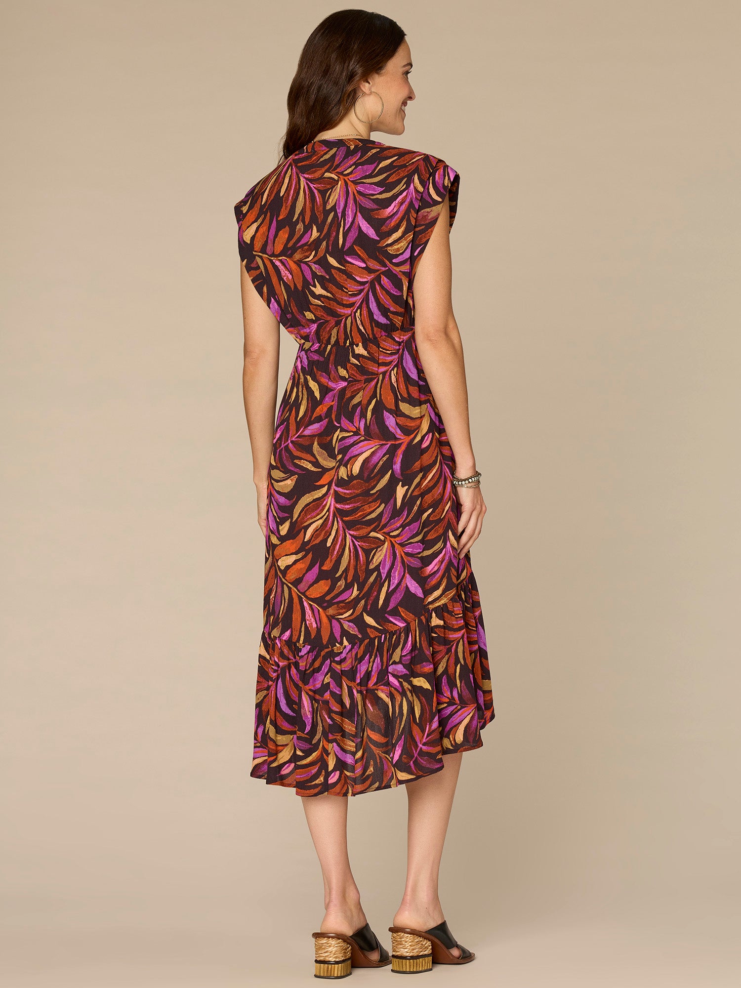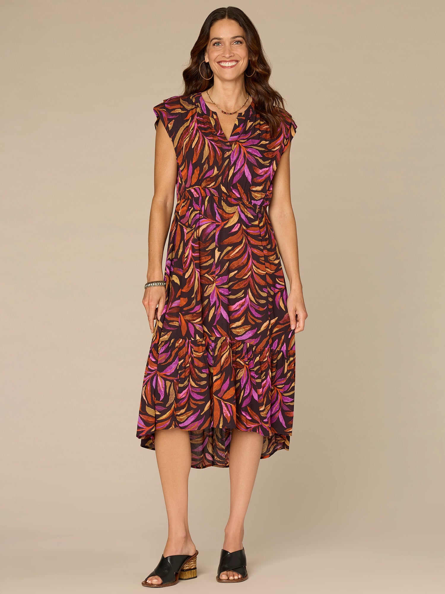 With double flounce cap sleeves, a V-notch neck, and a tiered midi hem, this chic woven dress in petite sizing suits every occasion. It’s also designed with an abstract leafy print and two side entry pockets.