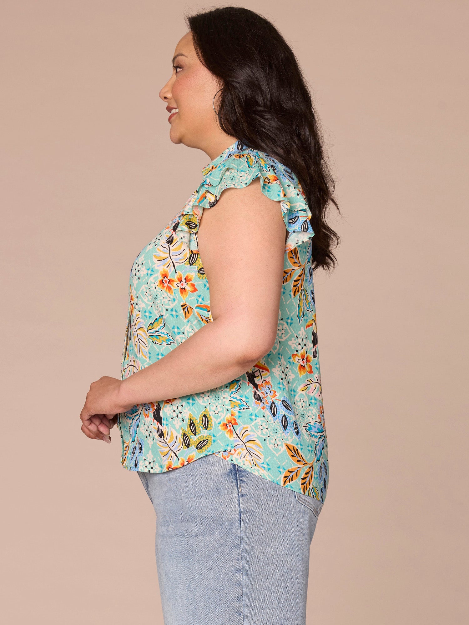 Leaf it to this woven button down top in plus sizing to bring the charm. With fluttery sleeves, a ruffle edge collar, V-neck, and a pretty abstract print, it’s the perfectly breezy way to dress up your day.