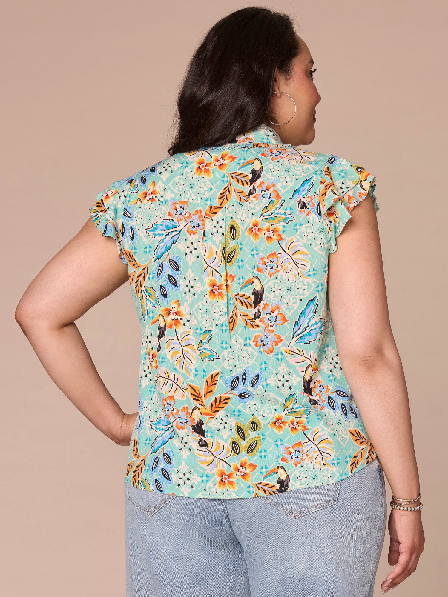 Double Flutter Sleeve Collared V-Neck Leaf Print Plus Size Woven Top