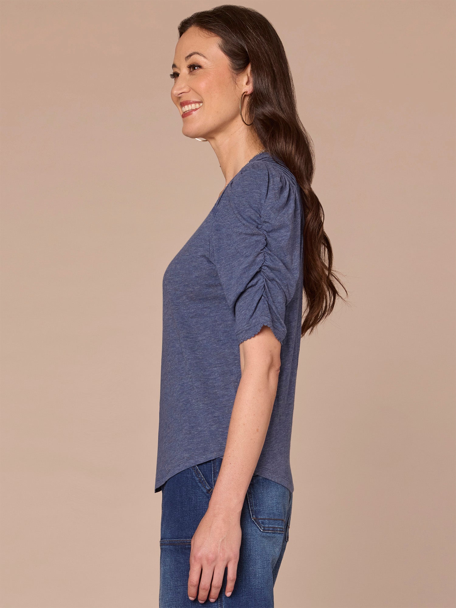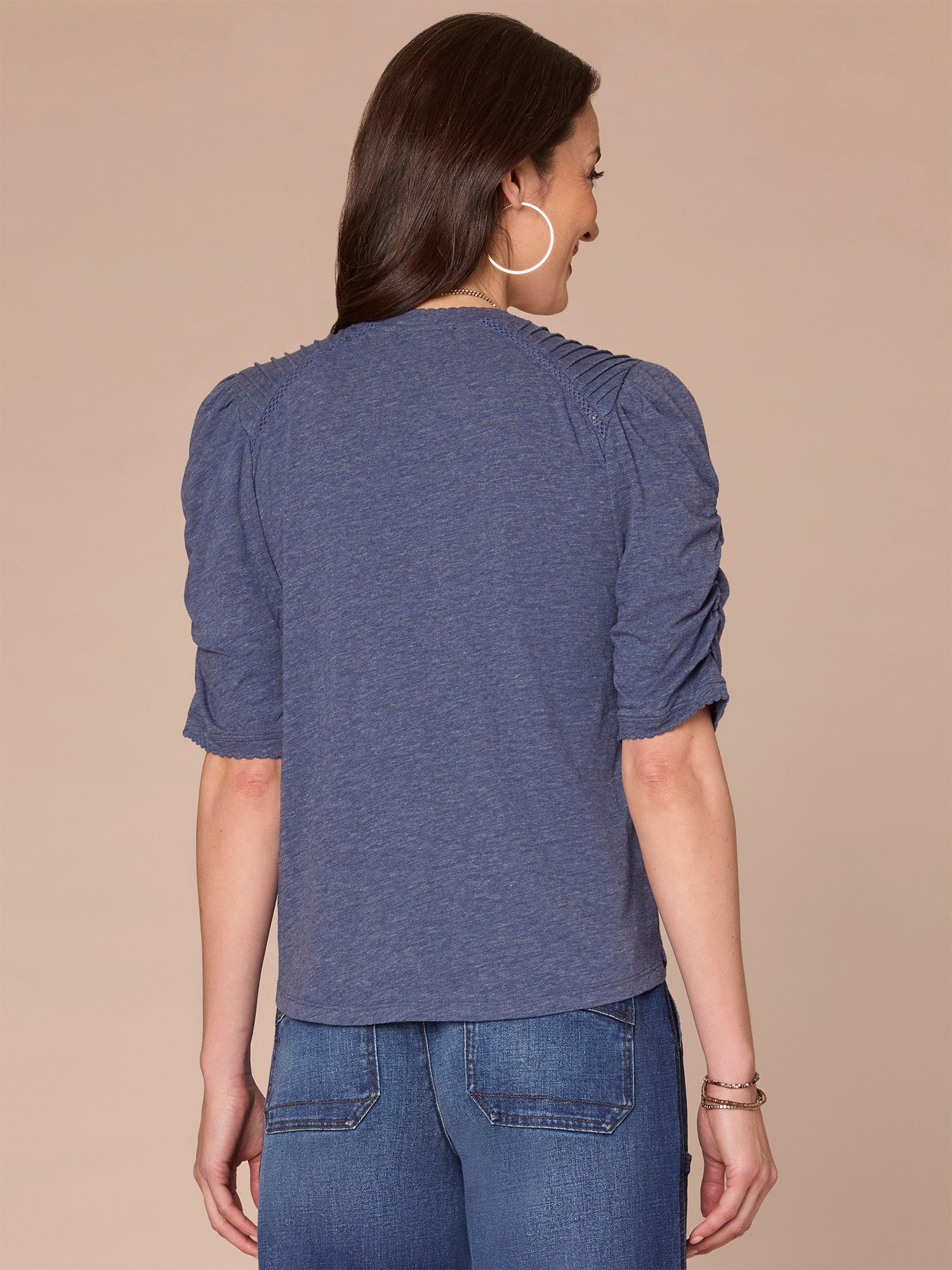 Elbow Puff Sleeve Scallop V-Neck Pintuck Petite Knit Top