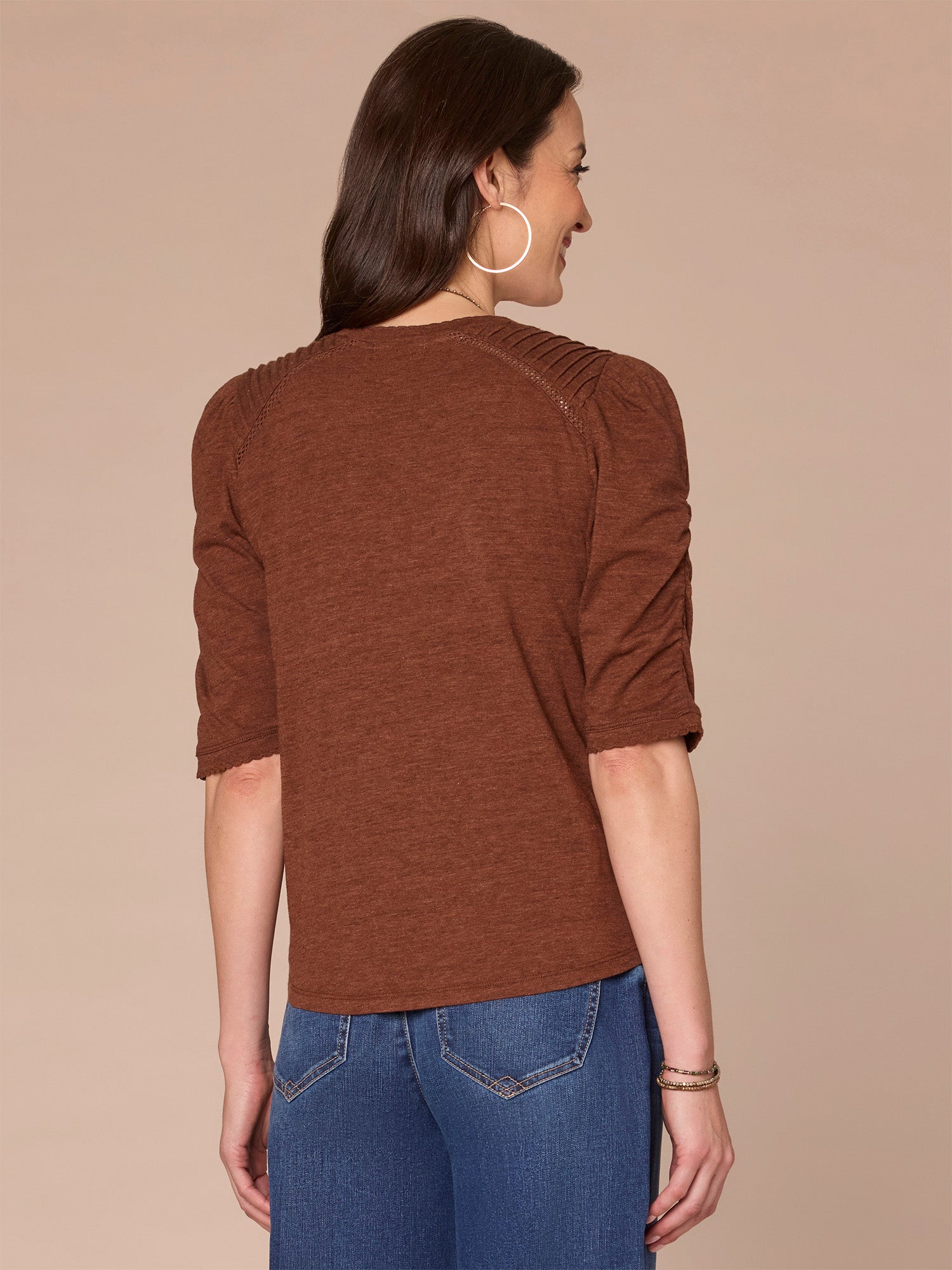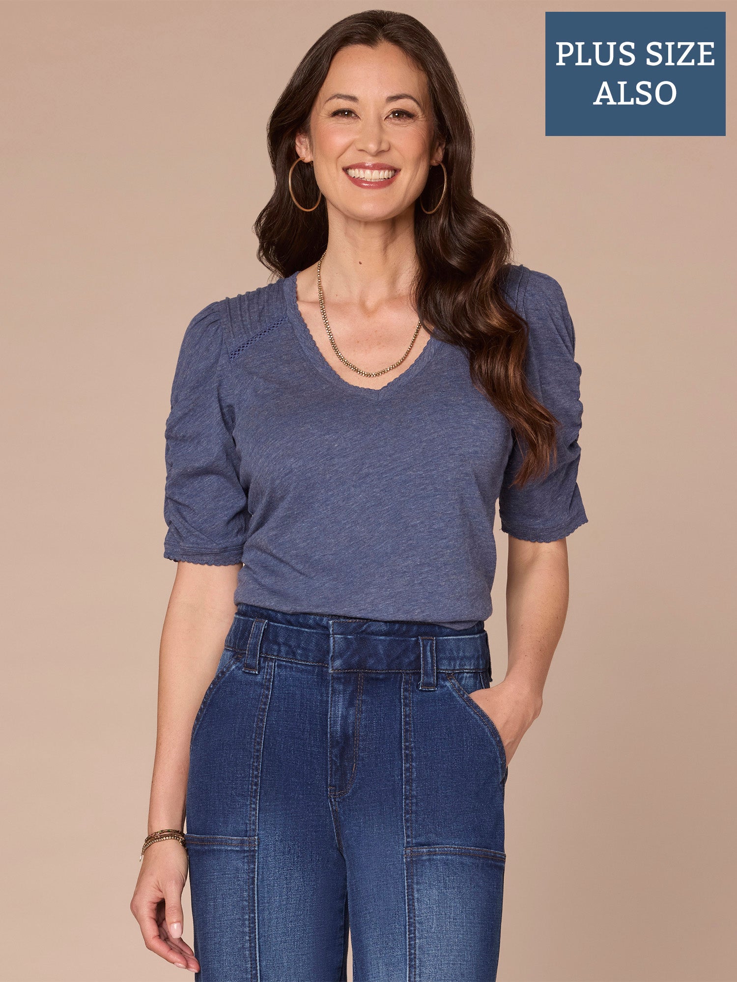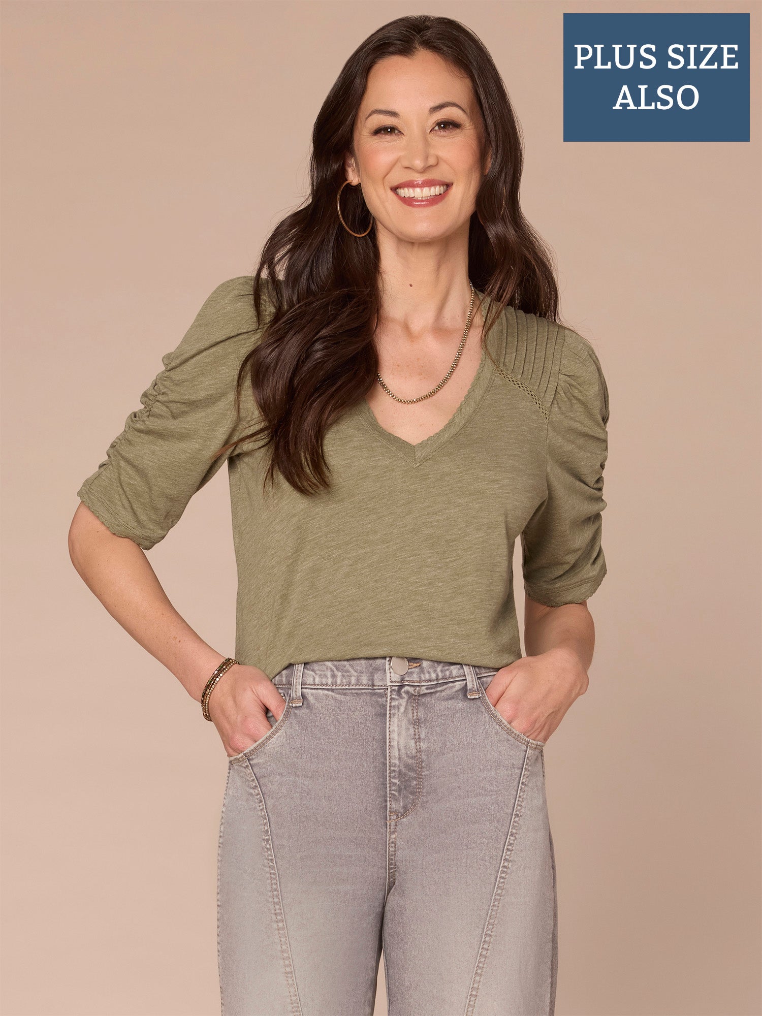 This must-have knit top in plus sizing has chic design elements like pintucks, crochet, and a scallop-lined V-neck. Its elbow ruched puff sleeves and surplus shirttail hem add an effortless look that’s perfect for every day.