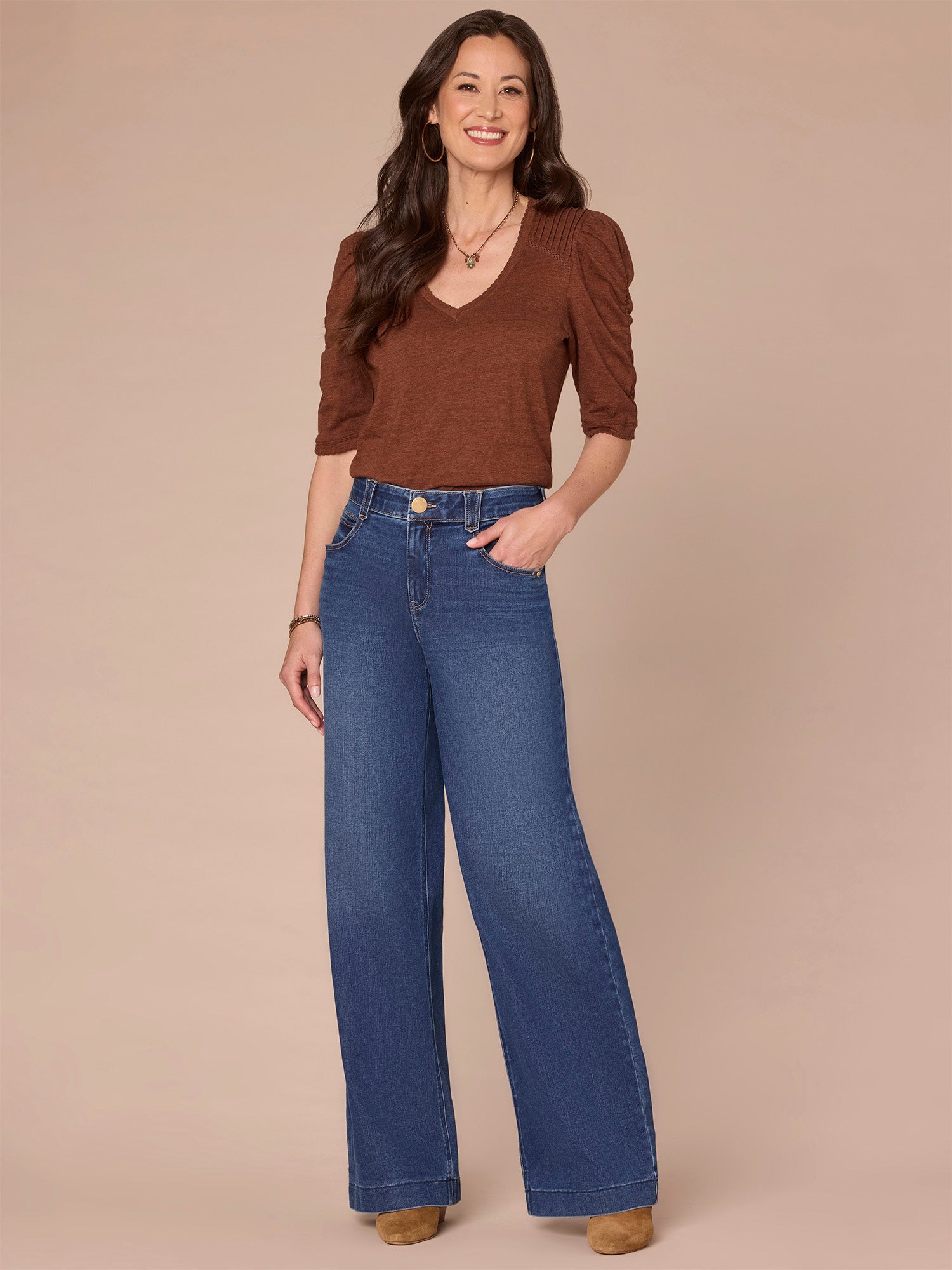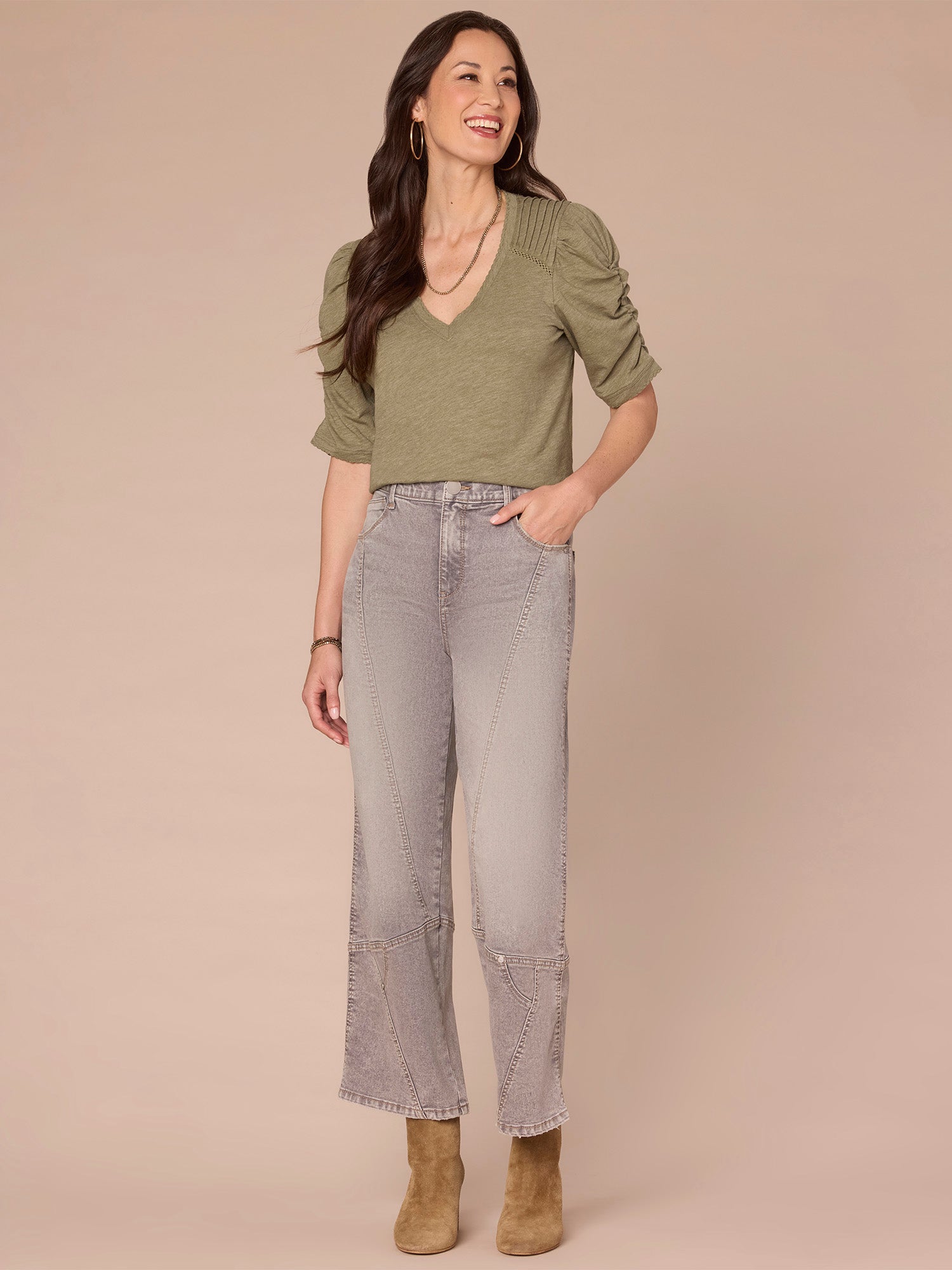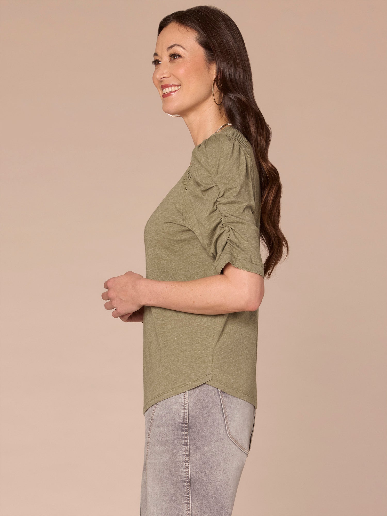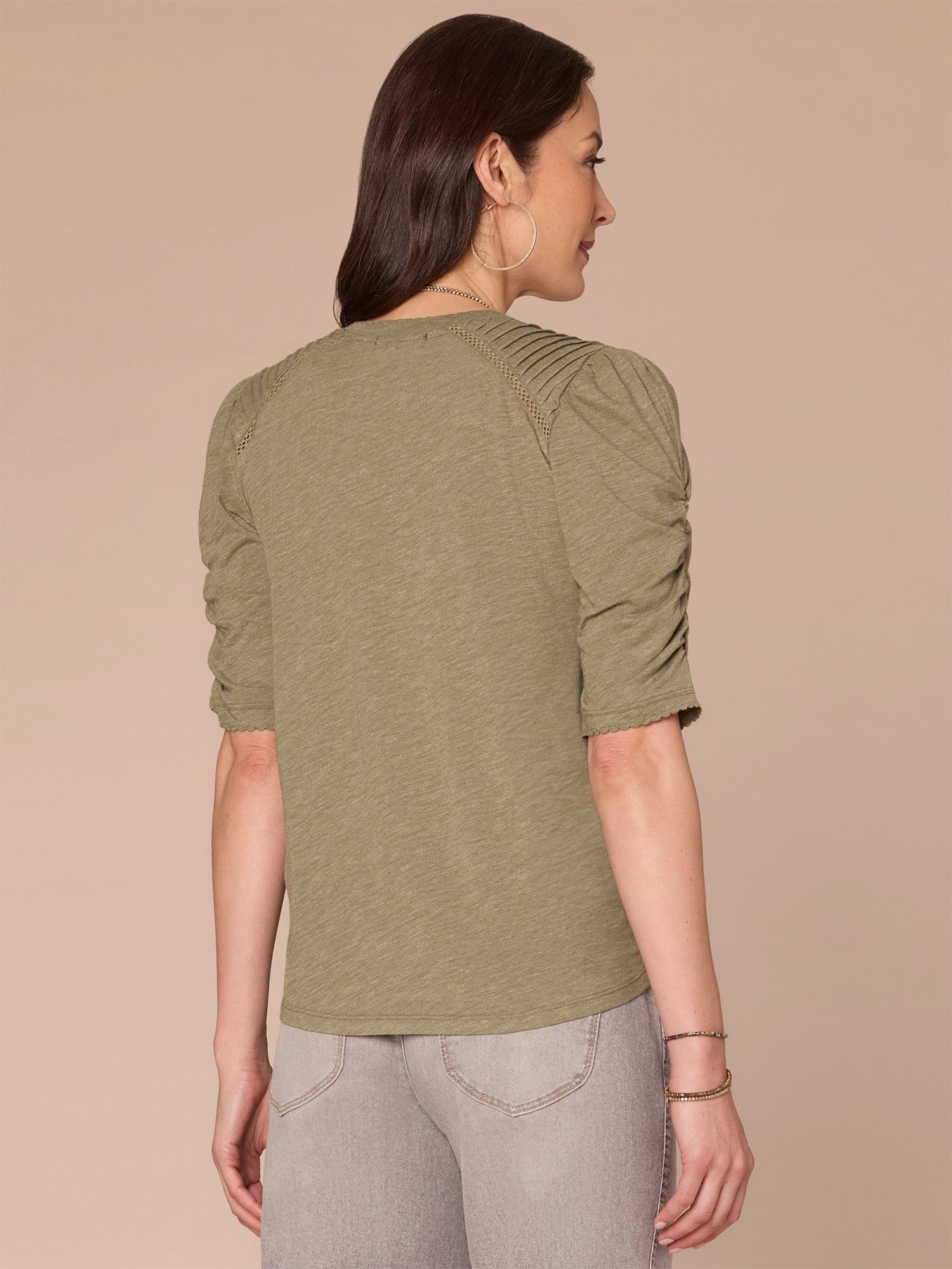 This must-have knit top in plus sizing has chic design elements like pintucks, crochet, and a scallop-lined V-neck. Its elbow ruched puff sleeves and surplus shirttail hem add an effortless look that’s perfect for every day.