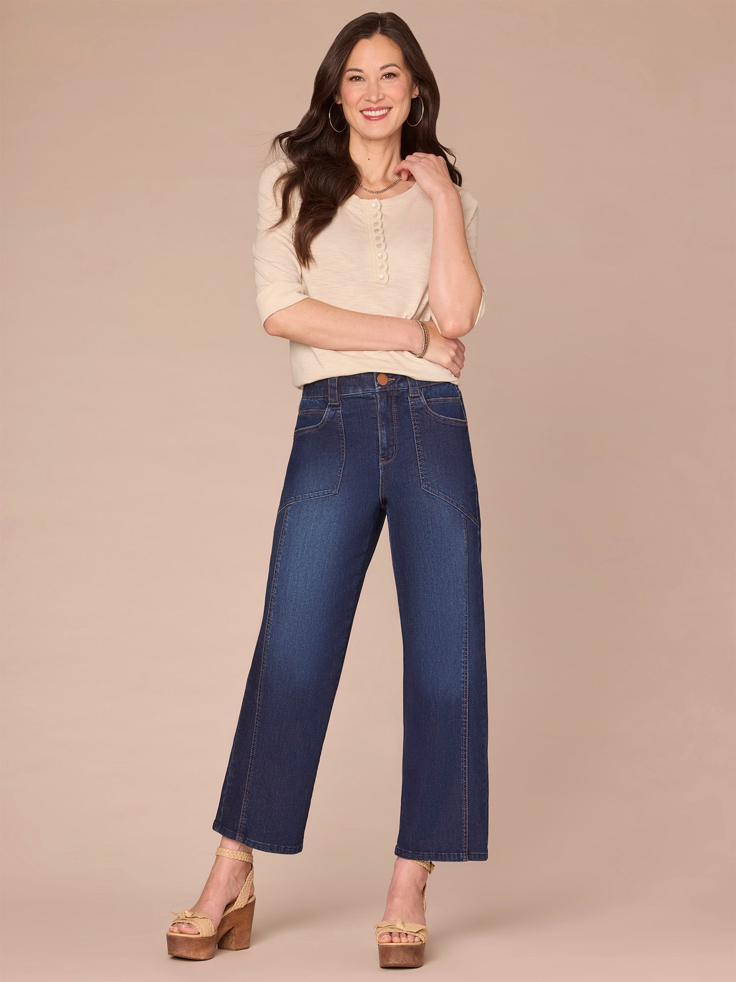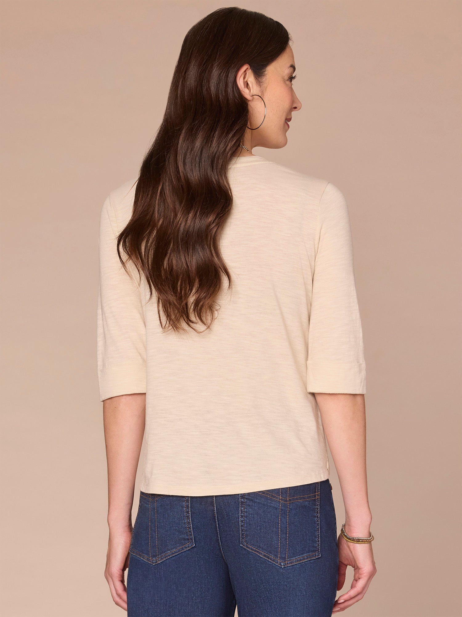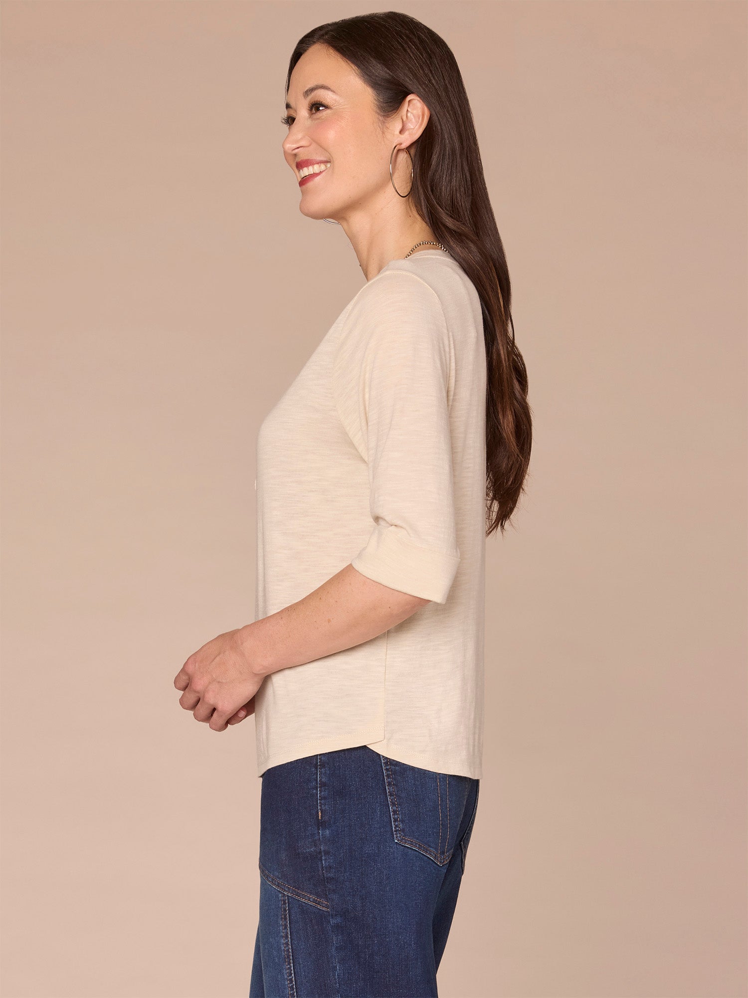 Elbow Roll Cuff Sleeve Round Neck Crochet Placket Henley Knit Top