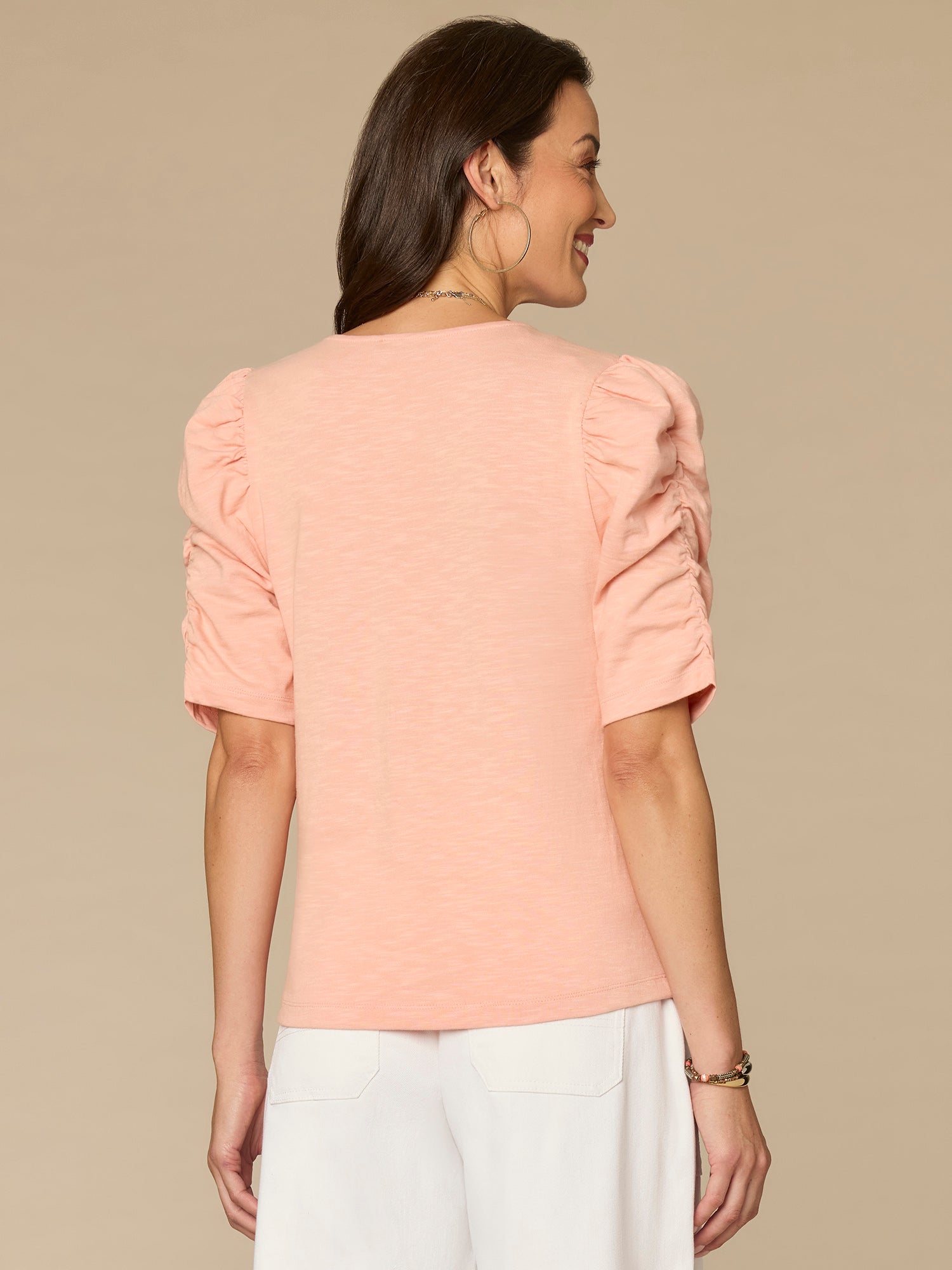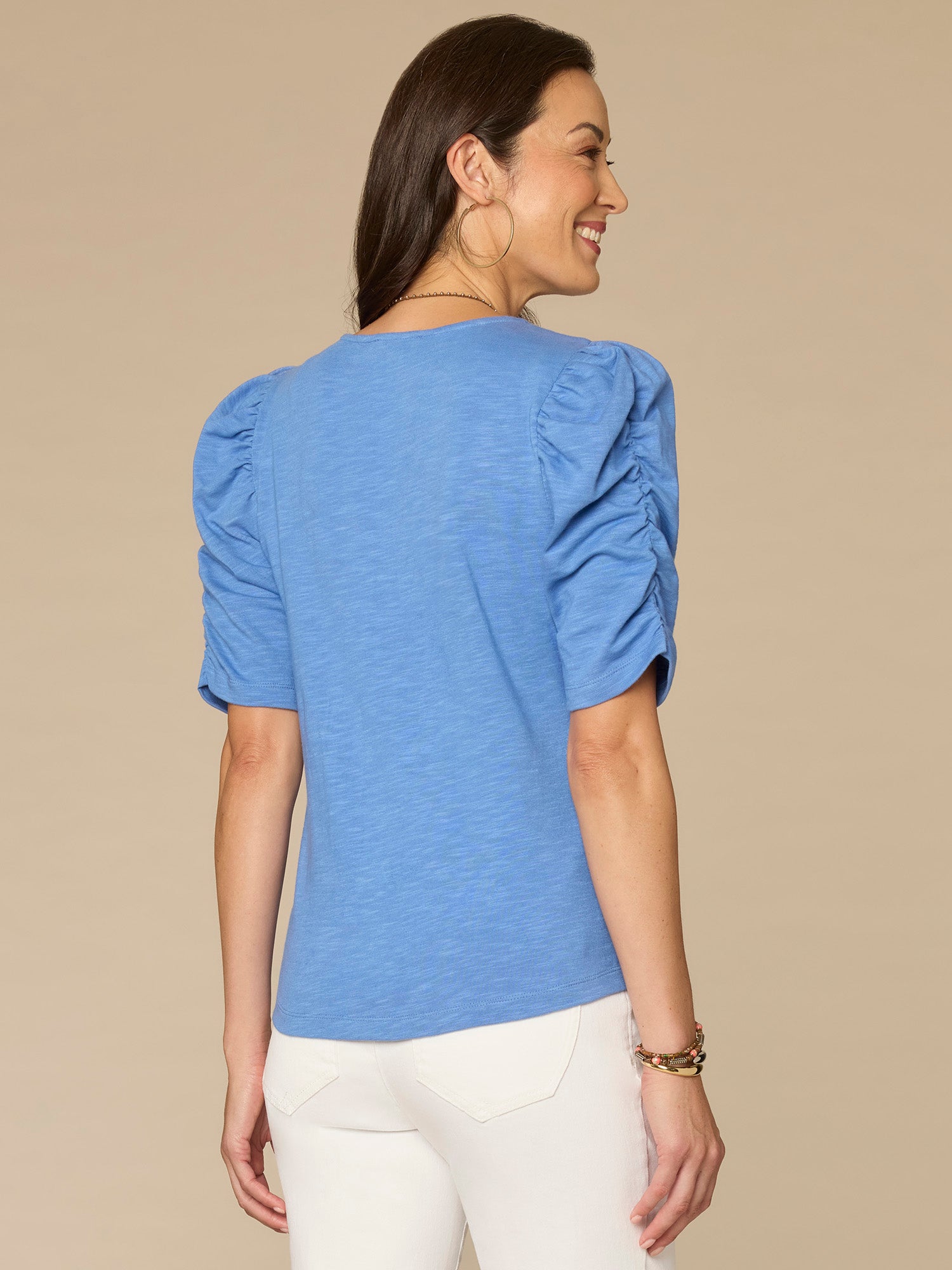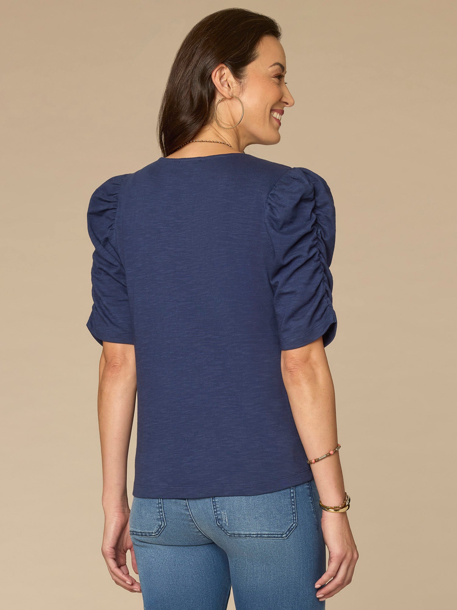 Elbow Shirred Puff Sleeve V-Neck Ruched Front Knit Top