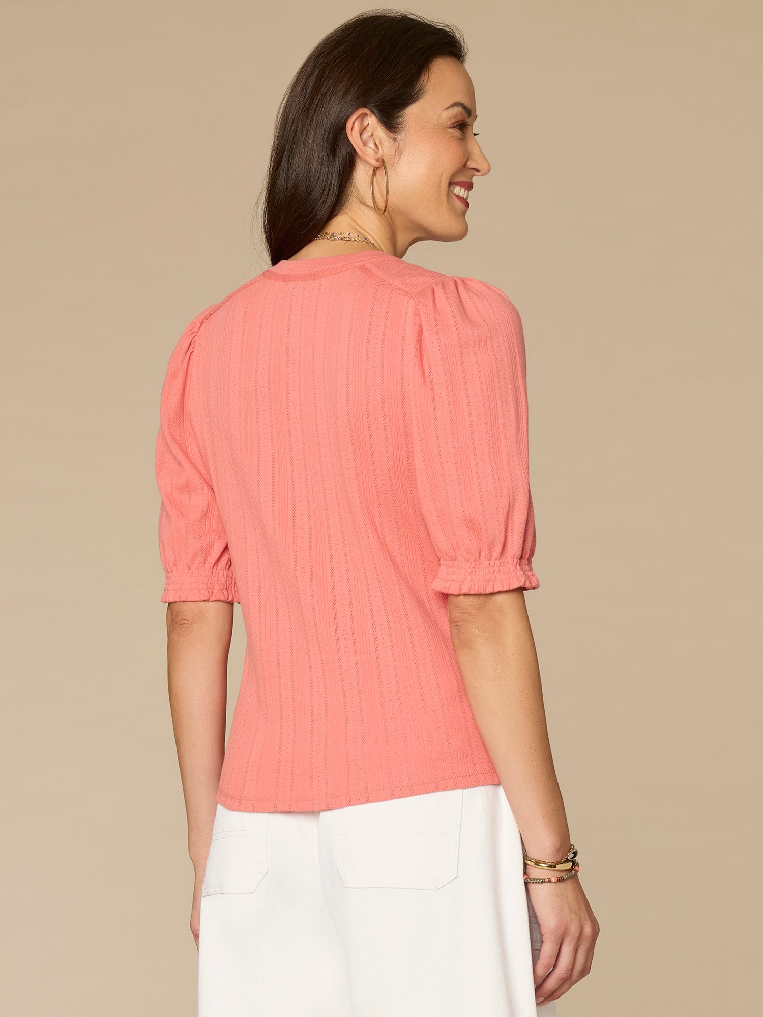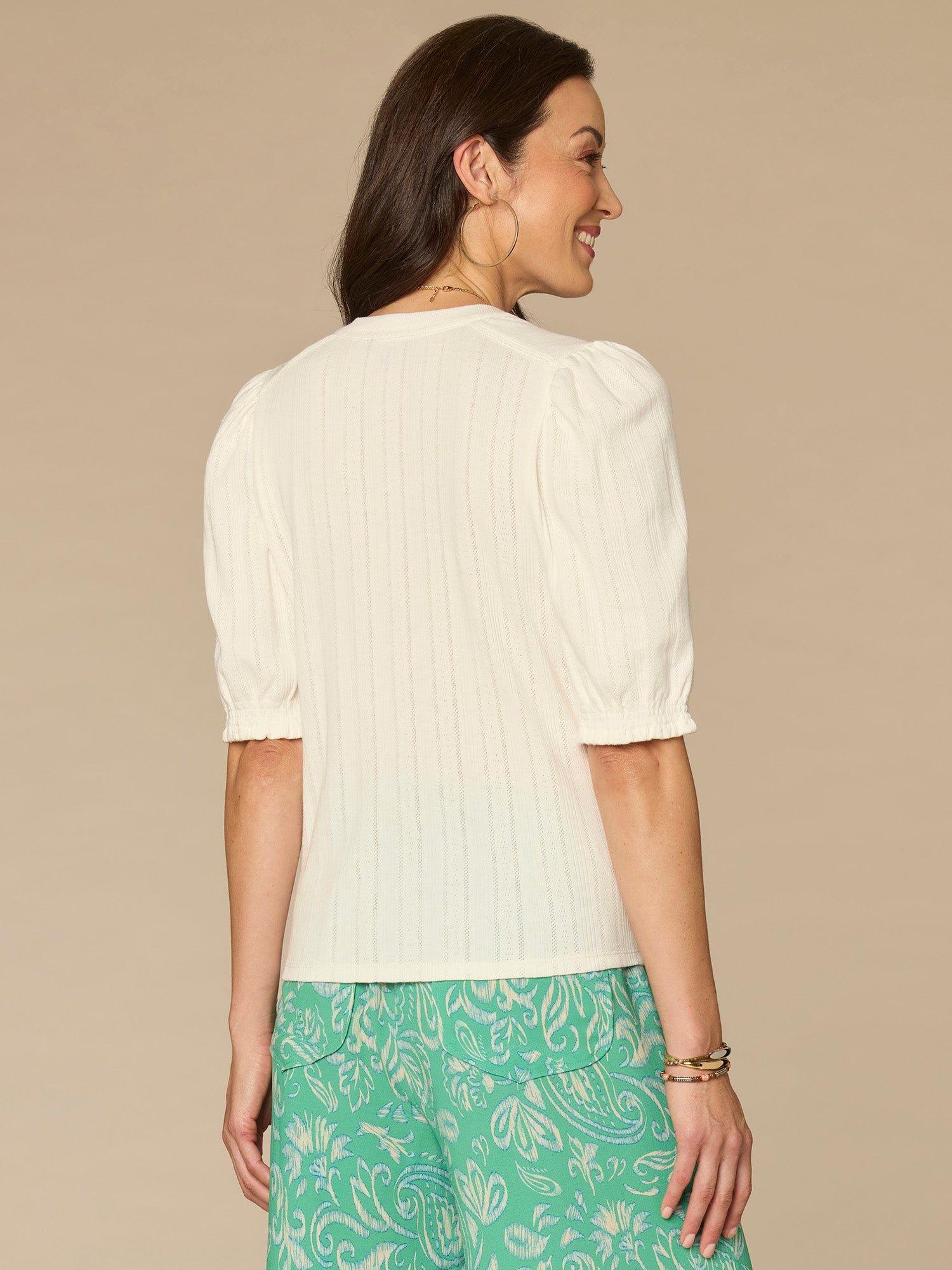 Elbow puff sleeves, a mandarin collar, and embroidery make this petite knit top an instant classic. Due to the slightly sheer, open work fabric, you may want to style it with a layer underneath.