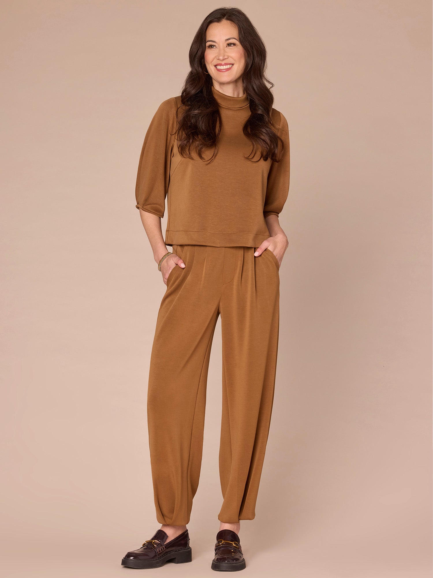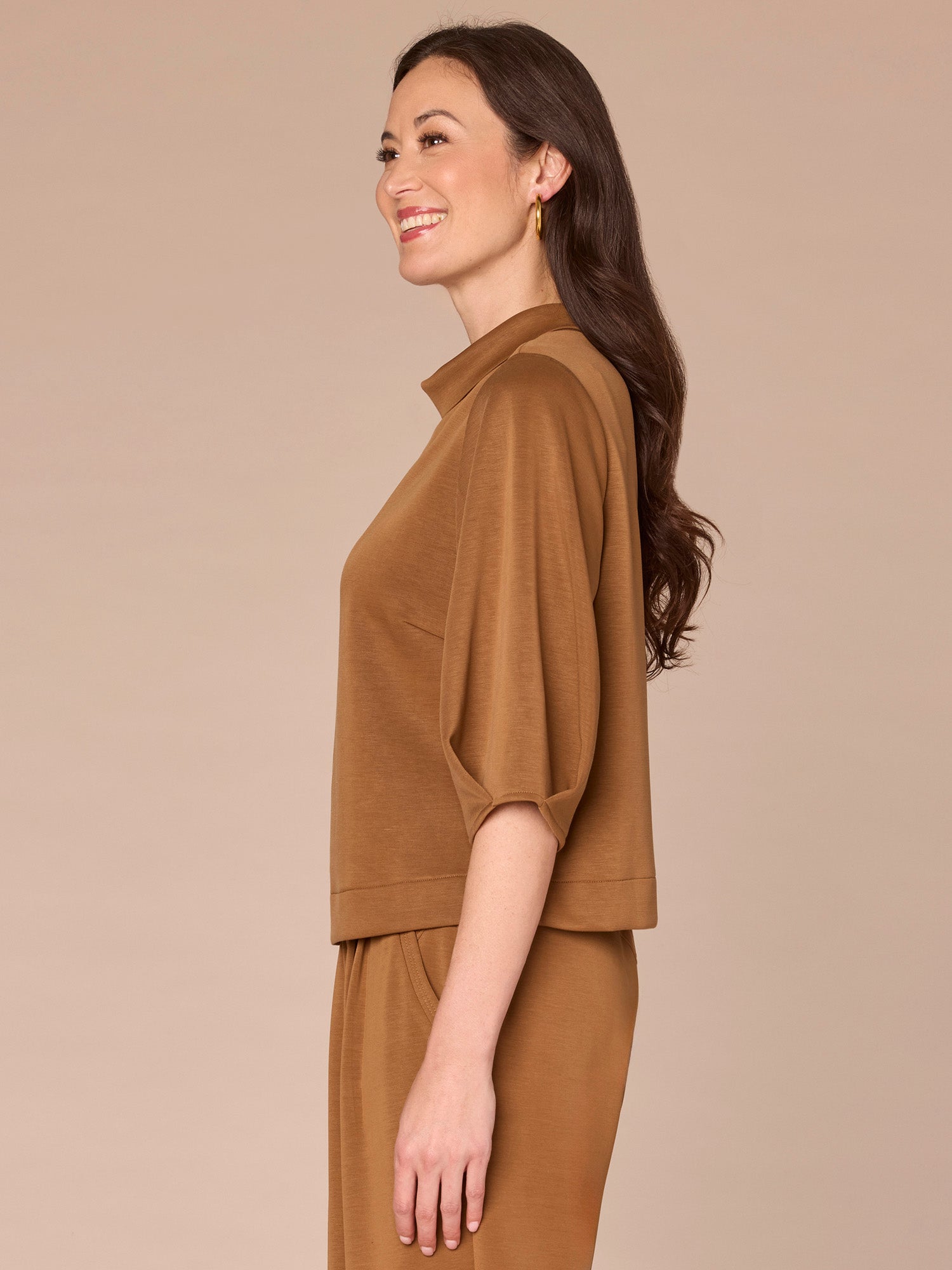 Sleek, chic, and crafted for comfort, this petite knit top does it all. It features pleated elbow sleeves, a mock neck, and a straight cropped hem—designed in a nutmeg hue that matches our “Ab”leisure jogger.