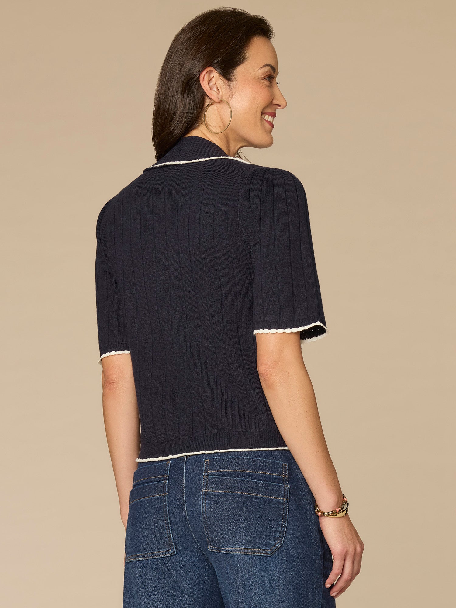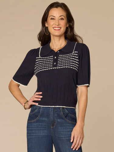 Elbow Sleeve Placement Stripe Placket Sweater with Scallop Tipping
