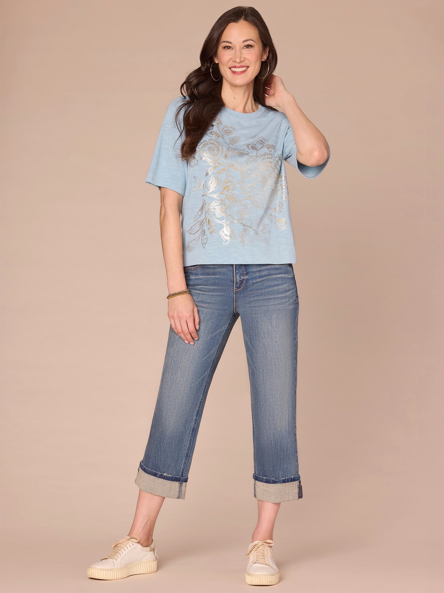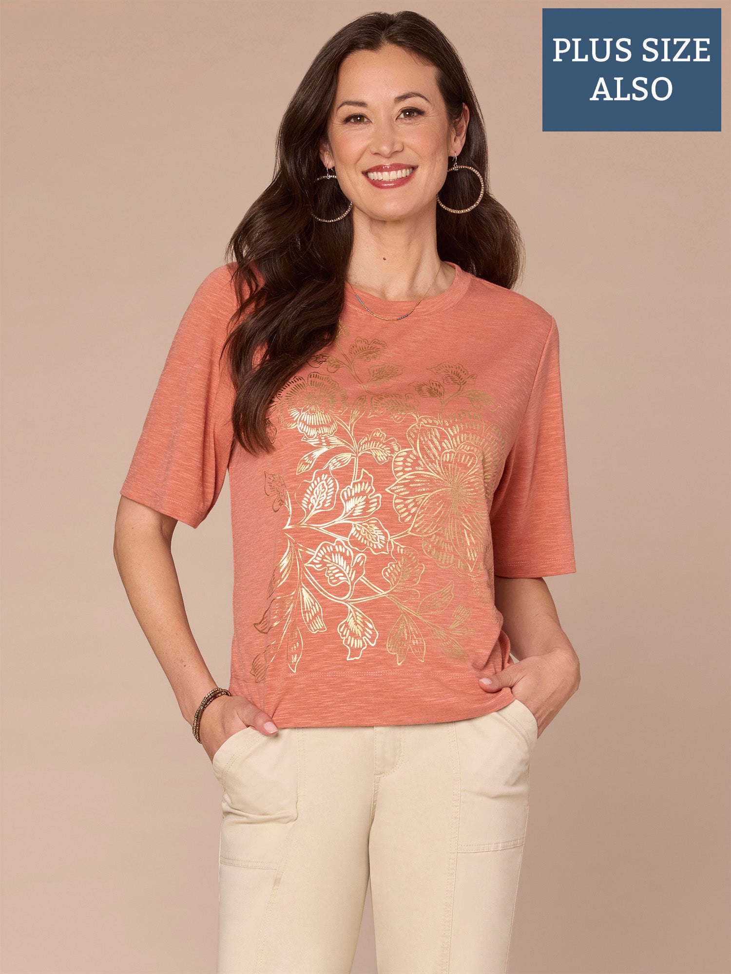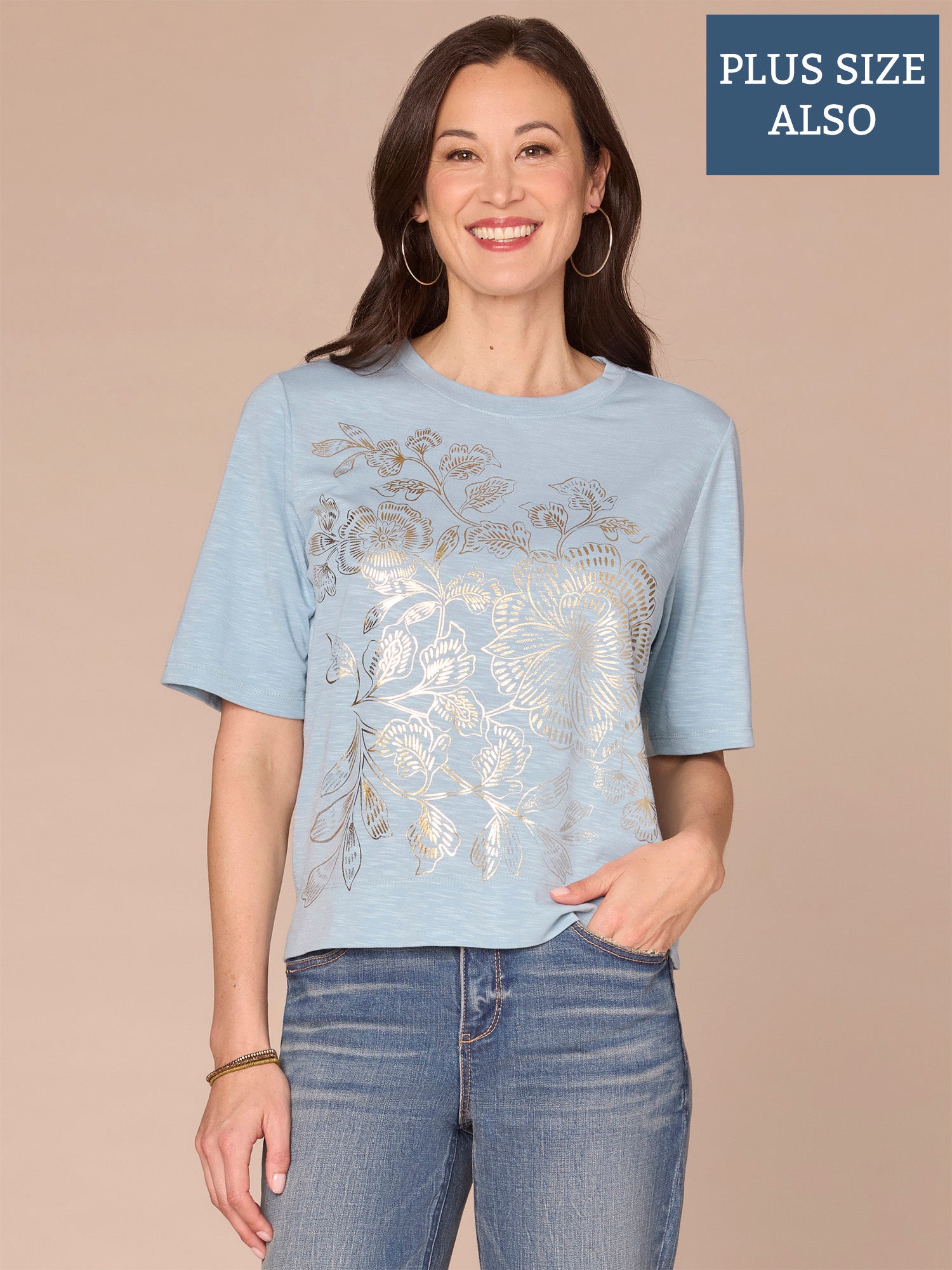 This easy knit top in plus sizing is designed with a scoop neck, elbow sleeves, and a floral fog foil screen print front. Available in two eye-catching hues that will pair perfectly with your favorite denim.
