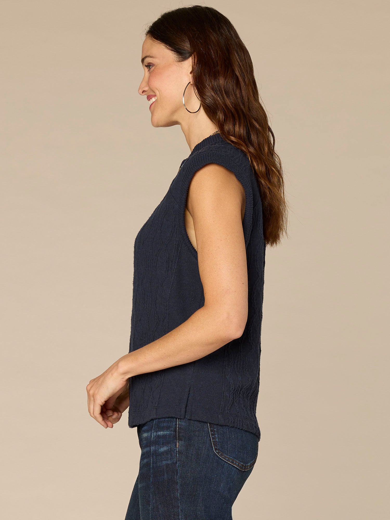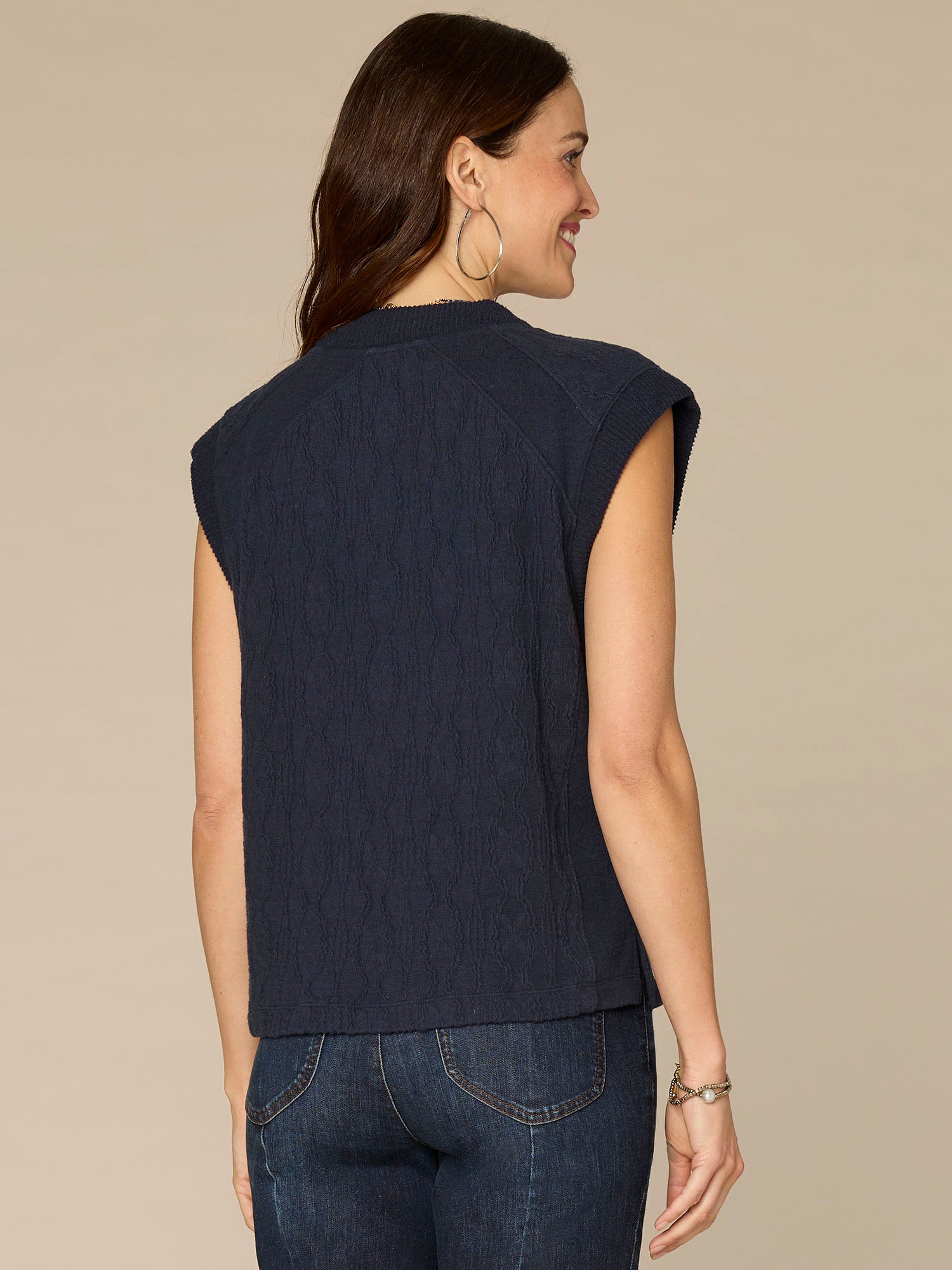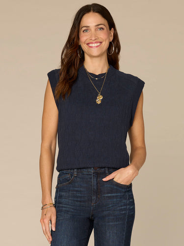 Simple, sleek, and a total staple, this mixed media knit top serves as the base for endless styling options. Its extended cap sleeves, crew neck, and carbon blue hue ensure it plays well with everything in your closet.