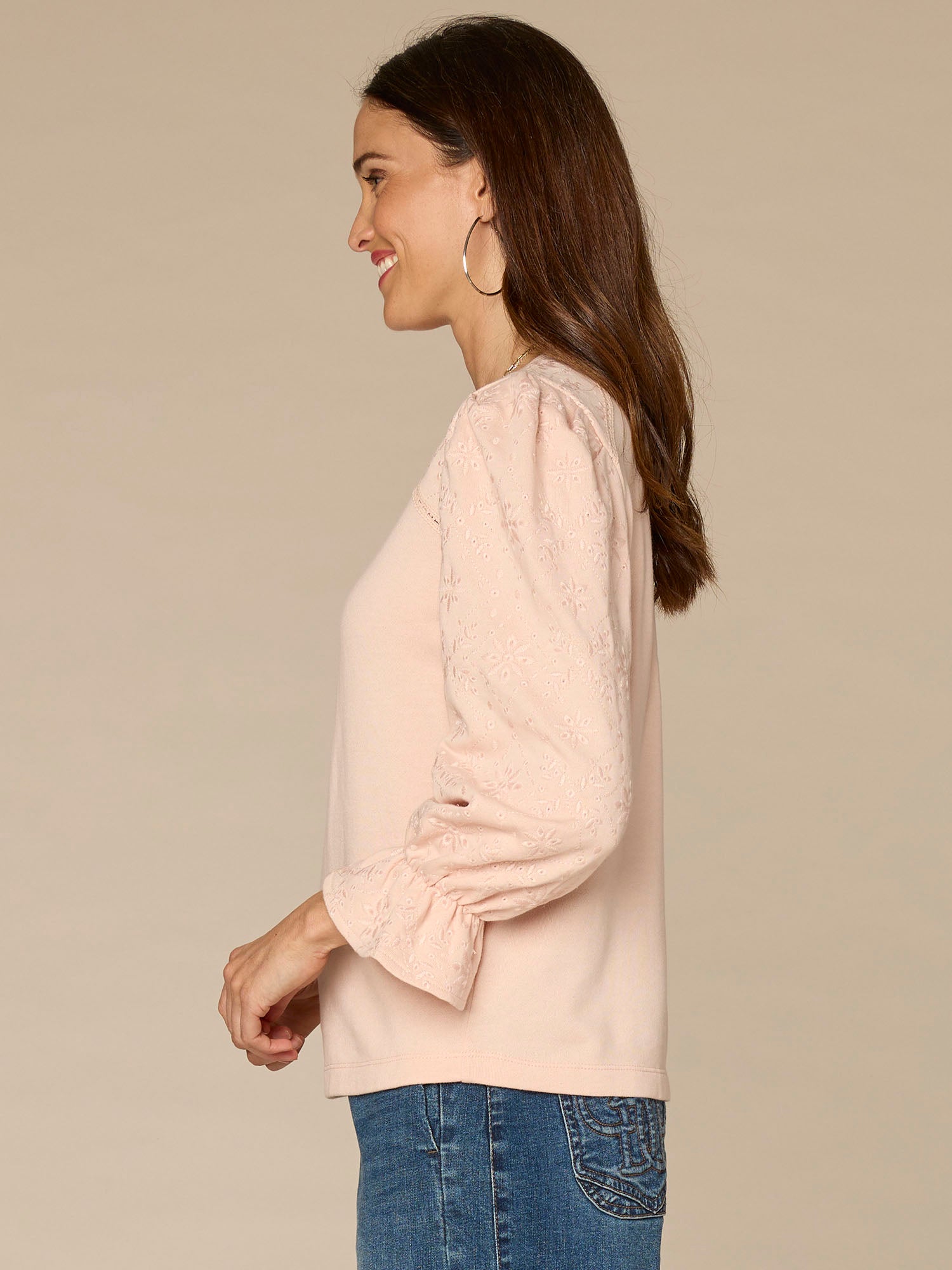 Take a knit sweatshirt but make it feminine. That’s what this versatile style does, thanks to its three quarter flounce sleeves, flattering scoop neck, and die cut embroidery.