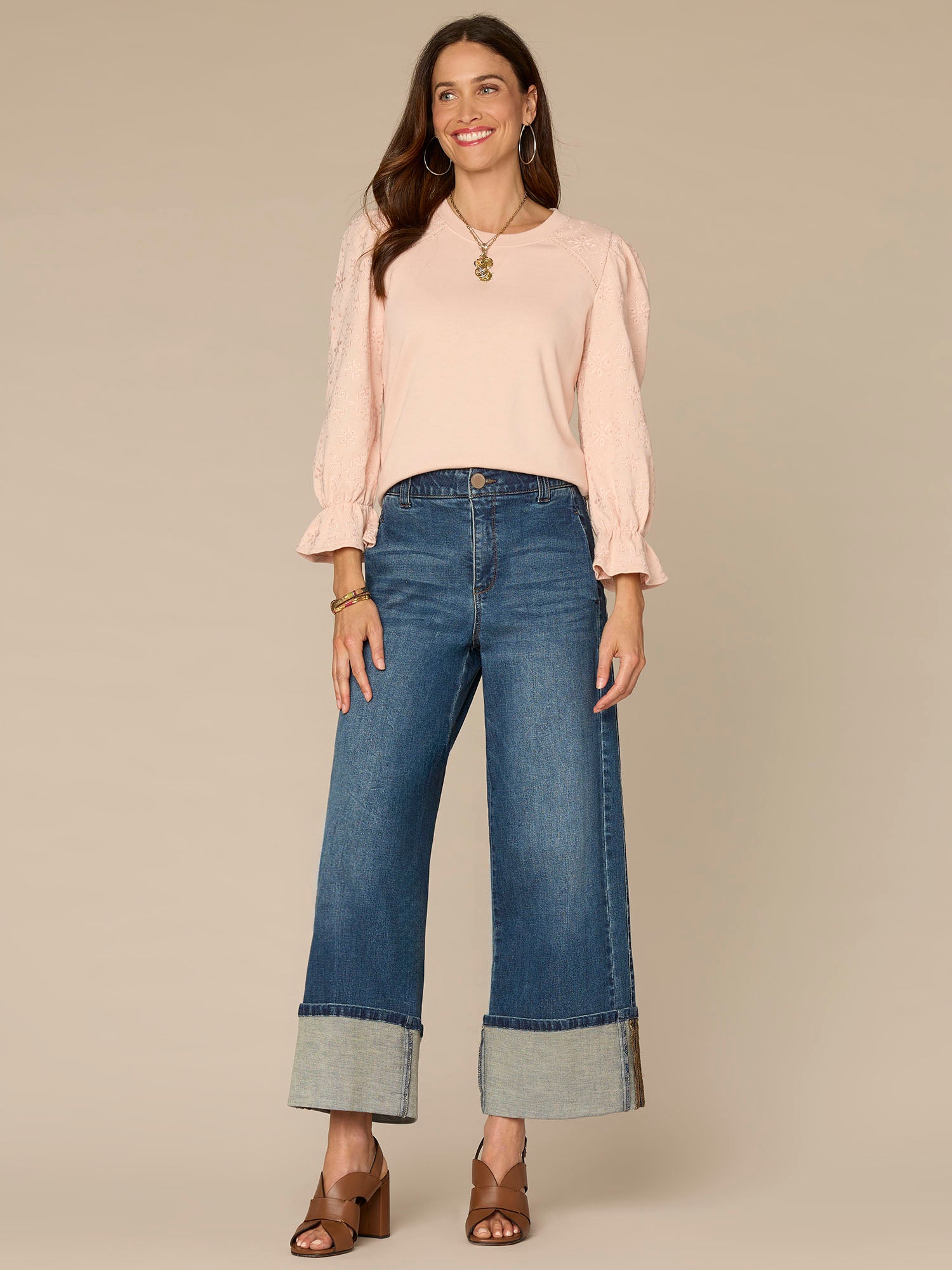 Take a knit sweatshirt but make it feminine. That’s what this versatile style in petite sizing does, thanks to its three quarter flounce sleeves, flattering scoop neck, and die cut embroidery.