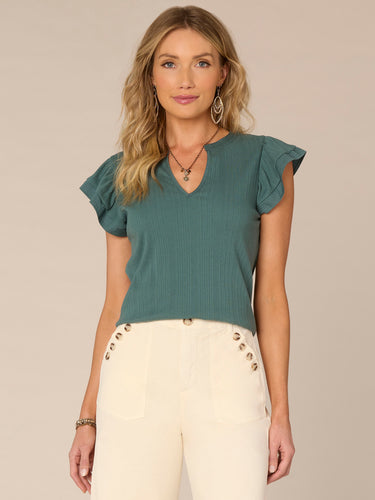 Flutter Cap Sleeve Split Neck Mixed Media Knit Top