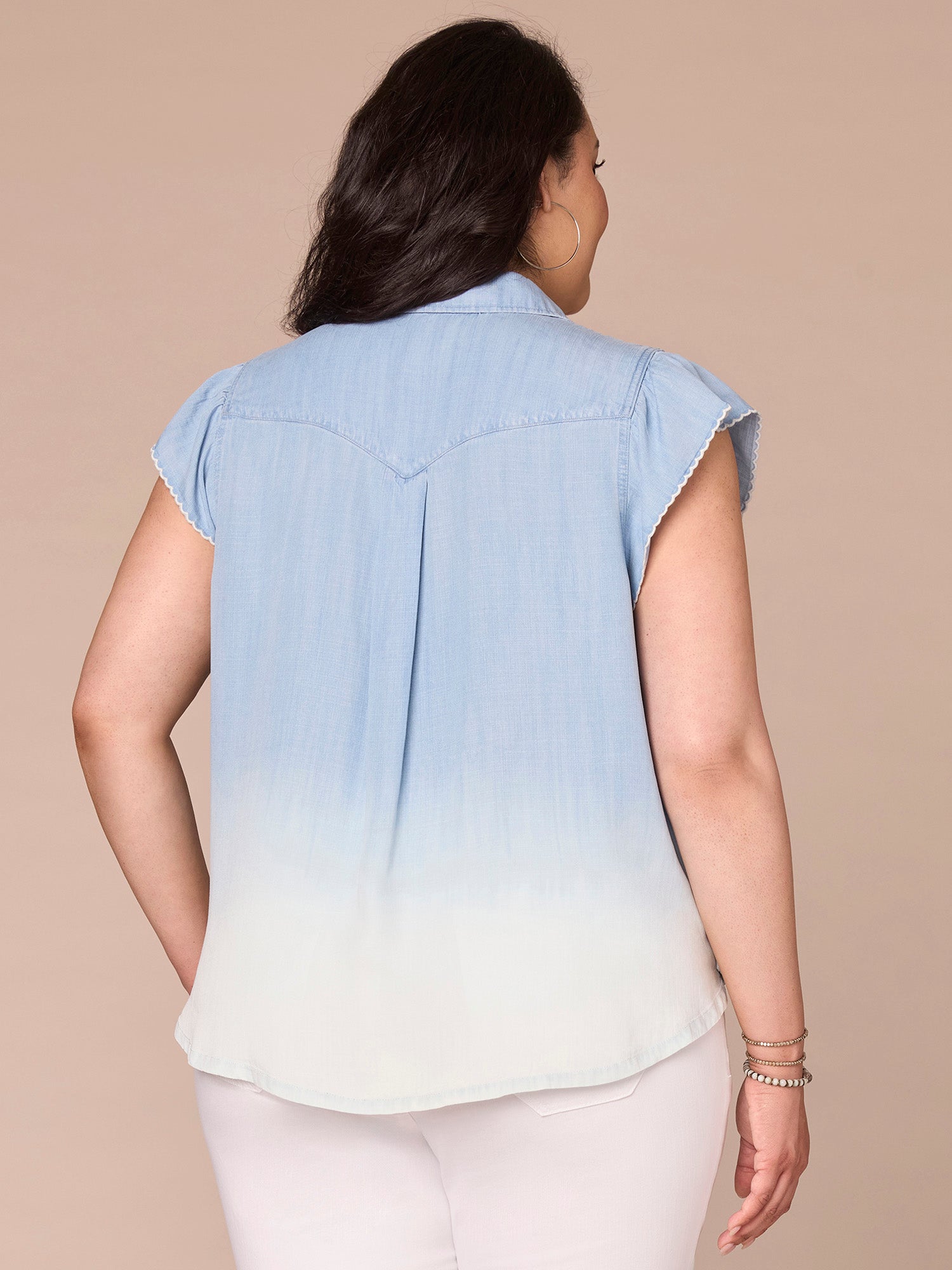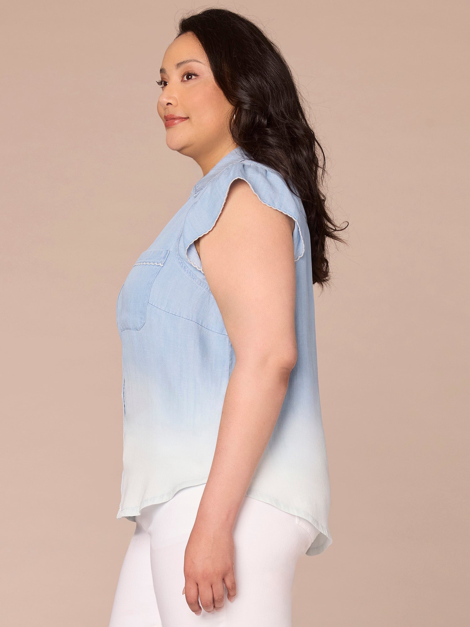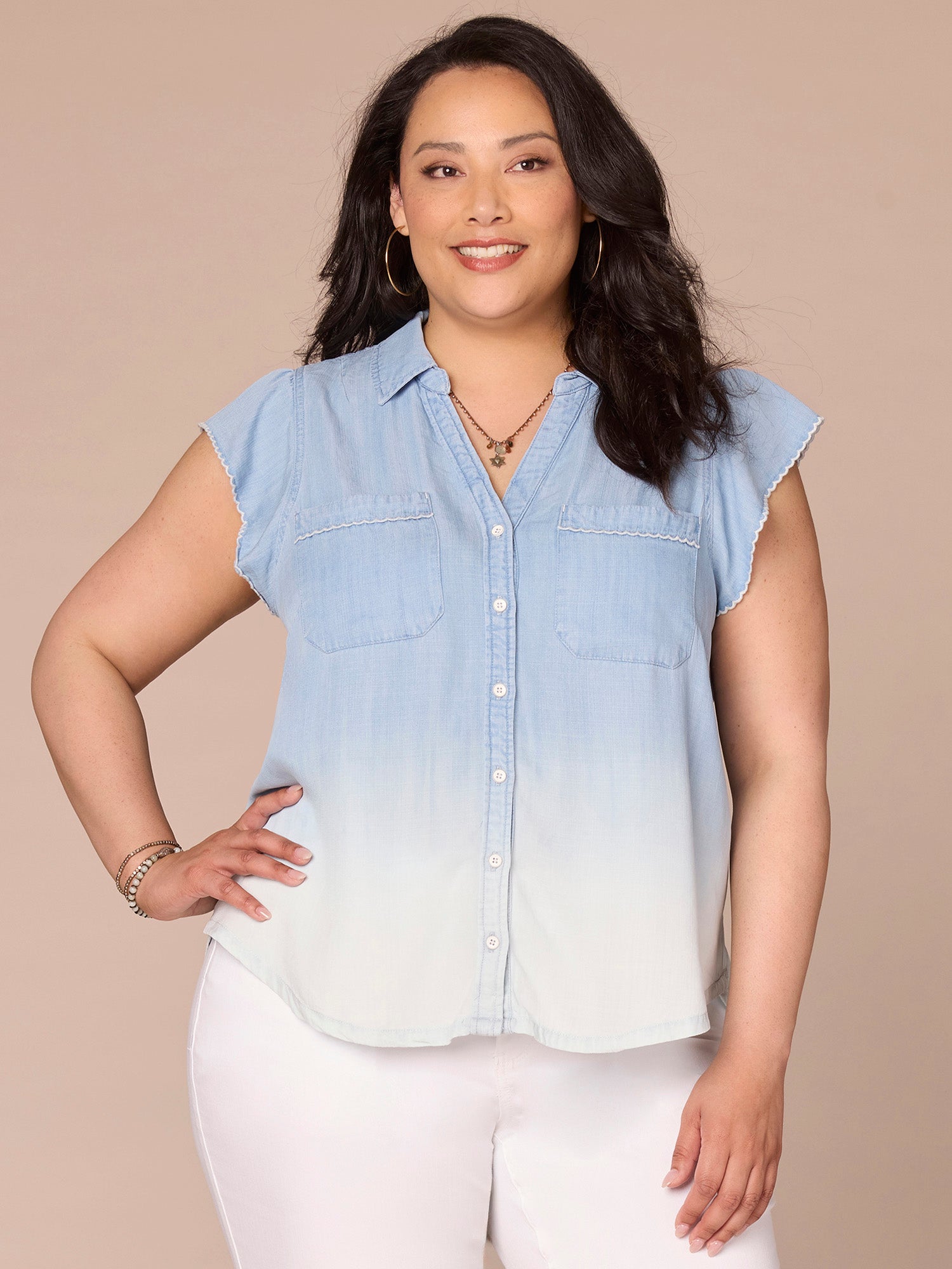 With fluttery cap sleeves, a collared V-neck, and scalloped trim, this woven button-down shirt in plus sizing brings a soft twist to a classic style. Additional design details include pockets, a color gradient, and a fit that layers beautifully.