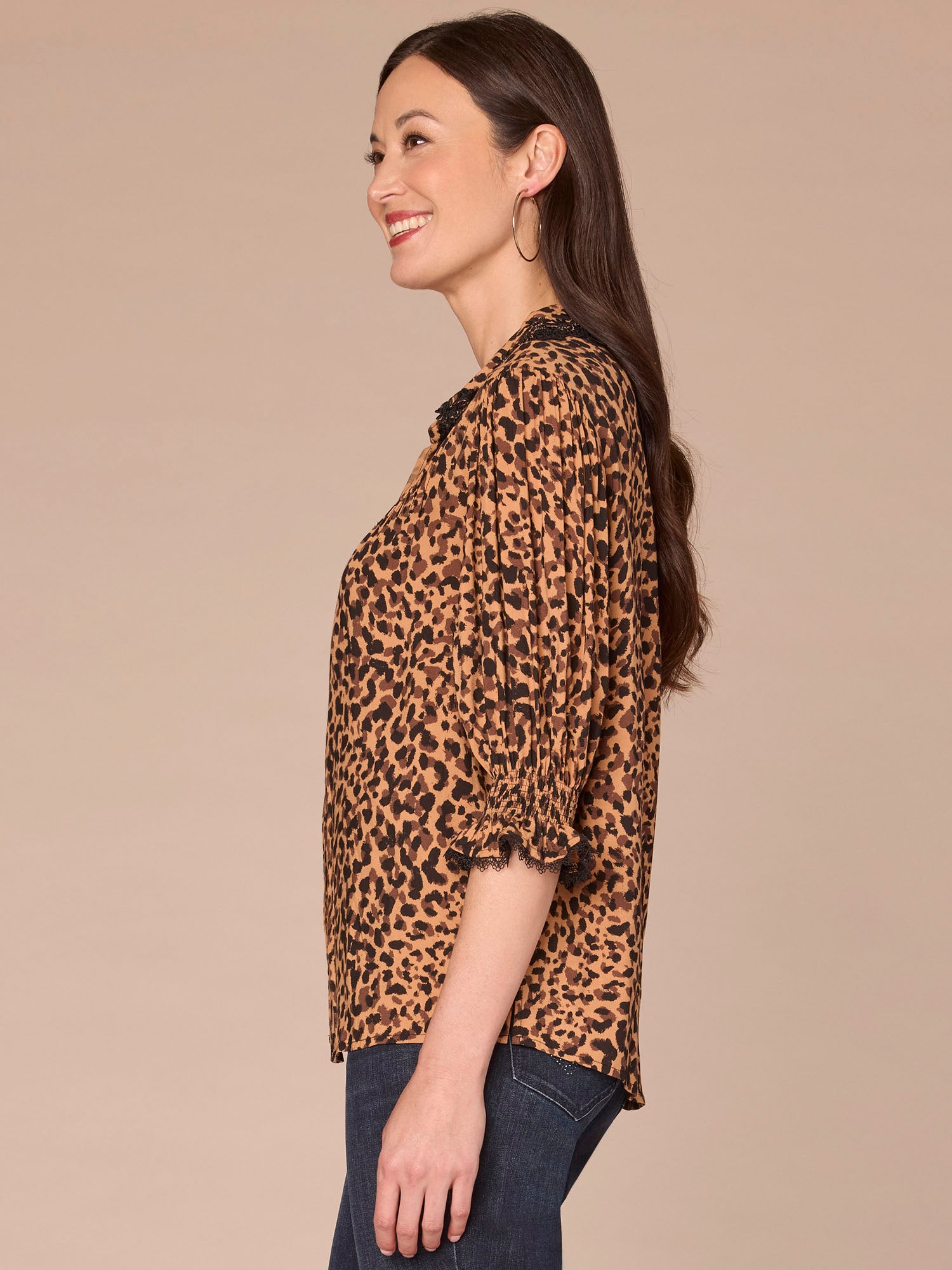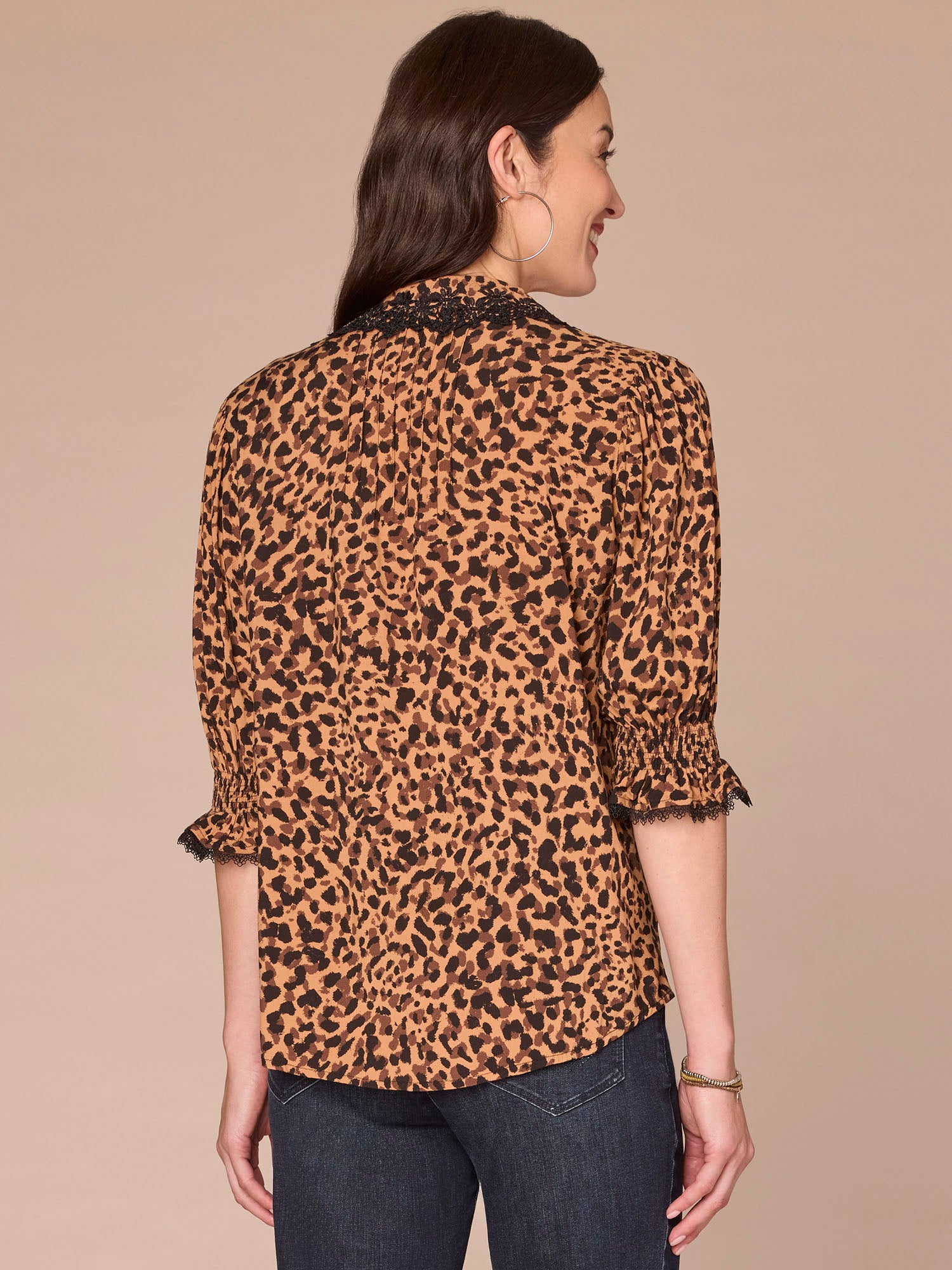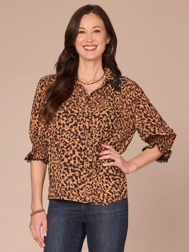 Dress things up a little with this woven button down shirt that’s a major vibe. It’s designed with below elbow lantern sleeves, a crochet collar, and an animal print.