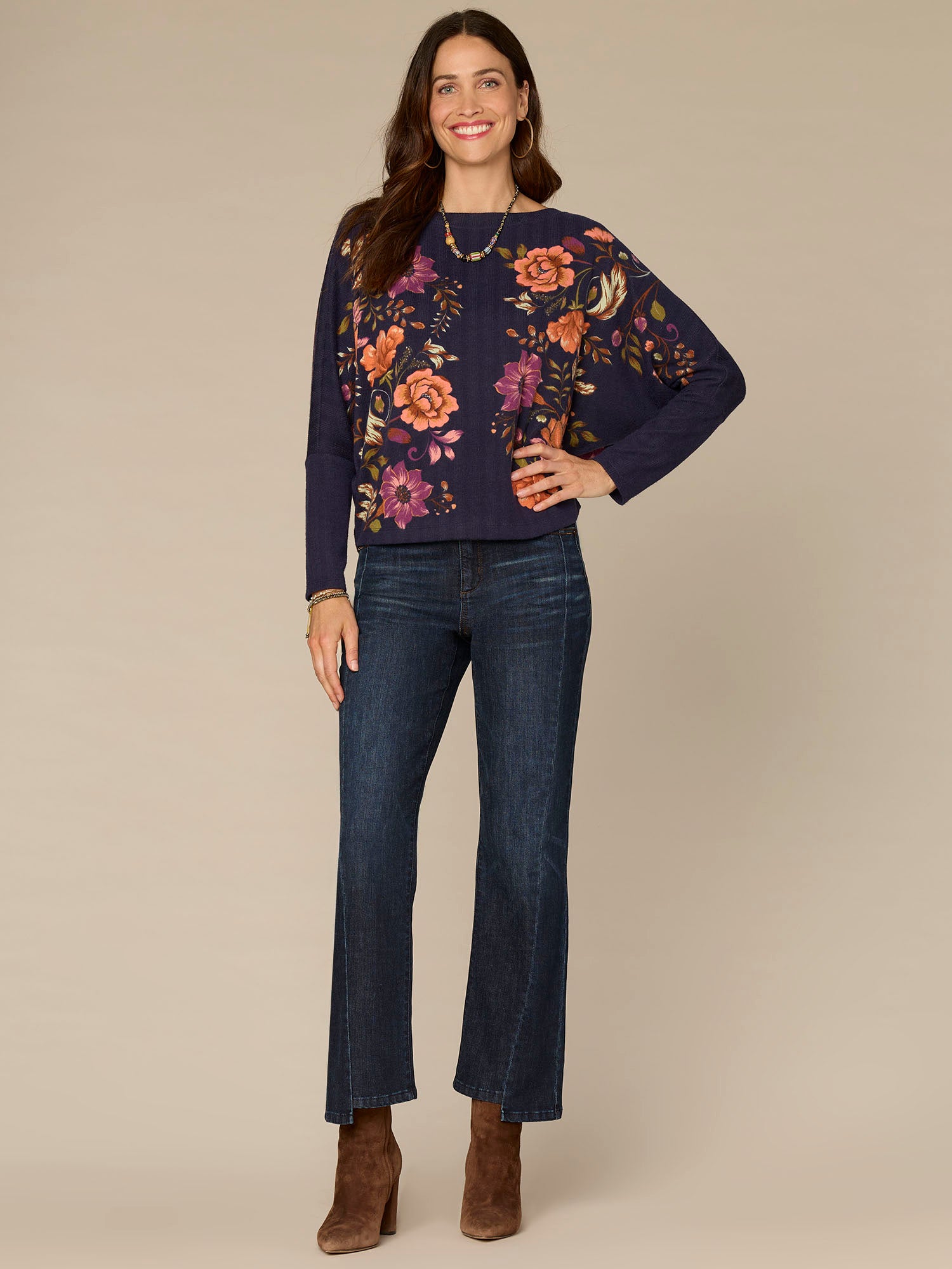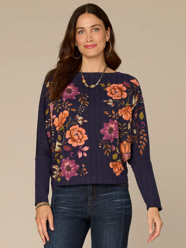 Long Batwing Sleeve Boat Neck Placement Floral Print Petite Knit Top