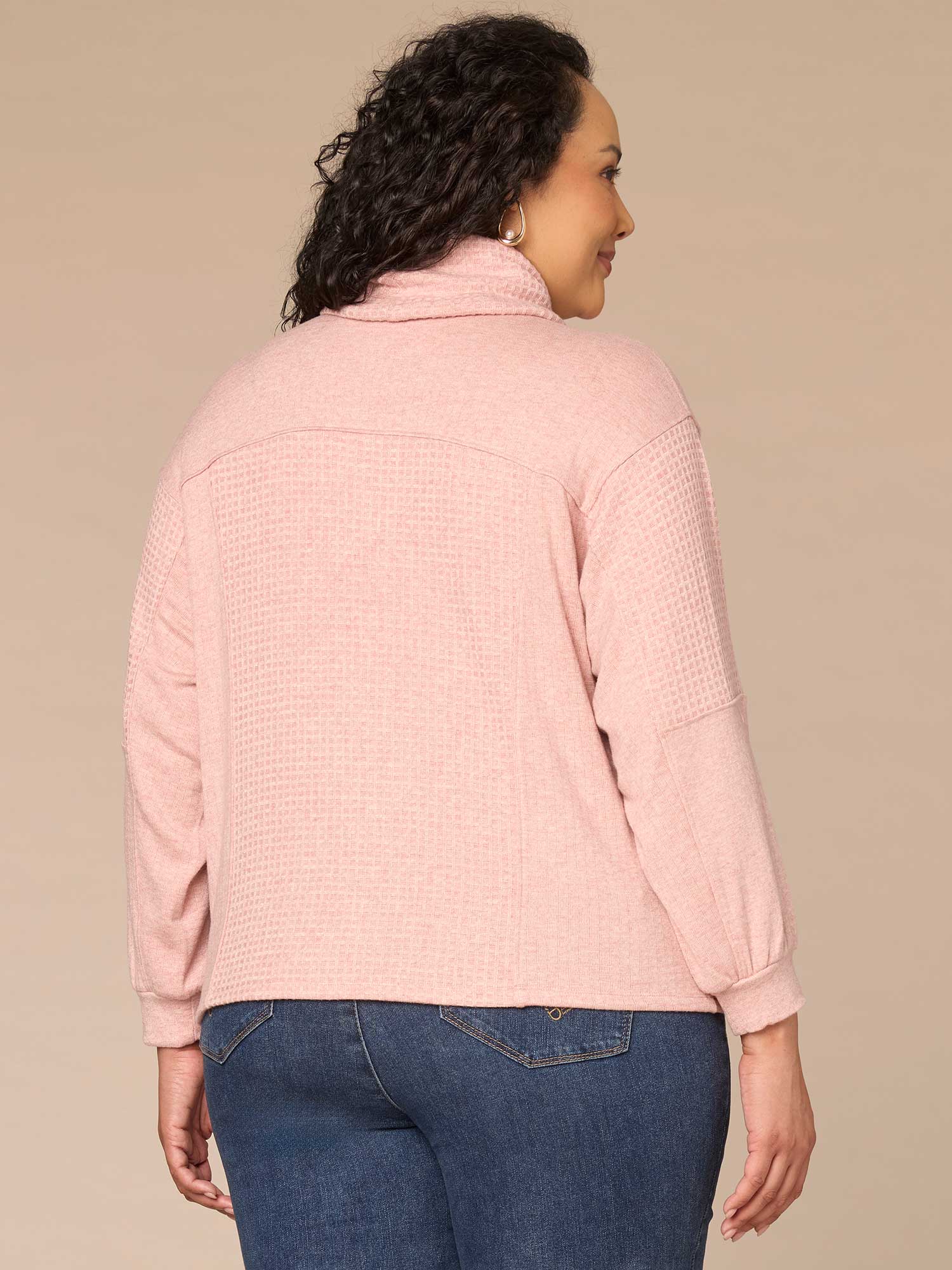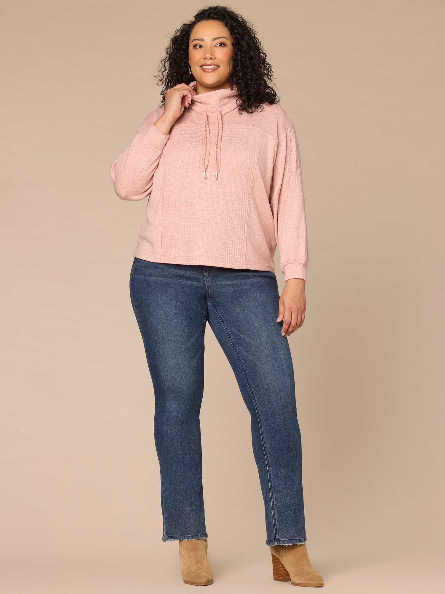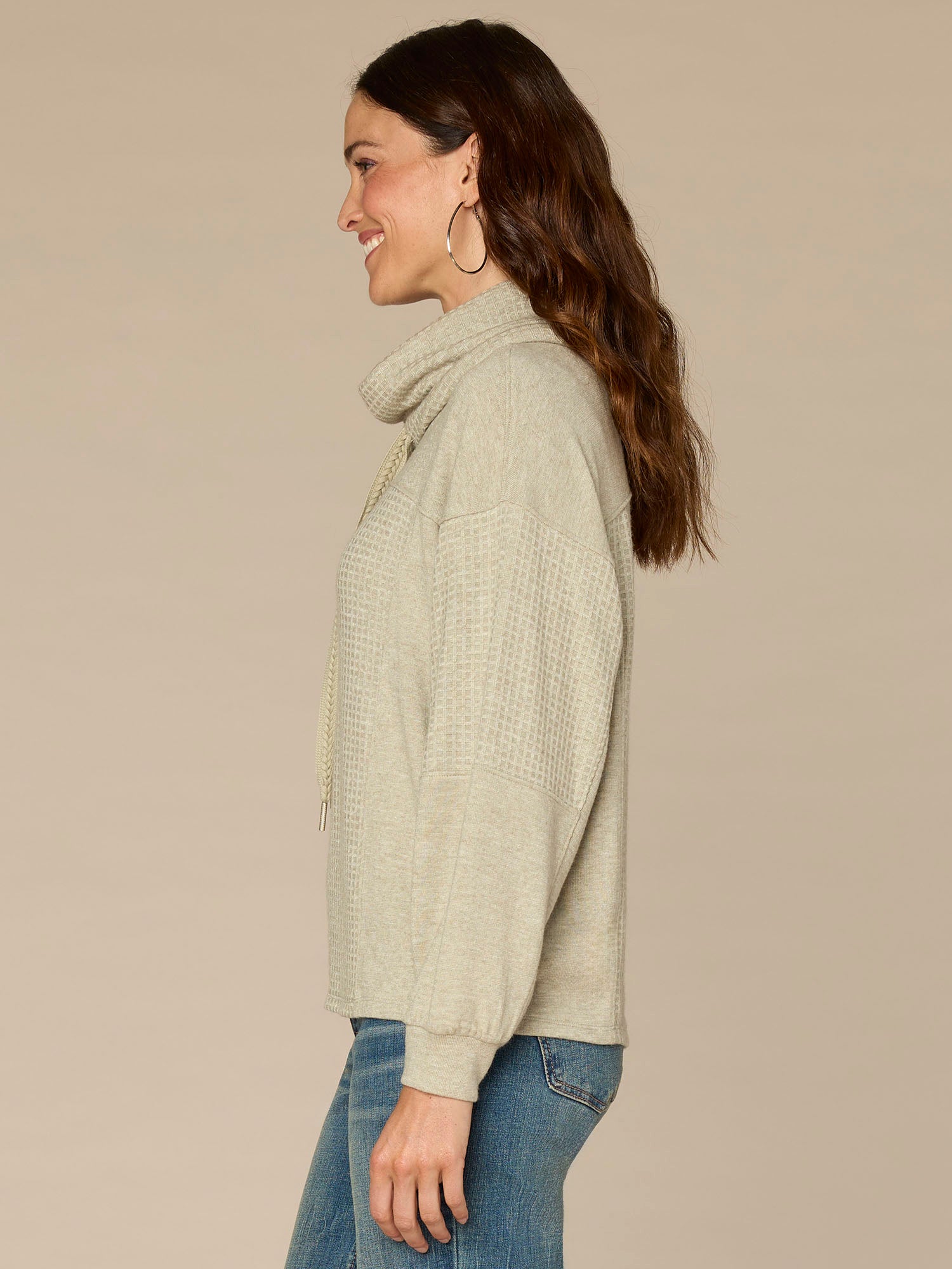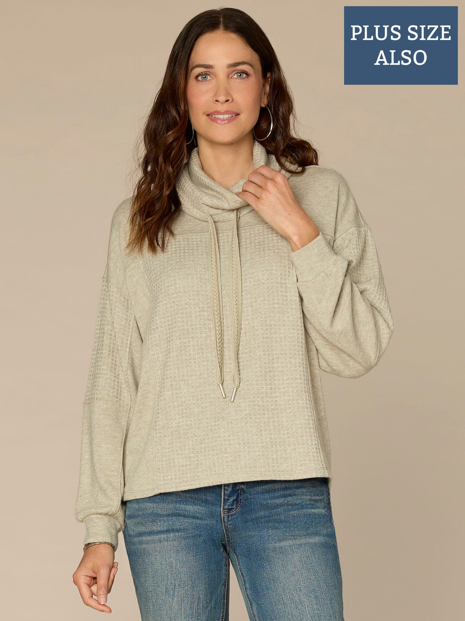 Long blouson sleeves, a cowl neck with ties, and seaming details ensure this plus-size mixed media knit top is as on-trend as it is comfortable. Slip into this style during breezy outdoor gatherings and days spent lounging at home.
