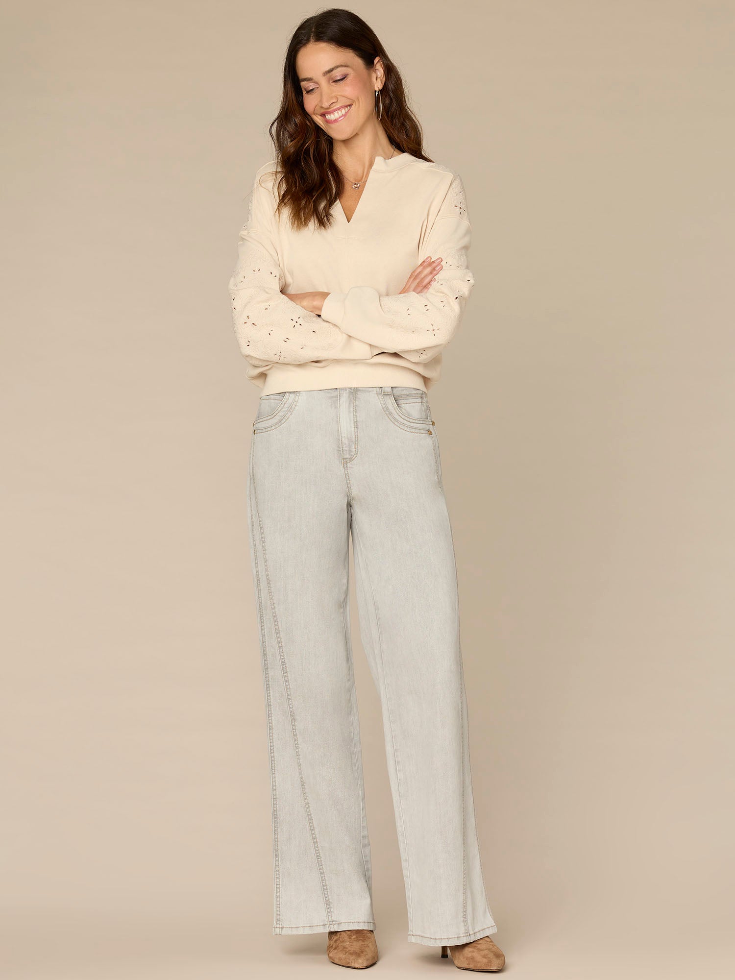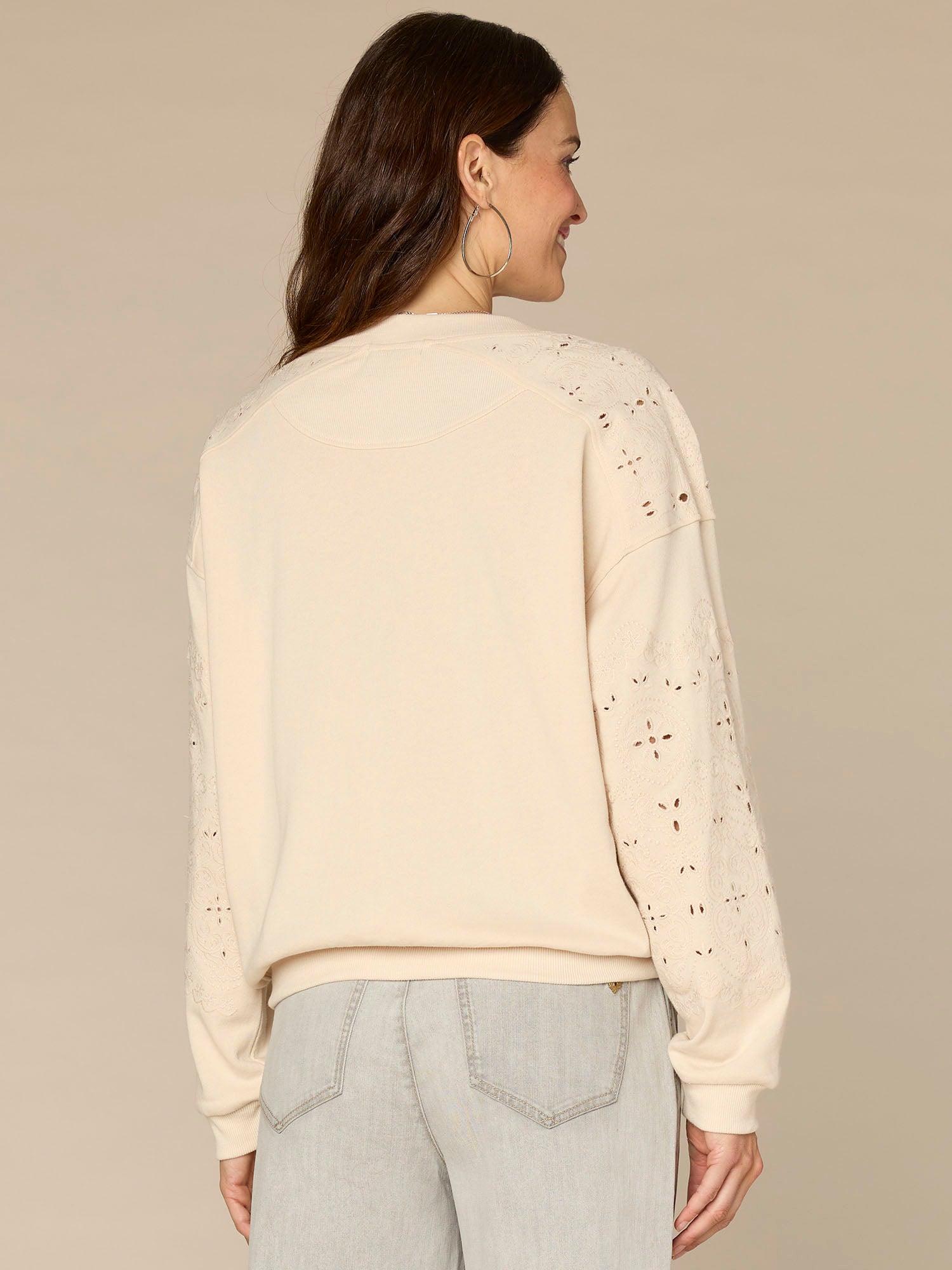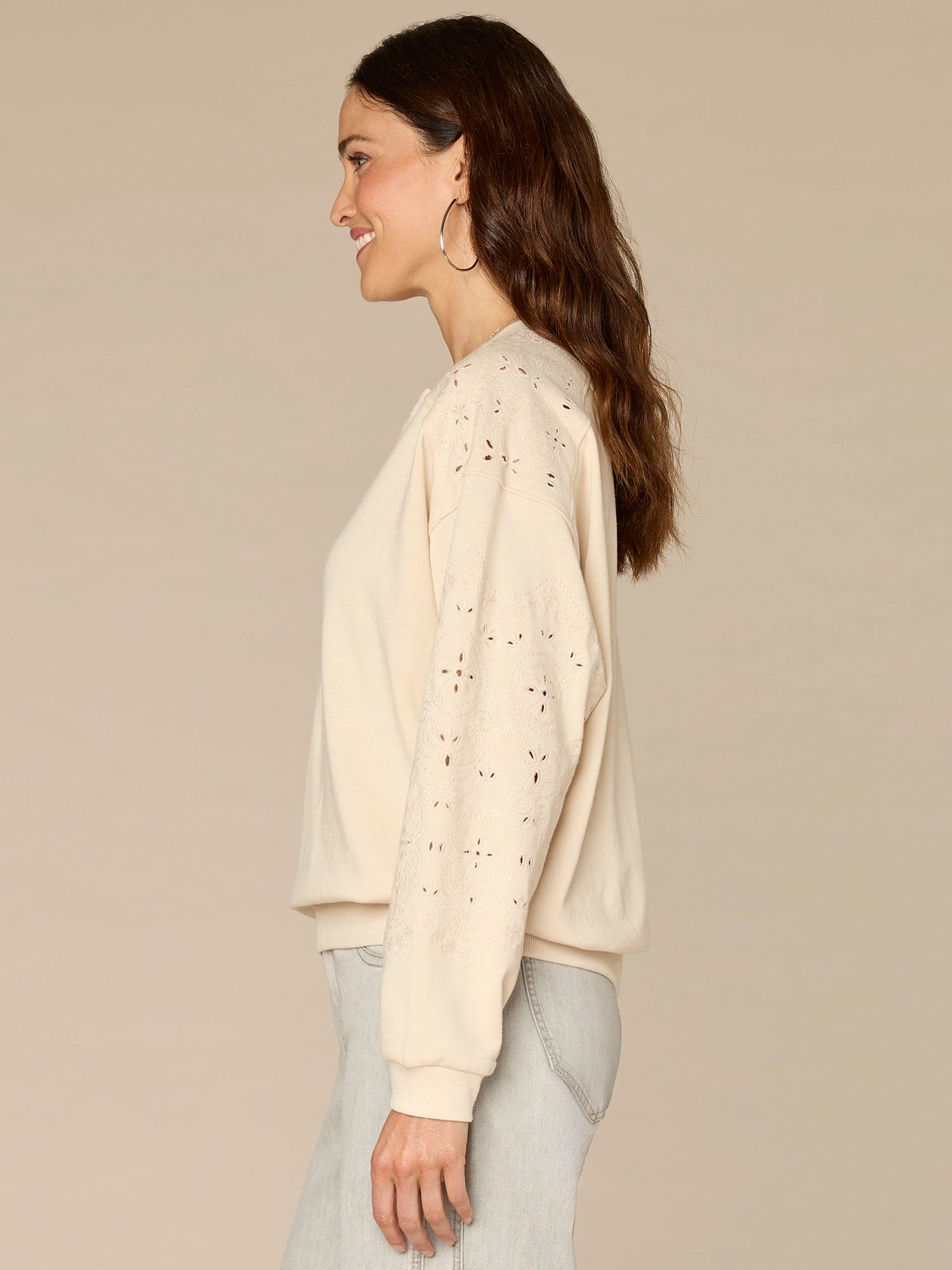 From brunch plans to chilly office days, this knit sweatshirt in petite sizing is as versatile as it is cozy. It has long blouson sleeves with die cut embroidery, a notch V-Neck, and seaming details.
