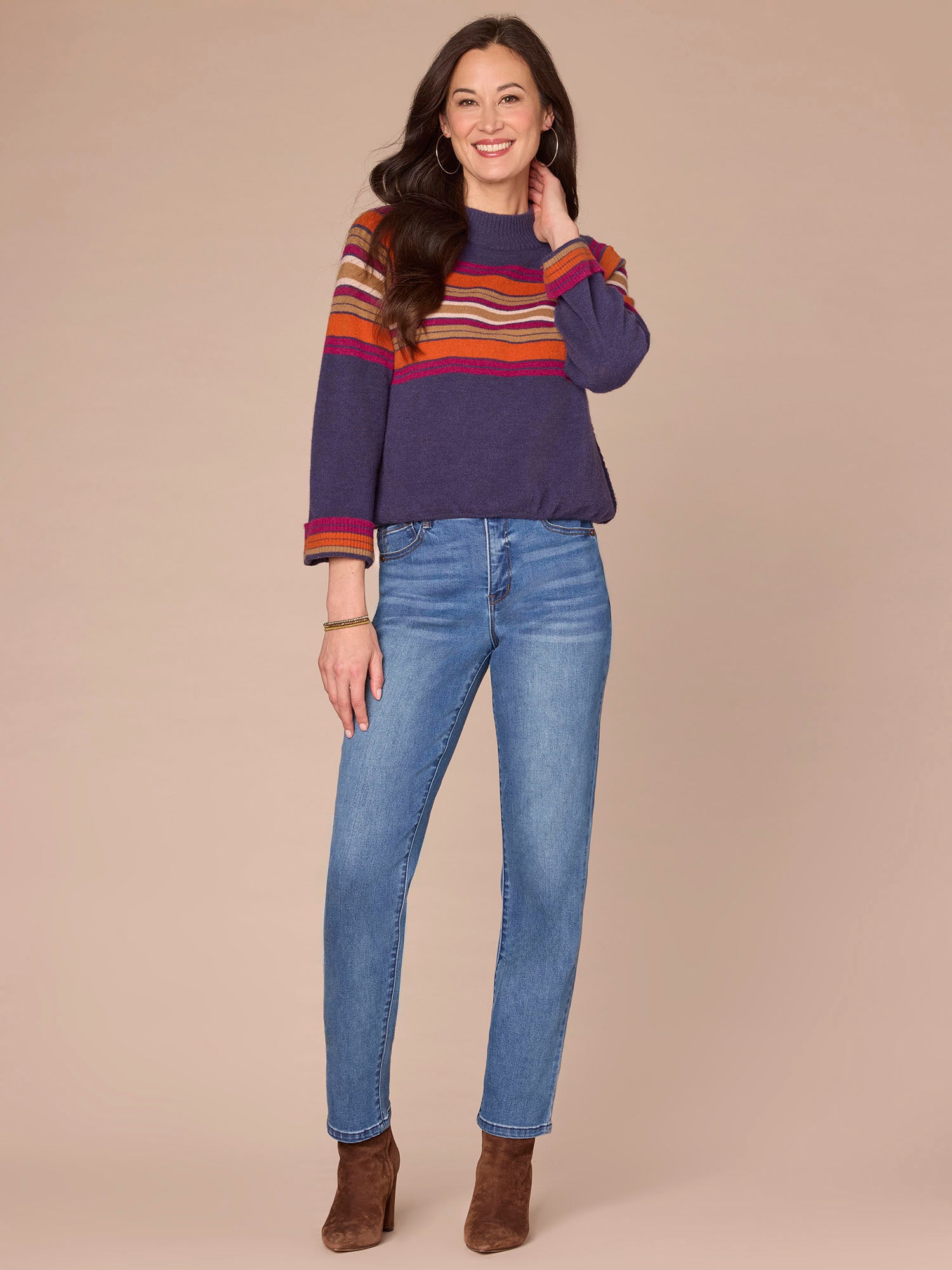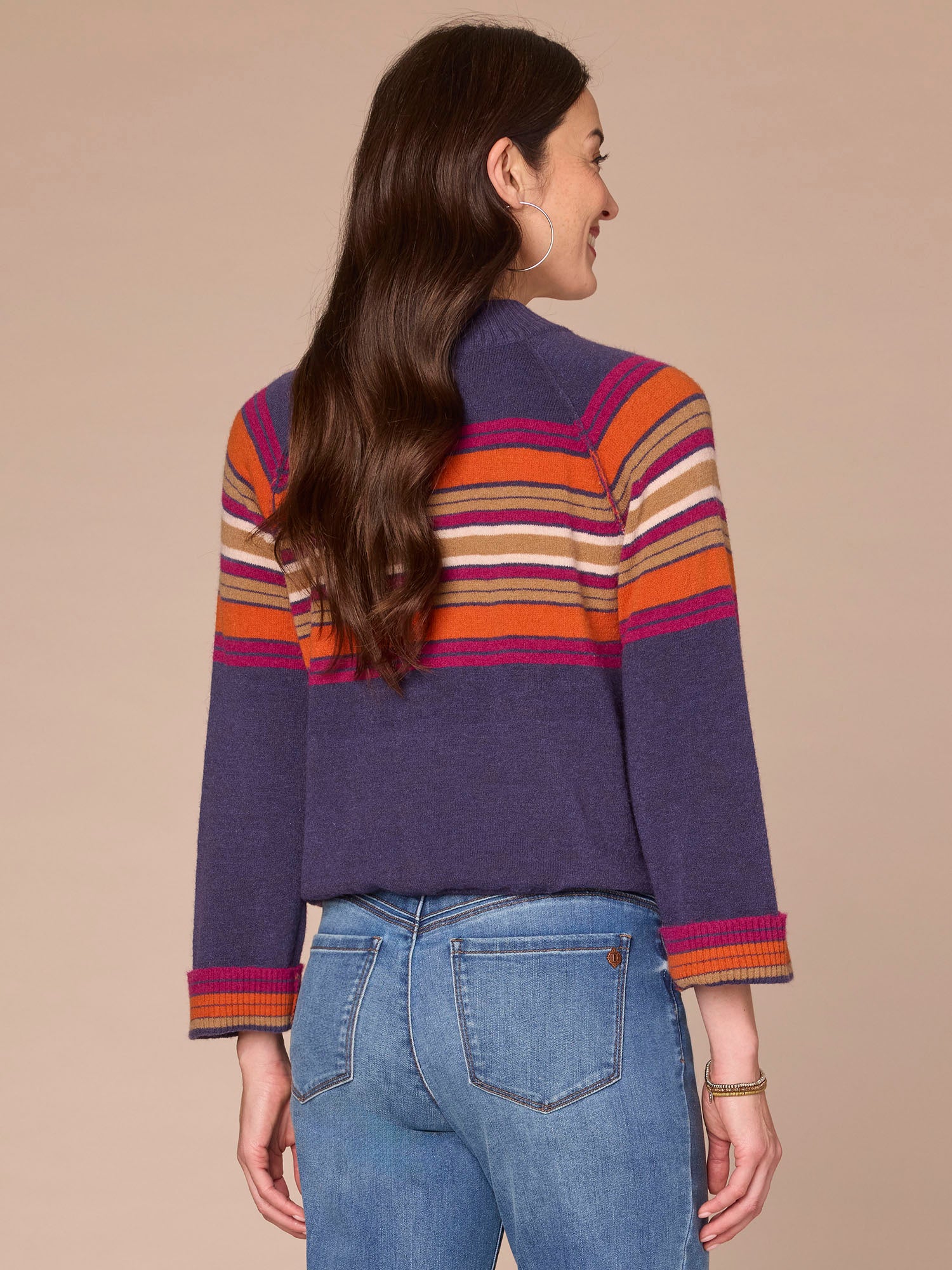 Long Cuffed Sleeve Mock Neck Bubble Hem Placement Stripe Sweater