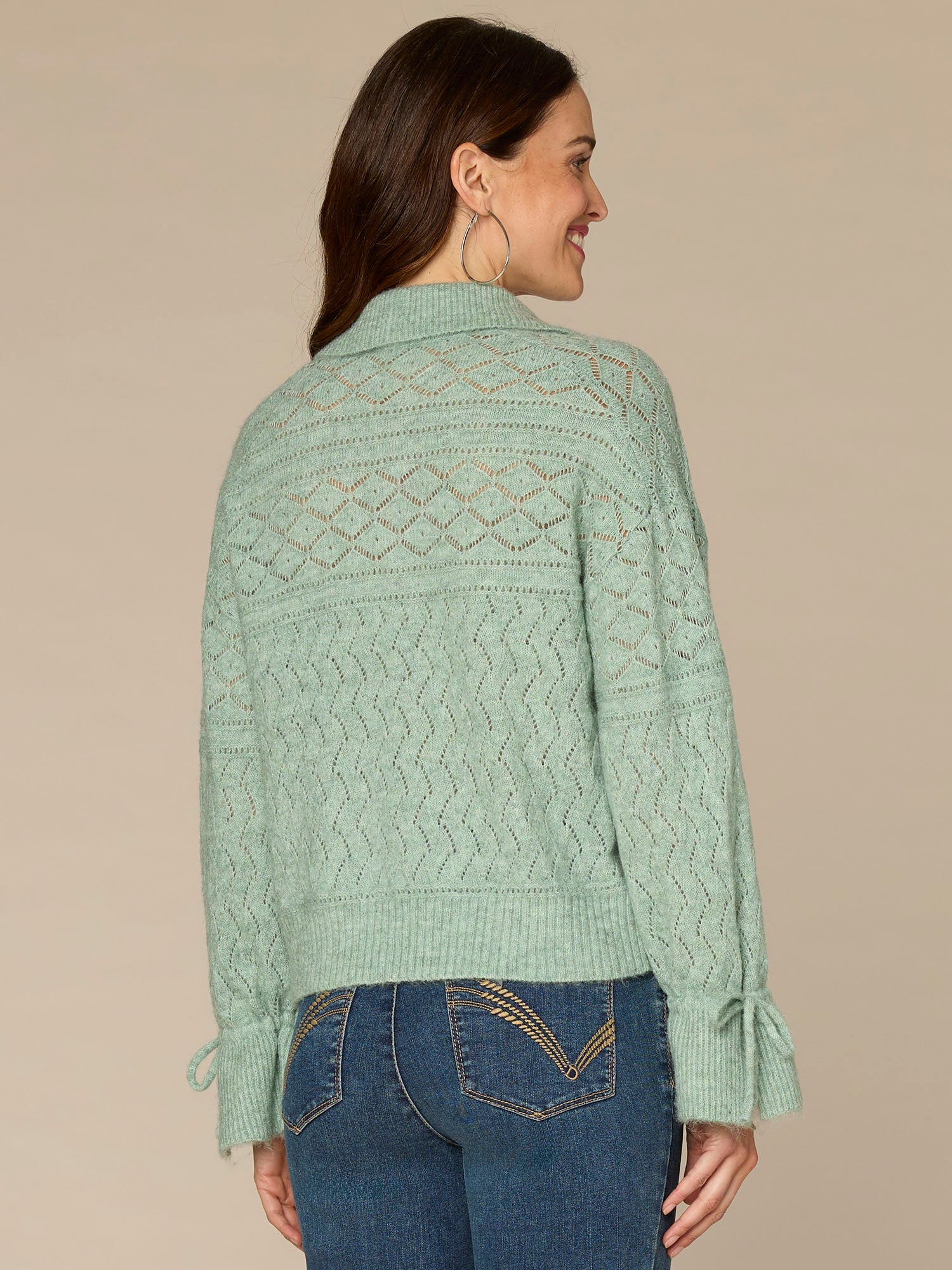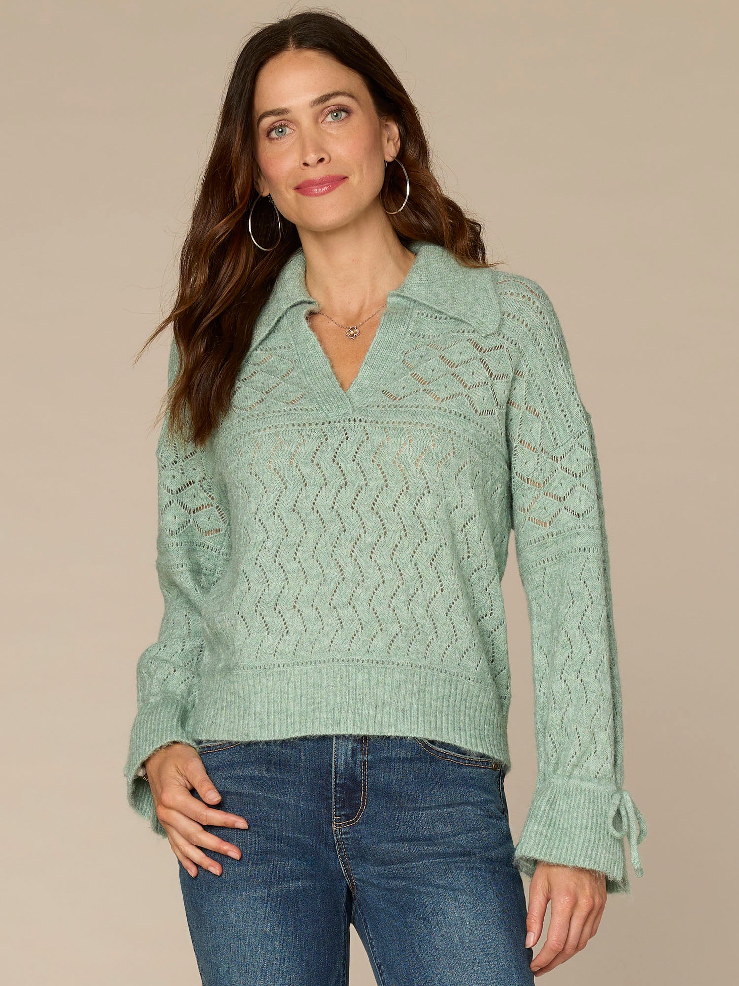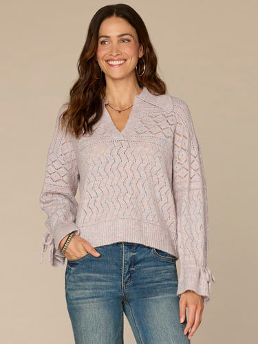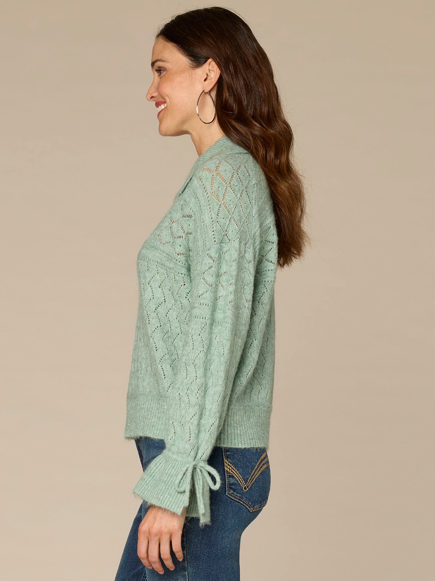 For when you want to look polished while feeling comfy, reach for this sweater. It has long flounce sleeves with ties, a V-neck collar, and a placement pointelle stitch design.